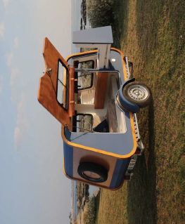 Approche environnementale : Mini-caravane fonctionnelle composée majoritairement de bois : un contre-plaqué marine. Nous avons choisi ce matériau pour ses qualités multiples : renouvelable et recyclable, résistant, isolant et naturellement esthétique. L’ensemble des textiles est issu d’une démarche de revalorisation. Equipée d’un panneau solaire : une source d’énergie inépuisable et d’un éclairage LED pour une consommation d’énergie raisonnée. Format compact donc consommation de carburant minimum lors des déplacements. Ses dimensions nous on permis d’optimiser au mieux la matière : pas de gaspillage !Fabrication locale.