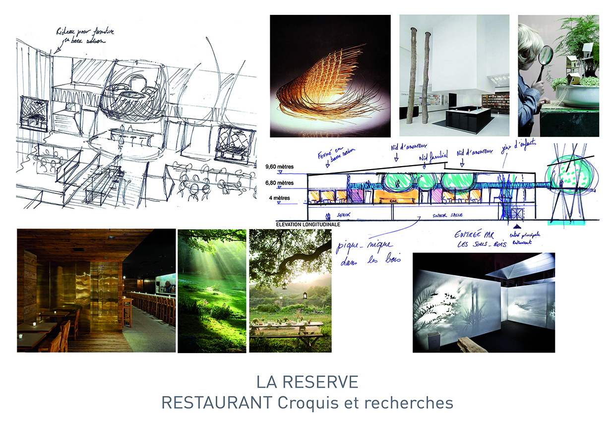Approche environnementale : L’utilisation de matériaux à l’aspect brut tels que le chêne naturel brossé, le bois noirci, le cuivre patiné, la lave émaillée et la pierre polie fait écho à la situation exceptionnelle du restaurant et lui permet de se fondre parfaitement dans son environnement.