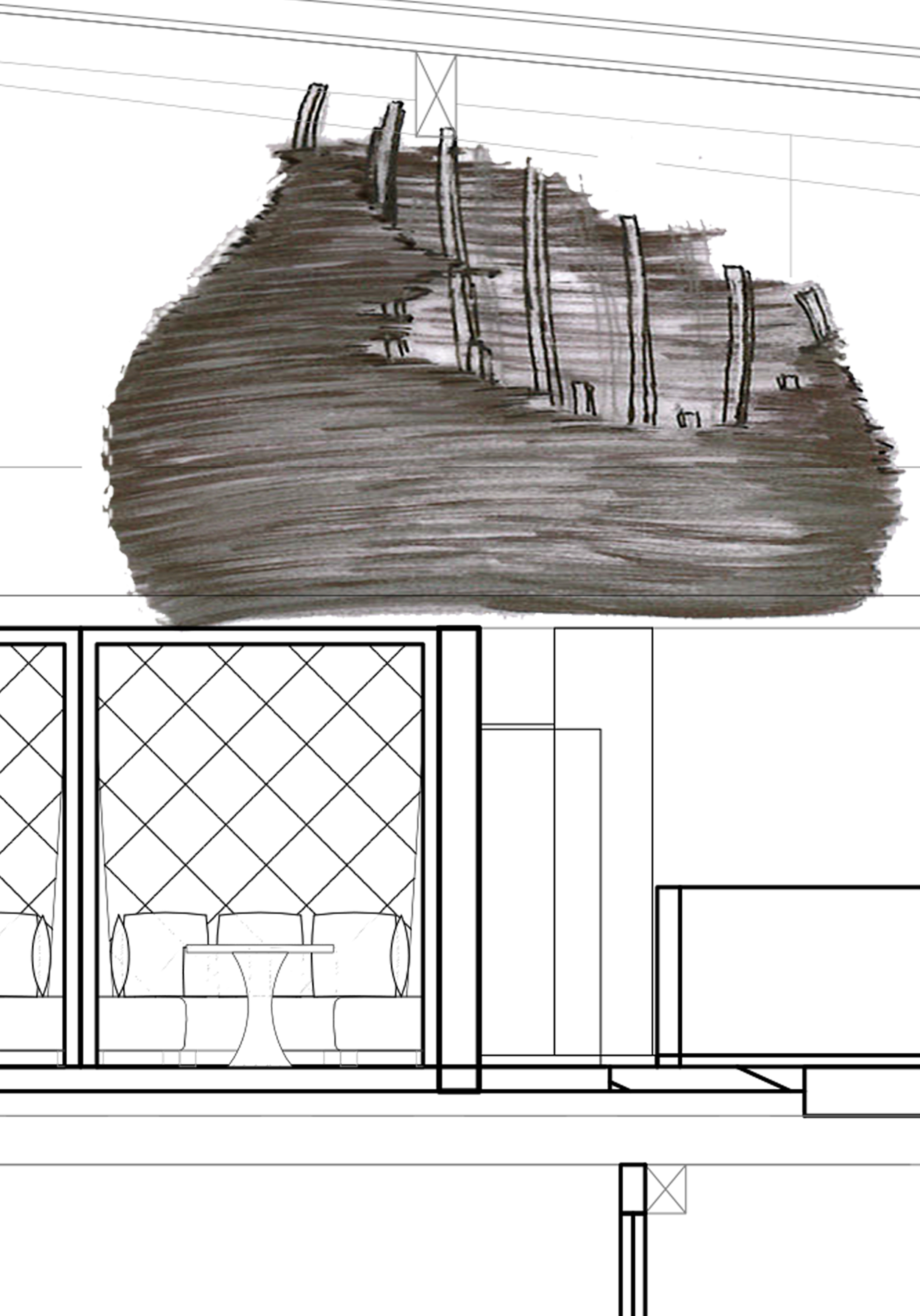 Descriptif technique de l'aménagement : tous les agencements menuisés sont réalisés en chêne et les « nids » sont réalisés en noisetier.