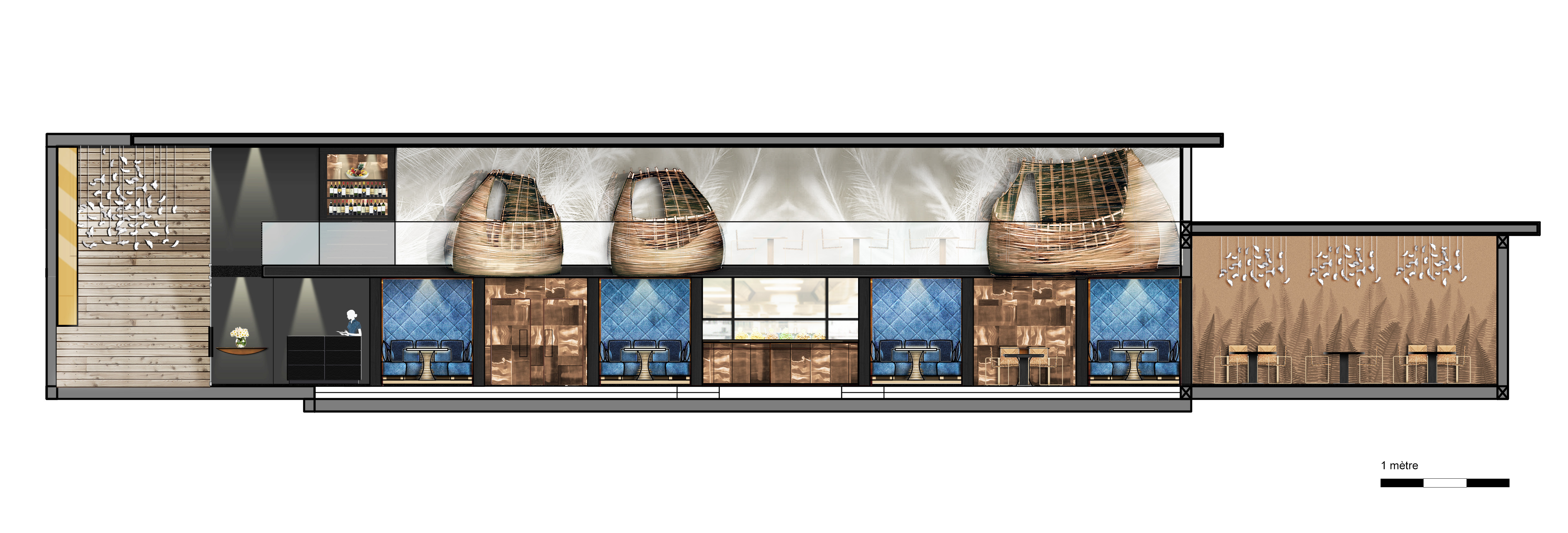 Création du Studio MHNA, l’ensemble du restaurant est dessiné en gradins afin que chacun puisse profiter de la vue exceptionnelle sur le lac d’Orient. La décoration contemporaine reste néanmoins accueillante et conviviale à travers des déclinaisons de tons chauds et de bleus, des pièces de mobiliers tout en courbes dans des matériaux organiques ainsi que des nids intimistes, véritables petits salons privés, offrant un moment hors du temps.