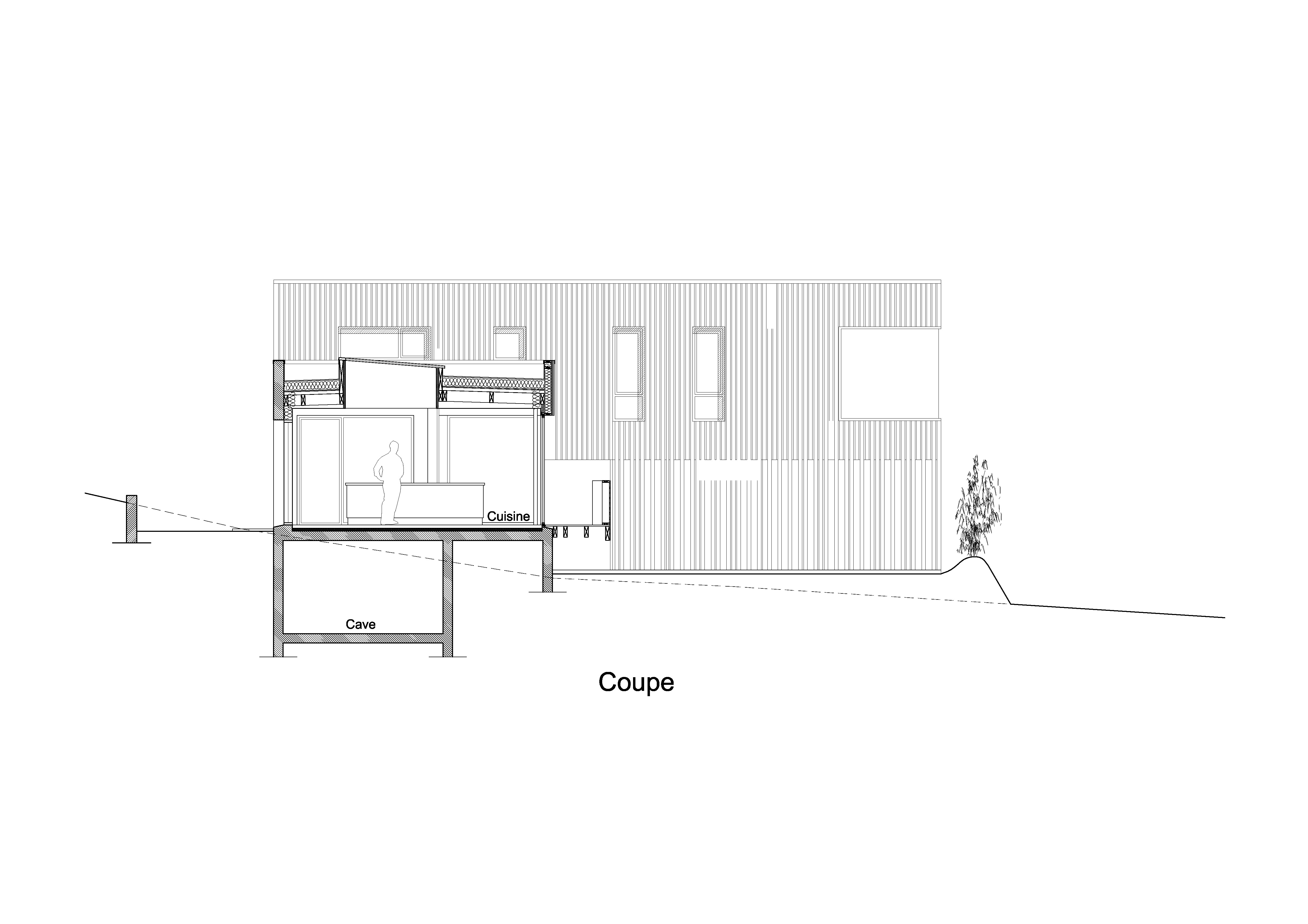 Une parcelle toute en longueur, en pente vers la mer, à l 'angle d'une rue et d'un chemin communal bordant la limite Sud : voici les atouts mais aussi les contraintes avec lesquels les architectes ont dû composer. L'implantation du projet a donc été conditionnée par la volonté d'avoir des pièces de vie ouvertes au Sud, vers la mer, sans pour autant être vu depuis le chemin communal. Ainsi, le niveau principal de la maison respecte le terrain naturel : disposé en haut de la parcelle, il surplombe le bas du terrain.