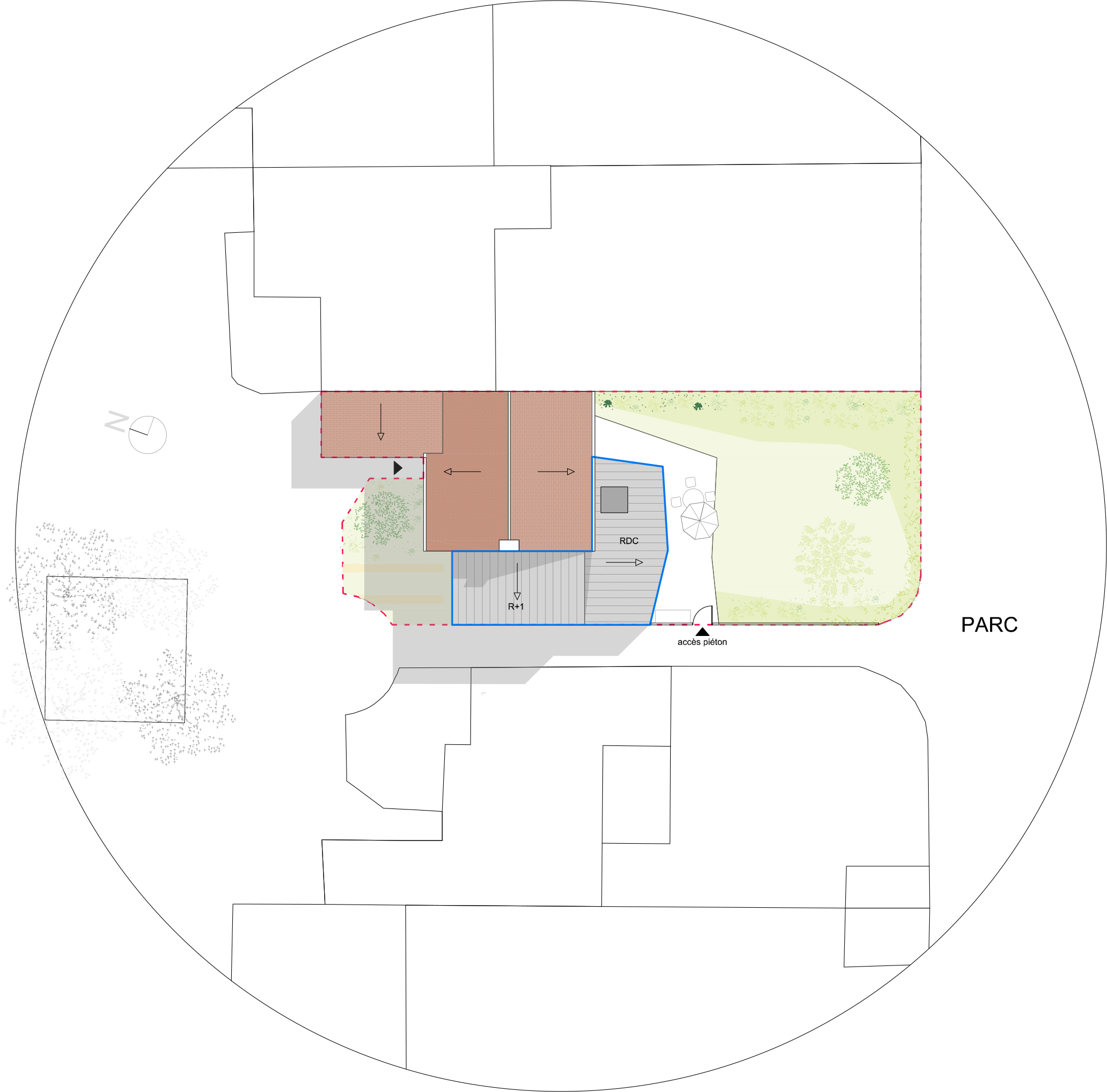Approche environnementale : Sans être labellisée l’extension s’inscrit dans une démarche respectueuse de l’environnement de par son implantation, sa configuration et les systèmes qu’elle met en œuvre : - emploi massif du matériau biosourcé bois (ossature, bardage et parements intérieurs) - compacité de l’espace chauffé - forts apports solaires au sud - ouvertures limitées au Nord (permettre la ventilation naturelle et les vues) - systèmes de protection solaire (volets accordéons ajourés + store extérieurs BSO) - jardin d’hiver = espace tampon - ballon thermodynamique (principe de l’aérothermie air/eau) - récupérateur EP