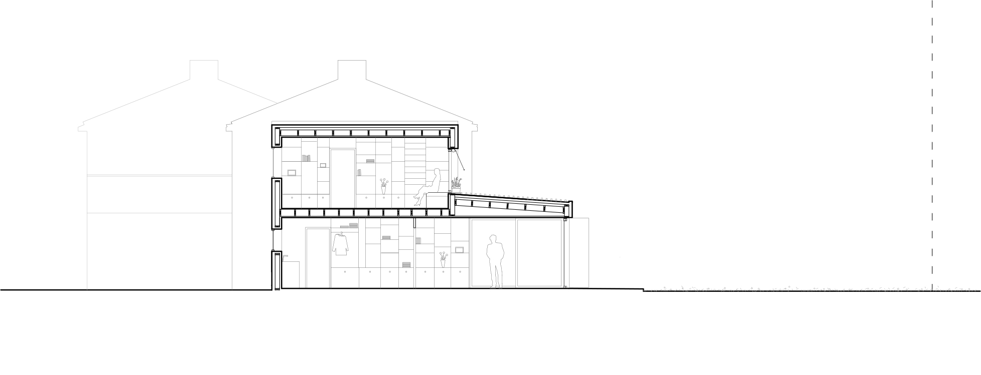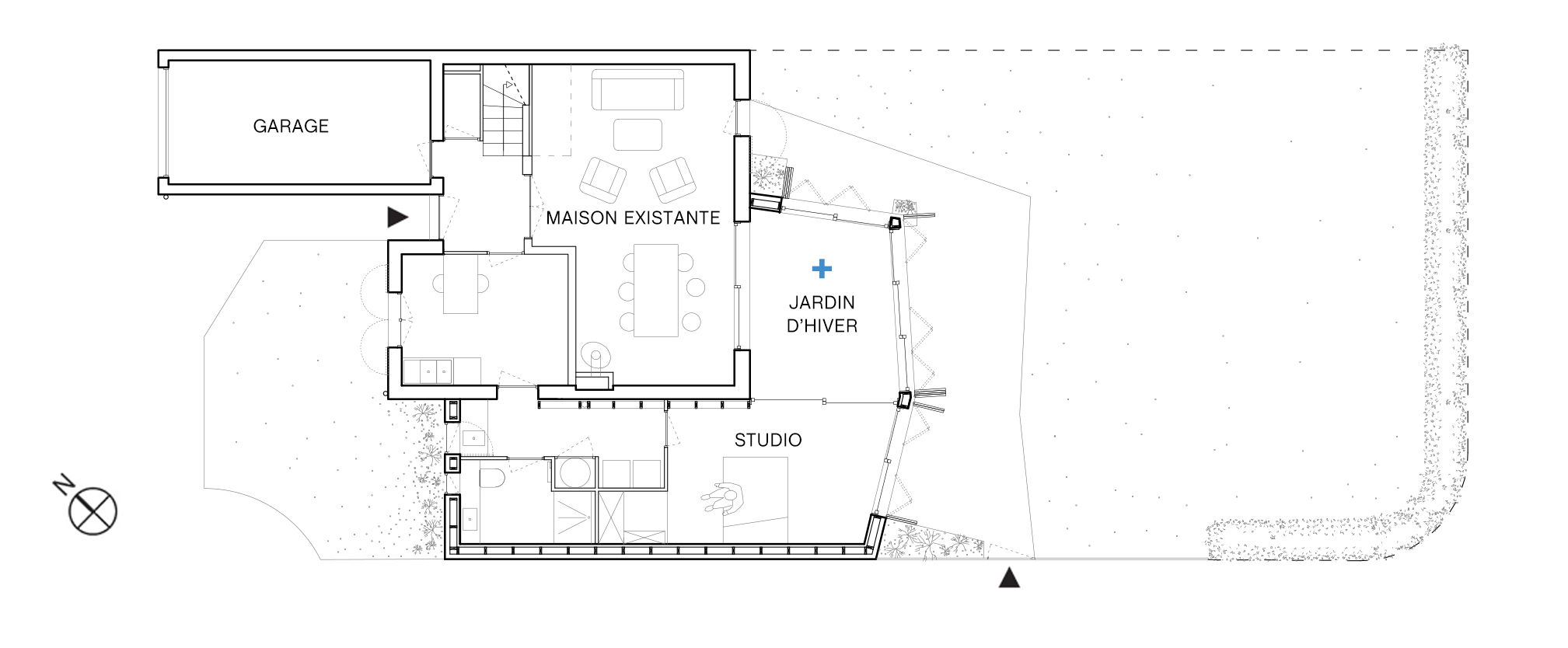 Cette extension permet en Rdc de recentrer l’espace de vie (adapté) et d’envisager de nouveaux usages : accueil de la famille et des amis, mise en location pour une cohabitation intergénérationnelle, etc. S'ouvrant sur le studio créé ou le séjour existant, le jardin d’hiver multiplie les parcours possibles et valorise les relations entre intérieur et extérieur. Il devient le lieu privilégié pour observer, au soleil, la richesse de la faune et la flore de son jardin. A l’étage, le bureau-bibliothèque paré de bois offre un univers confortable, bénéficiant d’une vue dégagée.