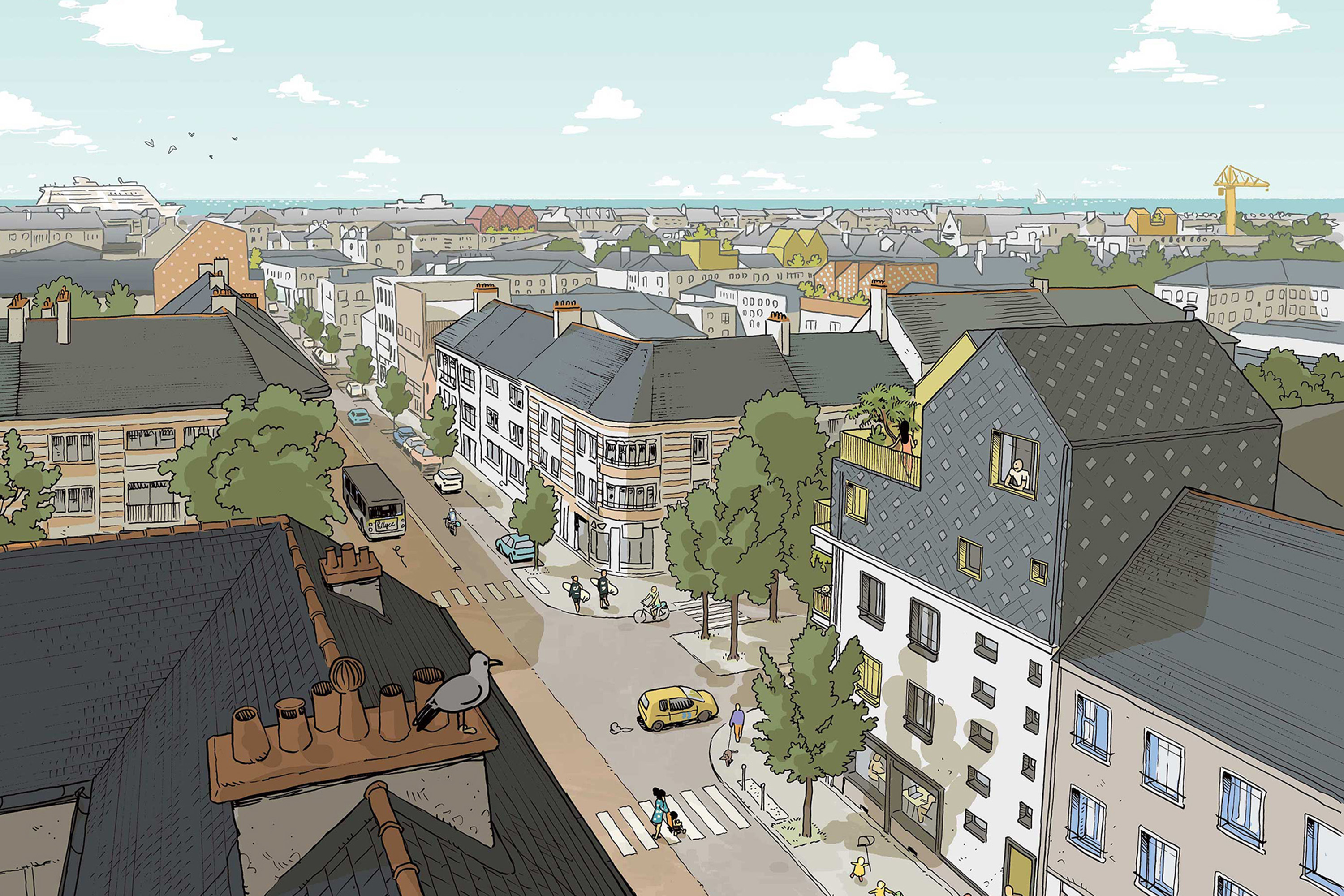 La communauté d’agglomération de St Nazaire a acheté cet ancien hôtel pour y mener une opération exemplaire de réhabilitation. Il s’agit de valoriser ce patrimoine de la reconstruction, en proposant une offre d’habitat attractive et singulière : - référence à l’imaginaire de la maison avec la création de duplex et de “maisons sur le toit” (5 duplex sur les 6 logements) - prolongements extérieurs généreux (9m² en moyenne) - lumière naturelle généreuse, vues sur les toits et l’horizon - traitement des façades par motifs et couleur, rompant avec la monotonie chromatique souvent perçue