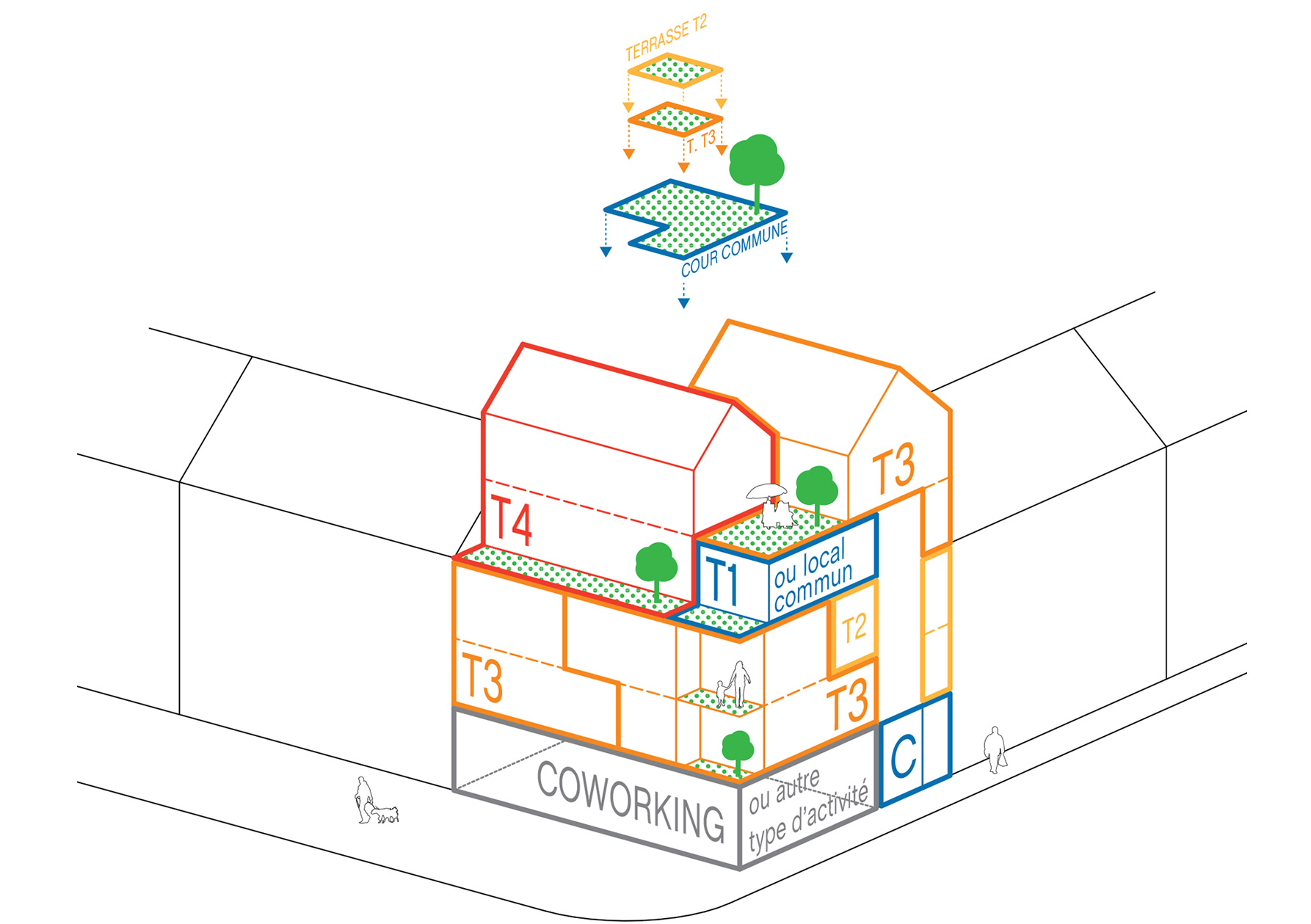 Approche environnementale : Il s’agit d’impulser, notamment auprès des copropriétés du centre-ville, une dynamique de valorisation et de réappropriation de ce patrimoine devenu obsolète. Le projet met en œuvre une rénovation acoustique et énergétique ambitieuse, au-delà de la réglementation (BBC Rénov pour les 3 logements dans l’existant). Le fonctionnement bioclimatique passif est optimisé : forts apports solaires au sud, logements traversants pouvant être facilement ventilés. Le principe même de surélévation génère une densification tendant à ménager l’étalement urbain.