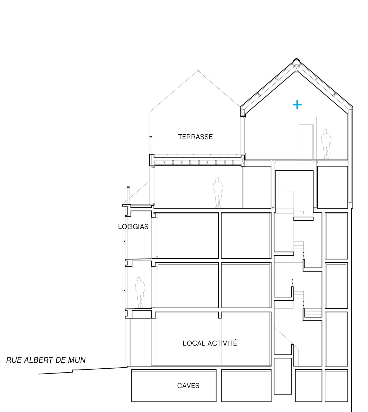 Descriptif technique : Une première phase de curage du bâtiment a permis un diagnostic plus fin de l’ossature du bâtiment. La préparation des plans d’exécution pour le lot bois pouvant alors se faire en parallèle des interventions de gros œuvre : frangements, empochements, trémies pour les duplex, chaînage périphérique. La préfabrication des éléments bois limite les impacts sur l’installation de chantier dans ce site urbain, et permet la finalisation rapide du clos couvert. Un soin particulier est apporté aux traitements acoustiques entre logements, et notamment entre la surélévation bois et les niveaux existants.