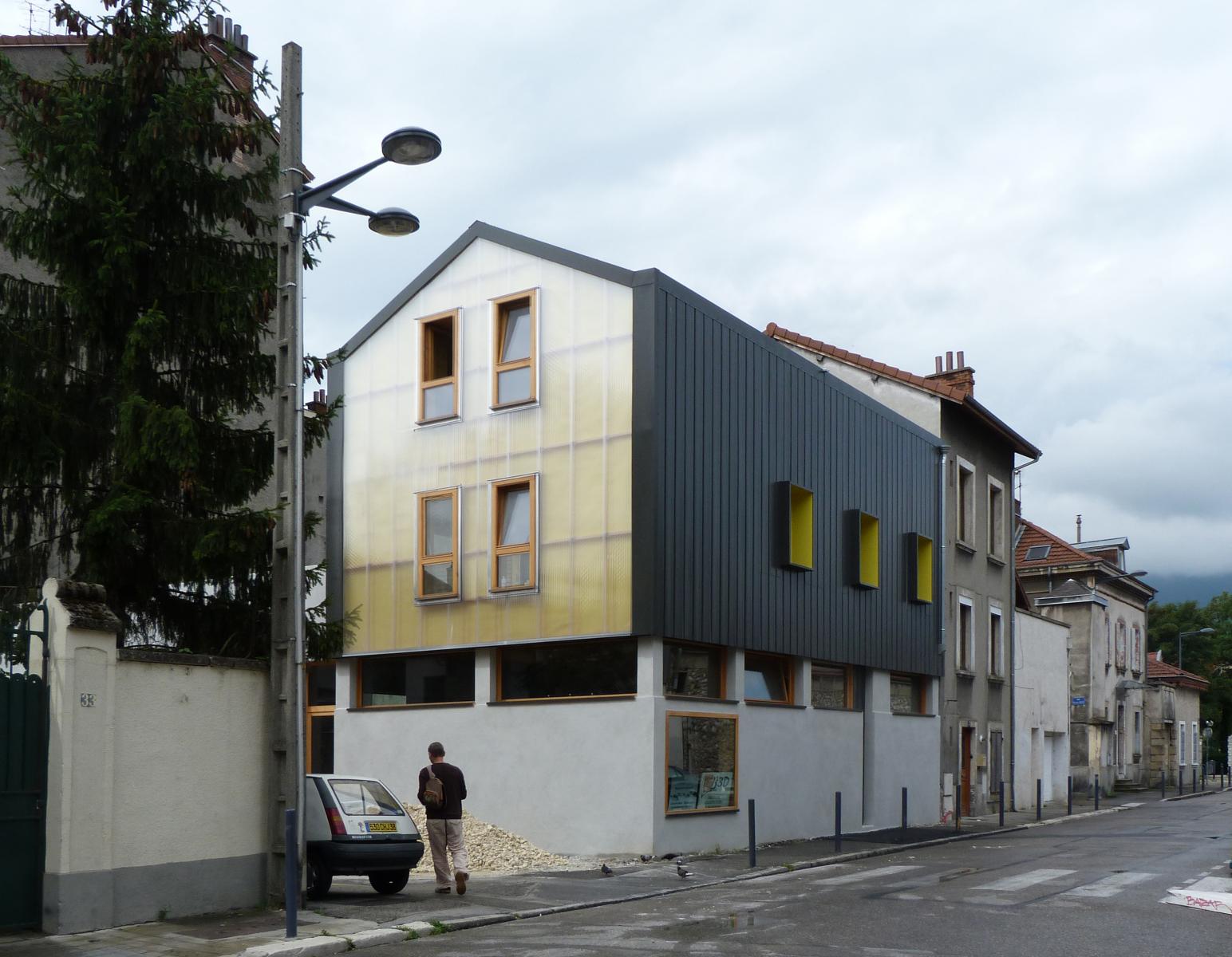 Situé dans un quartier de Grenoble caractérisé par la cohabitation de typologies d'habitat allant de la maison individuelle au collectif et de bâtiments d'activité, le terrain est à l'angle de deux voies et orienté nord/sud et est/ouest. La parcelle est petite et son orientation sud contrainte par pignon aveugle en R+4. L'implantation du bâtiment s'est faite en alignement des pignons existants côté Marx Dormoy et impasse afin de construire l'angle et de dégager le cSur d îlot qui a été conservé en jardin pleine terre. Le projet comprend un atelier d'artiste et un garage au rez-de-chaussée et une habitation au 1er étage. Chaque entité a un accès indépendant possible depuis la rue. Le logement est desservi par un escalier extérieur dans le jardin. Il est prolongé par une terrasse de plein pied située sur l'atelier. Le bâtiment affirme son statut urbain et sa mixité fonctionnelle: 1. dans le traitement de sa volumétrie avec une aile s'abritant sous un toit à deux pans en bac couleur zinc côté rue Marx Dormoy (au nord) reprenant la typologie des immeubles voisins et une aile en toiture terrasse accessible sur l'impasse favorisant l'ensoleillement à l'est du coeur de parcelle 2. dans l'expression de ses façades avec un traitement maçonné en béton brut du socle abritant l'atelier d'artiste sur lequel se développe une boite en bardage métallique lisse couleur grise accueillant le logement. 3. Afin de marquer l'angle, le pignon reçoit un traitement particulier : le bardage est traité avec des panneaux en polycarbonate qui laissent voir un pare pluie coloré jaune. Les ouvertures (menuiseries bois) expriment aussi ces fonctions : 1. vitrage en imposte pour l'atelier afin de garantir la tranquillité de travail et une répartition harmonieuse de la lumière naturelle. 2. Les fenêtres verticales côté Marx Dormoy, reprennent les proportions des immeubles voisins. 3. Les grands châssis vitrés côté jardin permettent de profiter des apports solaires. Le traitement environnemental La partie logement a été entièrement réalisée en ossature bois, murs (145x45), planchers et toiture permettant d éliminer les ponts thermiques. L'ensemble du bâtiment bénéficie d'une isolation renforcée offrant une bonne inertie (insufflation de ouate de cellulose) doublé d'une fibre de bois faisant pare pluie. La toiture a été traitée avec un complexe de type Sapisol, finition lambris intérieure et recouvert d'un bac sur l'extérieur. Les ouvertures ont des doubles vitrages avec lame d'argon. La ventilation mécanique est de type hygroB pour limiter les déperditions. Le faible ensoleillement de la parcelle ne permettant pas d'envisager de solutions solaires, le chauffage et la production d'eau chaude sont réalisés avec une chaudière gaz à condensation à haut rendement. JUSTIFICATION DE L'UTILISATION DU MATÉRIAU BOIS ET DES TECHNIQUES UTILISÉES L'utilisation du bois dans le projet permet de dissocier parfaitement les deux entités programmatiques en particulier du point de vue thermique en créant une « boite » logement parfaitement isolée de l'atelier. La mixité constructive identifie les deux usages, et crée un socle « dur » adaptéà un rez-de-chaussée urbain surmonté d'une boite qui tout en reprenant la typologie traditionnelle des immeubles alentours affirme sa contemporanéité par le choix de ses matériaux. Enfin, dans le cadre d'un chantier urbain très contraint en terme d'accès et de stationnements le choix du bois a permis de réduire sensiblement le temps de chantier grâce à la préfabrication en atelier.