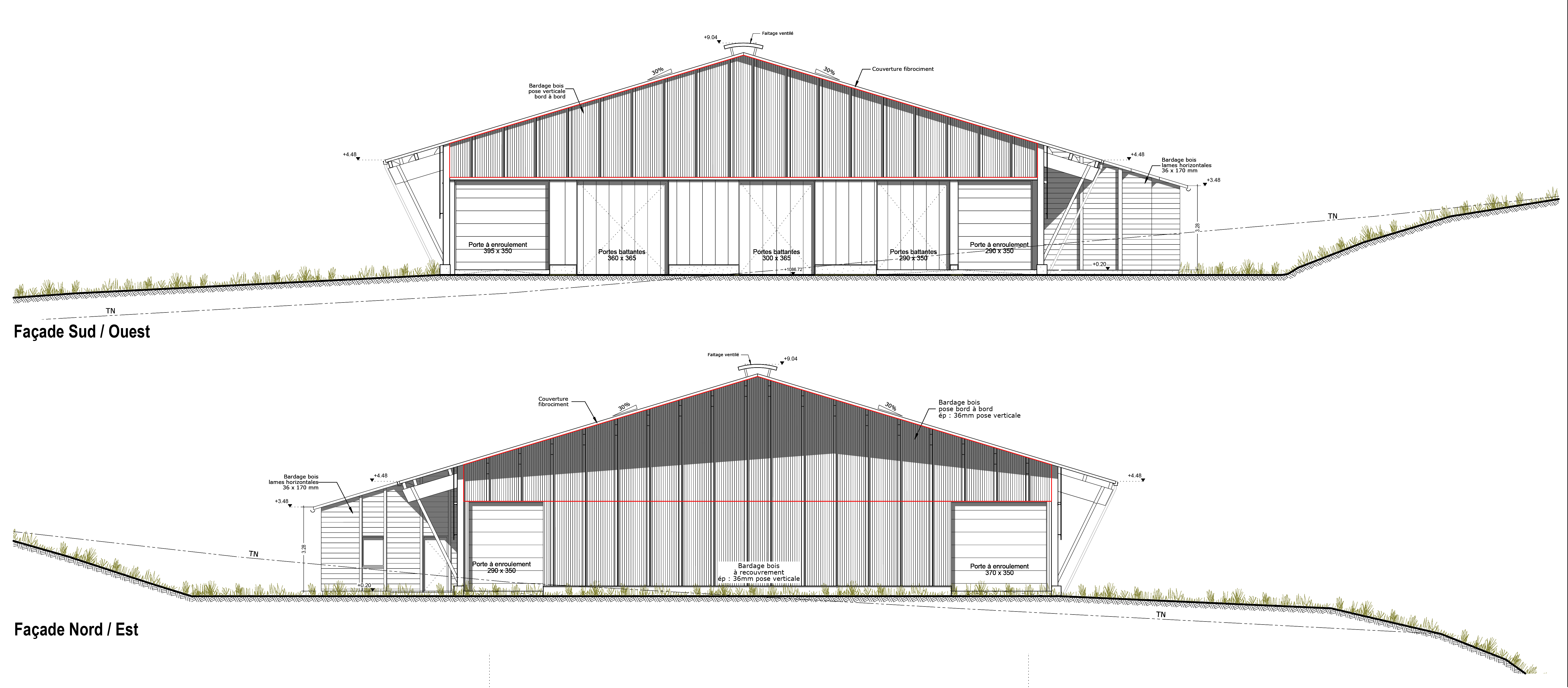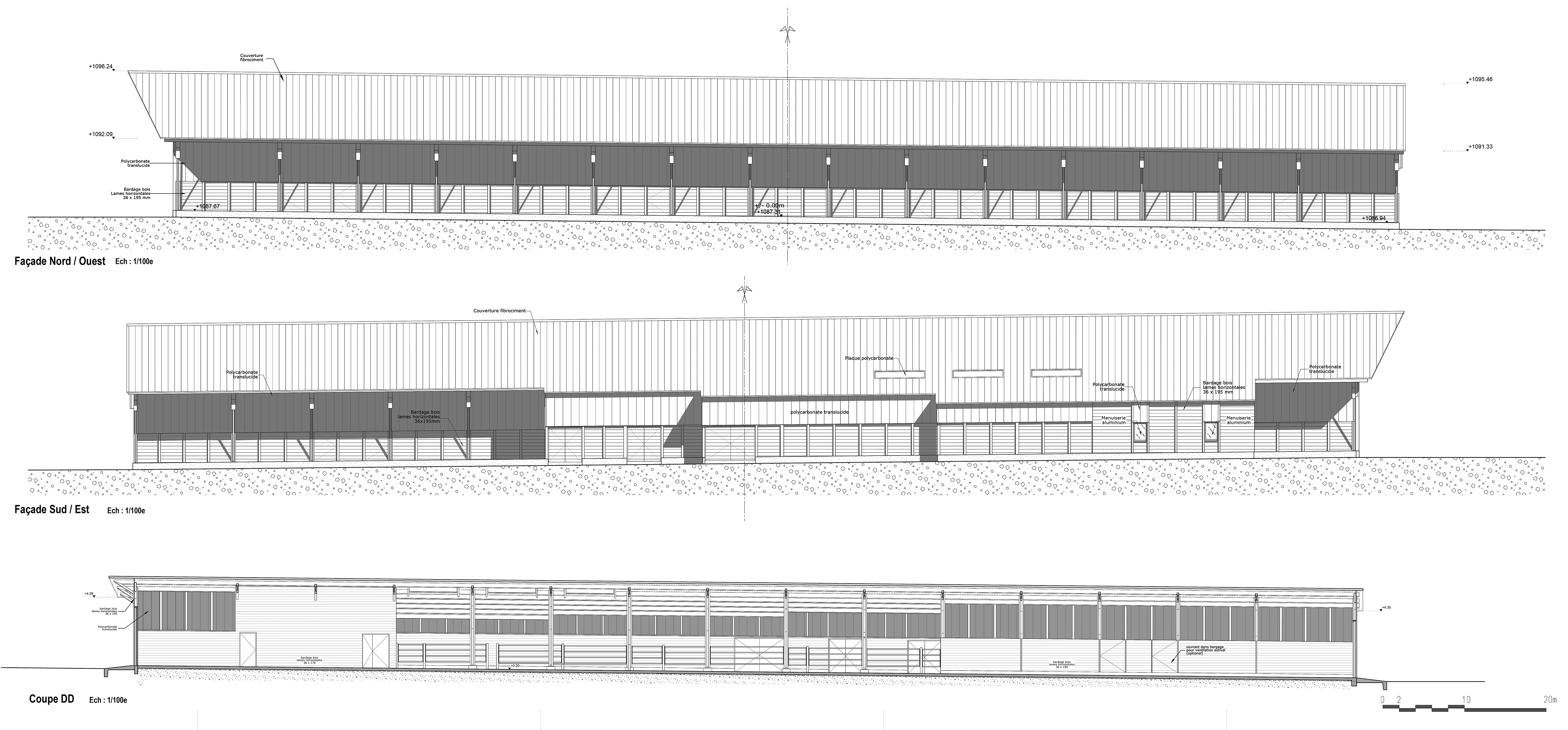 Approche environnementale : Utilisation de bois (matériau renouvelable) pour les charpentes, bardages extérieurs, provenant de la région Auvergne Rhône Alpes. La toiture, en fibrociment, vient couvrir la totalité du bâtiment en deux pans continus, débordant largement afin d’apporter une protection solaire contre les surchauffes estivales. Les surfaces de ventilation mises en place sont dimensionnées pour assurer une ventilation verticale (effet cheminée) et une ventilation transversale (effet vent) et créer une ambiance saine pour les animaux et les animaliers.