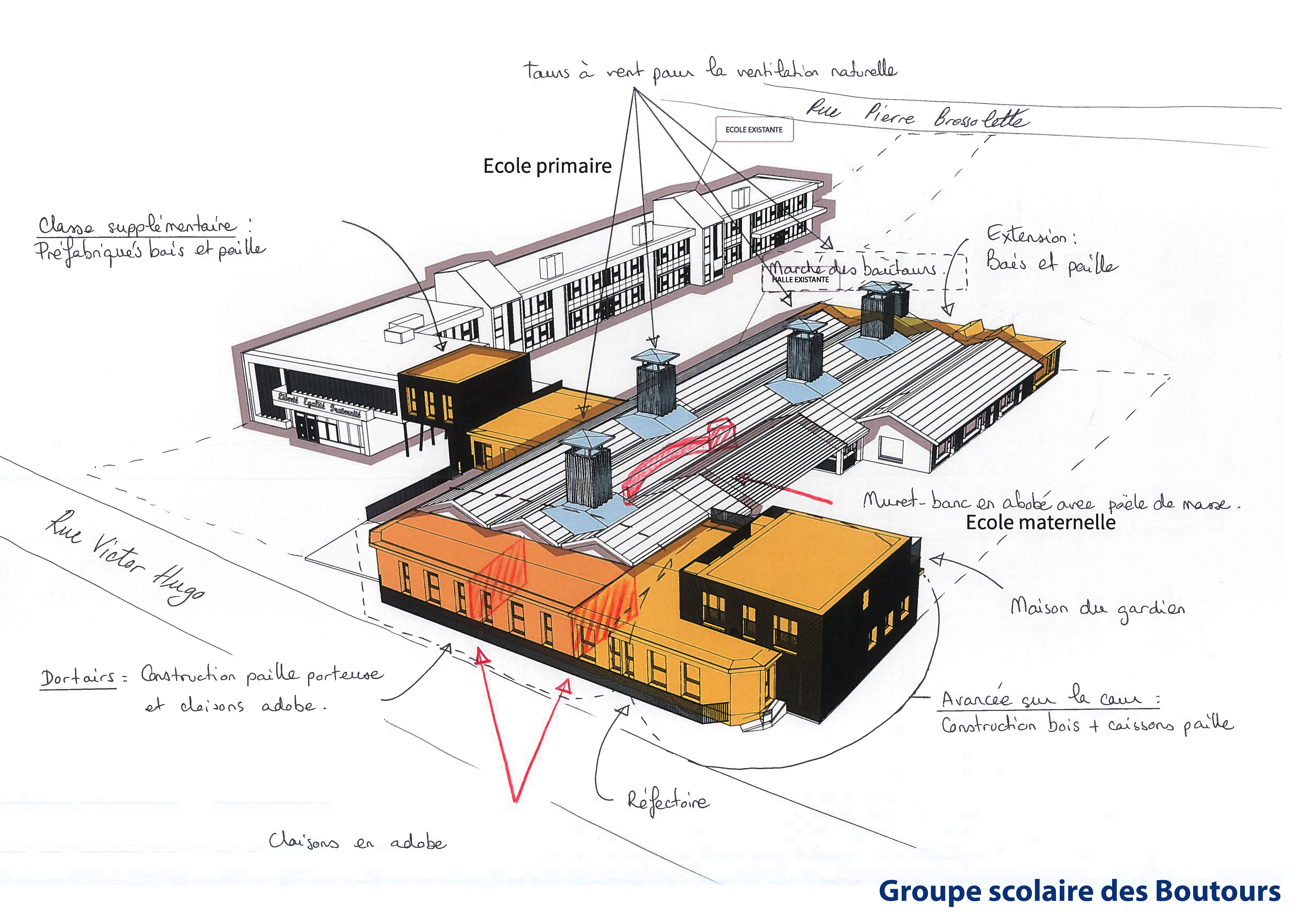 Parce que renouvelable, le bois est largement représenté dans le projet, en renfort de la structure existante (ancienne halle de marché) et en structure neuve (extensions). Il est employé en habillage extérieur sous la forme d’un bardage vertical et horizontal. Le bois en bardage a la qualité de se prêter à tous les volumes. Il joue autour des tours de ventilation naturelle, pyramides tronquées à base carrée qui émergent de la toiture en véritables signaux visuels des Boutours. Pour sa structure et dans un jeu subtil de vibrations d'un mikado coloré, le bois a permis une interprétation contemporaine des tours à vent, élément essentiel de l'innovation qu'est la ventilation naturelle avec récupération de chaleur. Le bardage bois unifie le langage architectural de l’ancien et du nouveau et réconcilie, grâce à la couleur, la première école livrée en 2014 avec la seconde, livrée en 2017.
