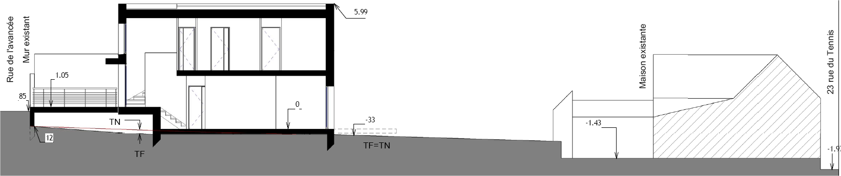 Approche environnementale : Maison en RT2012 -30% avec VMC DF et triple vitrage. Le chauffage ne se fait que par un poêle à pellets. Les pièces de vie sont tournées vers Est et le Sud.