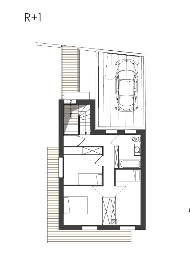 Maison Familiale Compacte, issue d'une division parcellaire en densification douce. comportant 3 Chambres. La maison s'est construit dans le fond du jardin de la maison familiale ancienne, autour d'un garage existant. on accède au logement par une passerelle, telle un navire au port.