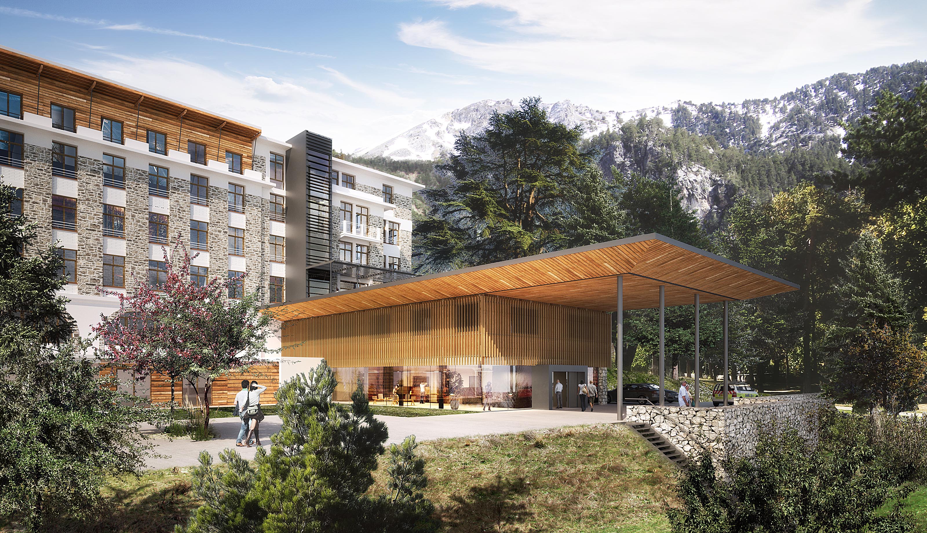 Le nouveau bâtiment d’accueil du Centre Médical du Bois de l’Ours se développe sur 2 niveaux et s'accompagne d'un nouvel ascenseur vitré en façade Sud desservant les 7 niveaux de l’établissement existant. Le nouveau volume se veut simple, en harmonie avec le bâti existant. Le rez-de-chaussée est largement vitré et ouvert sur le jardin tandis que l’étage aérien est animé d’un claustra constitué de tasseaux verticaux en bois. Le bois en façade affirme l’écriture contemporaine contrastant avec l’architecture de cet ancien sanatorium construit en 1934 (labellisé patrimoine du XXè siècle).