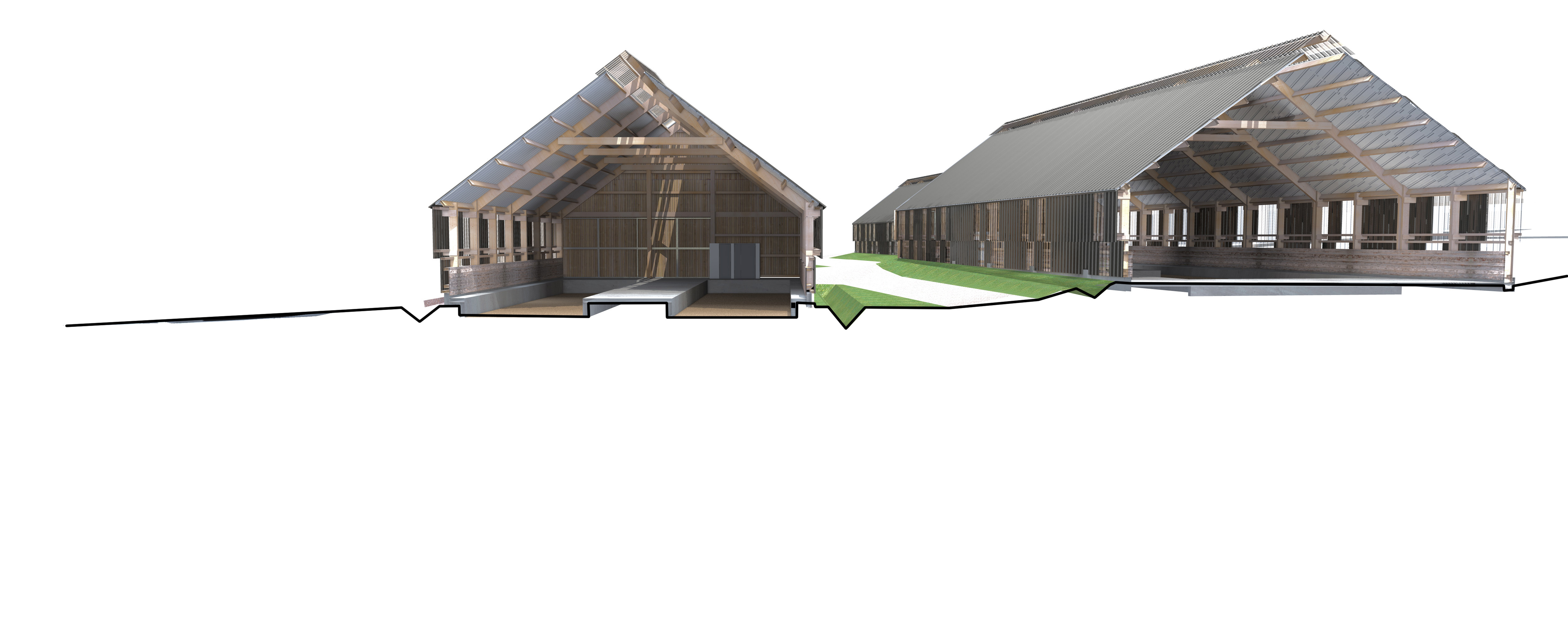 Approche environnementale : Le but de l’opération est de limiter l’empreinte environnementale des bâtiments. Le choix d’opter pour une charpente et des ossatures bois permet une déconstruction ou des modifications futures aisées selon les besoins expérimentaux. Un effort tout particulier est porté sur l’usage de ressources locales (bardages et la structure en bois d’origine locale). L’implantation dans la pente limite les terrassements et respecte le profil du terrain naturel. Les surfaces extérieures sont perméables pour limiter le ruissellement et des noues permettent de récolter les eaux pluviales.
