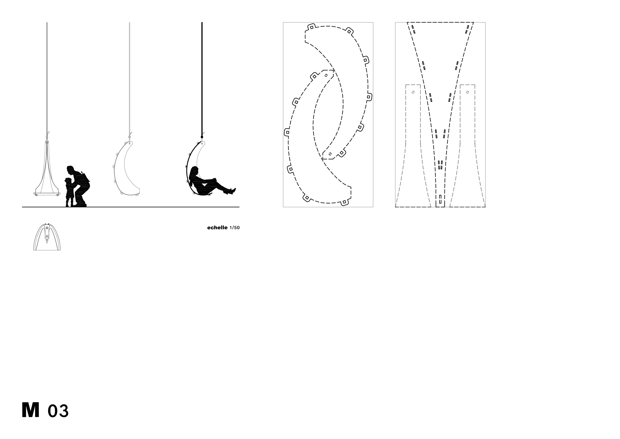 Coquilles vides Le grand tilleul a donné naissance à de gigantesques fruits, suspendus aux branches les plus hautes par d'interminables lianes. Ils se sont posés là pendant la nuit. De loin, ils semblent flotter au ras du sol. On s'approche, les coques sont ouvertes et vides, aucune trace des graines... Restent des enveloppes concaves, lisses et accueillantes. La faible hauteur permet d'y accéder. Assis, couché, vautré, recroquevillé, la suspension autorise un doux balancement. Qui n'a jamais rêvé de prendre la place d'un fruit? d'une graine délicatement blottie dans sa coquille?