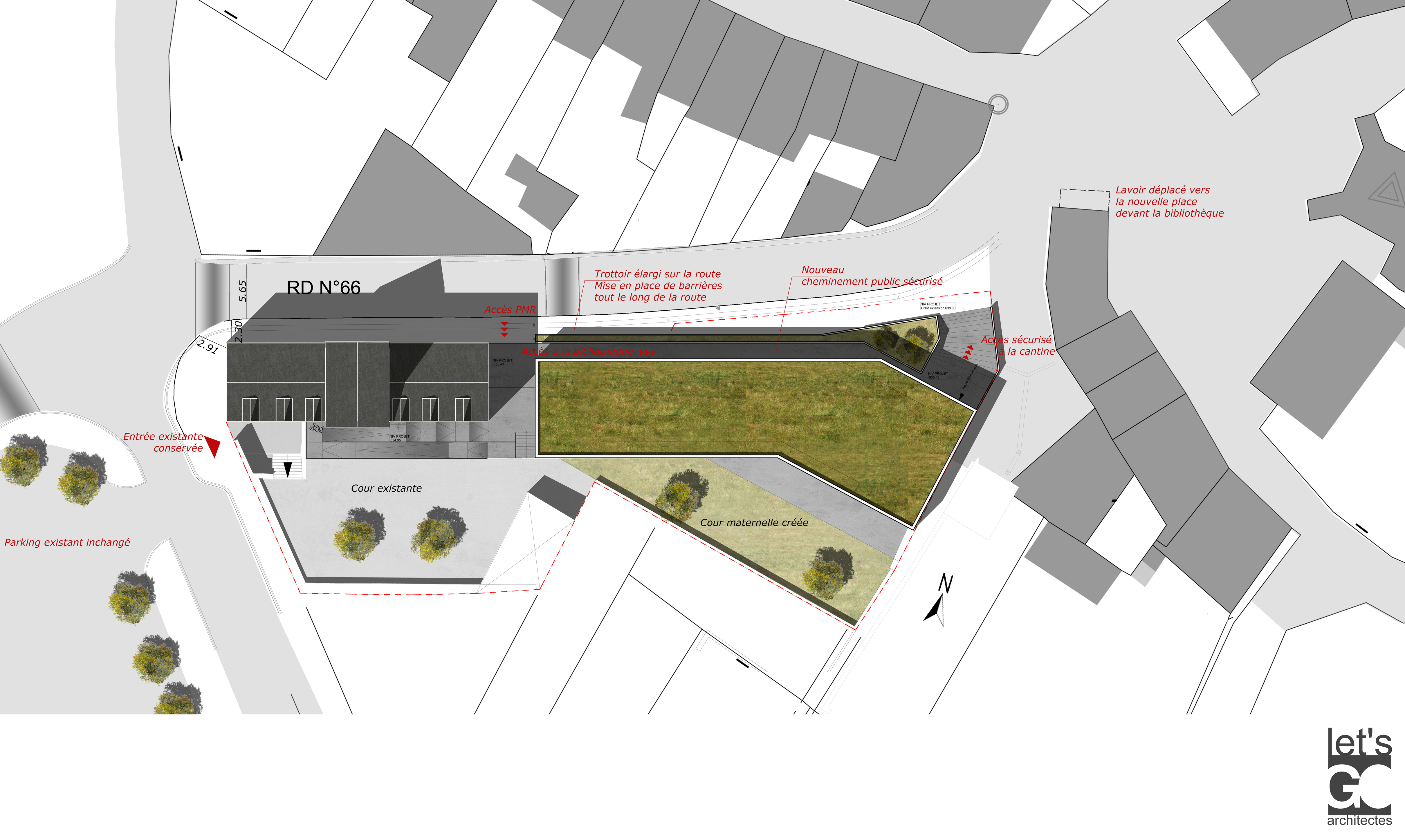 Approche environnementale : La proposition d’extension de l’école a été le prétexte pour retrouver le rapport du bourg au grand paysage. Un cheminement sécurisé et accessible depuis le centre bourg et la place de l'église a été créé ainsi qu'un espace public en lien avec l'école. Ceci est permis en implantant le nouveau bâtiment en contrebas et en s'affranchissant de l'ancien alignement permettant à la vue d’échapper depuis la route et ainsi de profiter de ce contexte particulier.Le fait de séparer l'extension de l'existant a créé une nouvelle entrée à l'école en lien avec le cheminement sécurisé et permettant de gérer l'accessibilité de la partie ancienne.