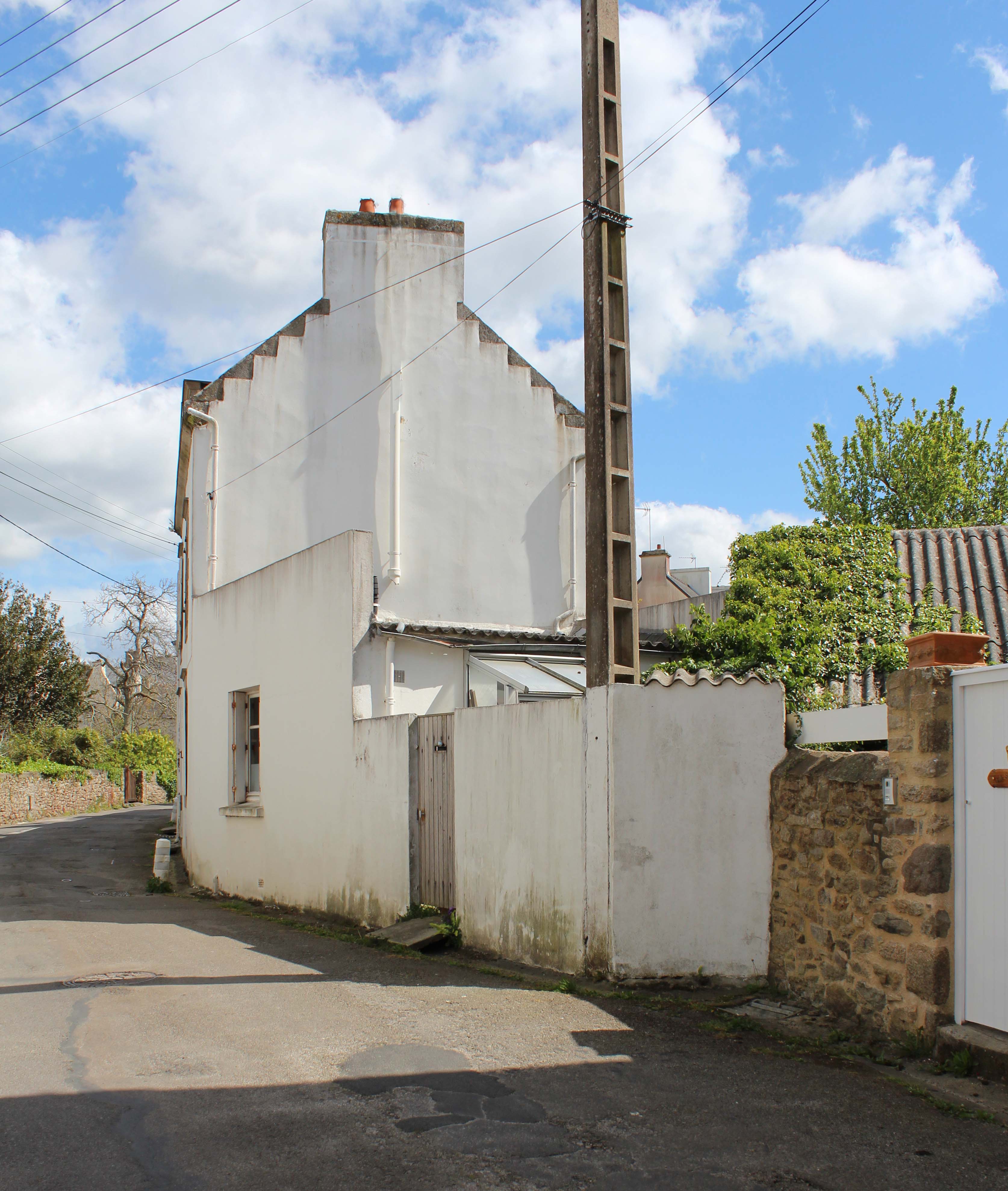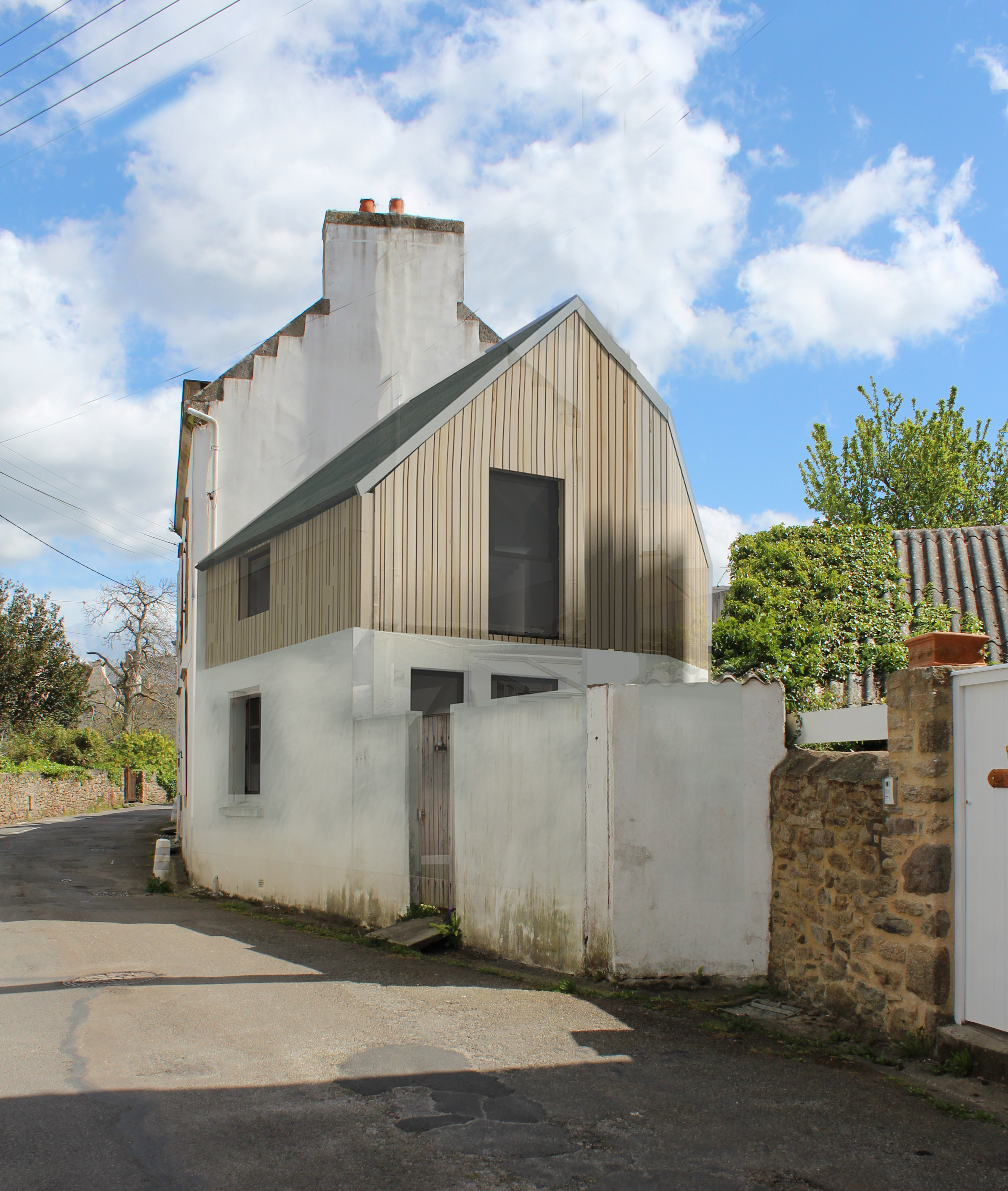 La maison initiale date de 1930 avec une extension des années 1970. Cette dernière sera surélevé par une construction en ossature bois. La partie 1930 en pierre aura ses planchers et escalier conservés avec une rénovation + isolation complète. La façade Sud aveugle sera percée afin de recentrer l'habitation sur son jardin avec qui elle ne communiquait presque pas. La partie surélévation bois à été bardée en Douglas ajouré vertical.