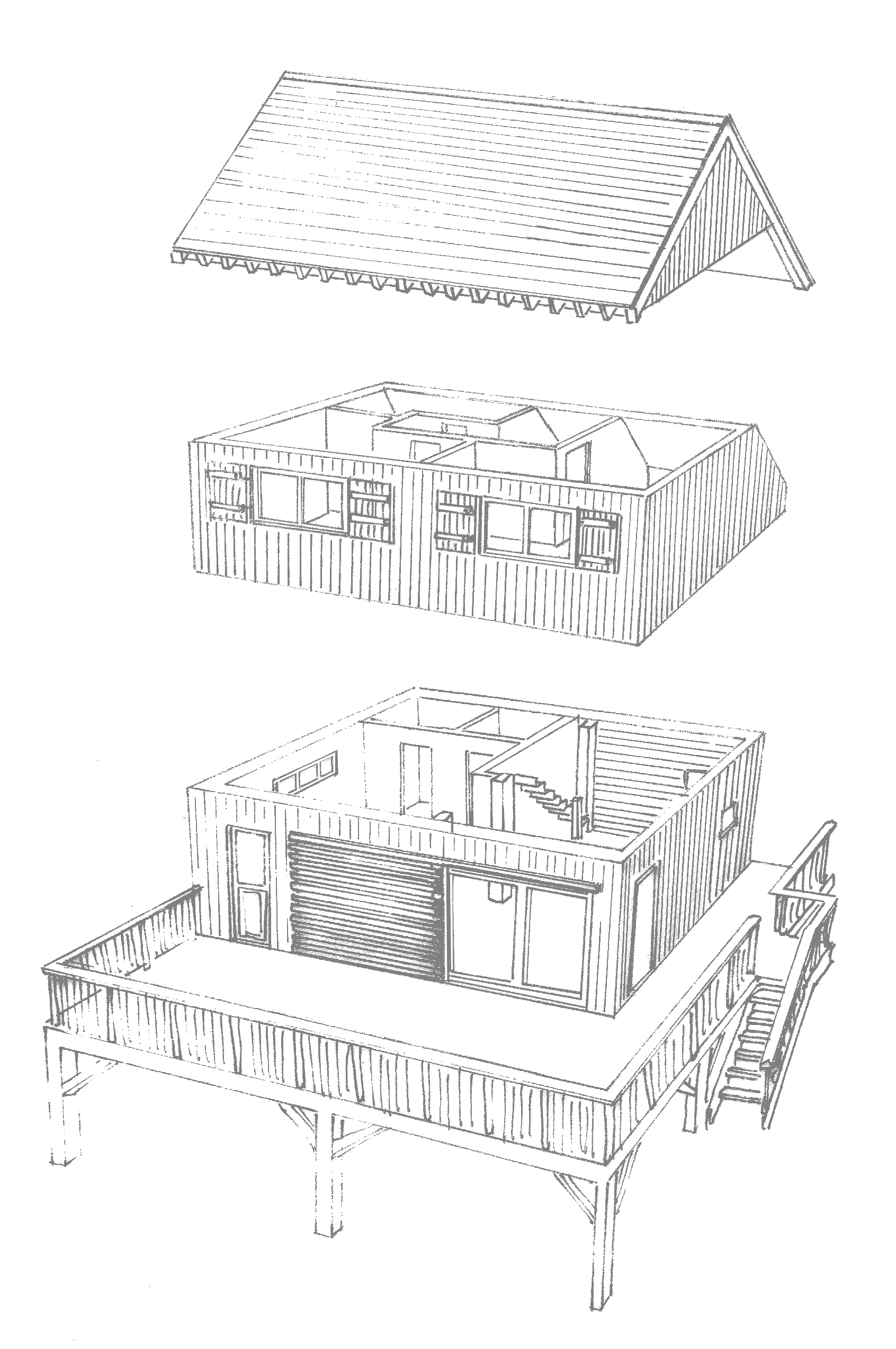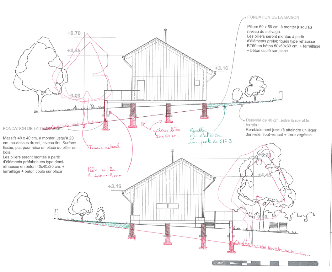 Descriptif technique : - Sol : 9 poteaux béton 50 x 50 cm, OSB4 16 mm, solives douglas (entraxe 50 cm) doublées en périphérie, 21 cm laine de bois, frein-vapeur, lambourdes, parquet pin des Landes cloué - Murs : bardage 21 mm douglas du Limousin, liteaux, film pare-pluie, OSB 9 mm, ossature bois 45 x 145 cm, laine de bois (145 mm), frein-vapeur, 60 mm laine de bois dans doublage, lambris sapin sur tasseaux ou plaque de plâtre sur rails - Cloisons : Fermacell sur rails + 50 mm laine de bois - Toit : ardoise fibrociment, 305 mm laine de bois entre chevrons puis entre pannes (couches croisées), frein-vapeur, lambris sur tasseaux - Menuiseries mélèze lamellé-collé abouté double vitrage NF Maison Individuelle