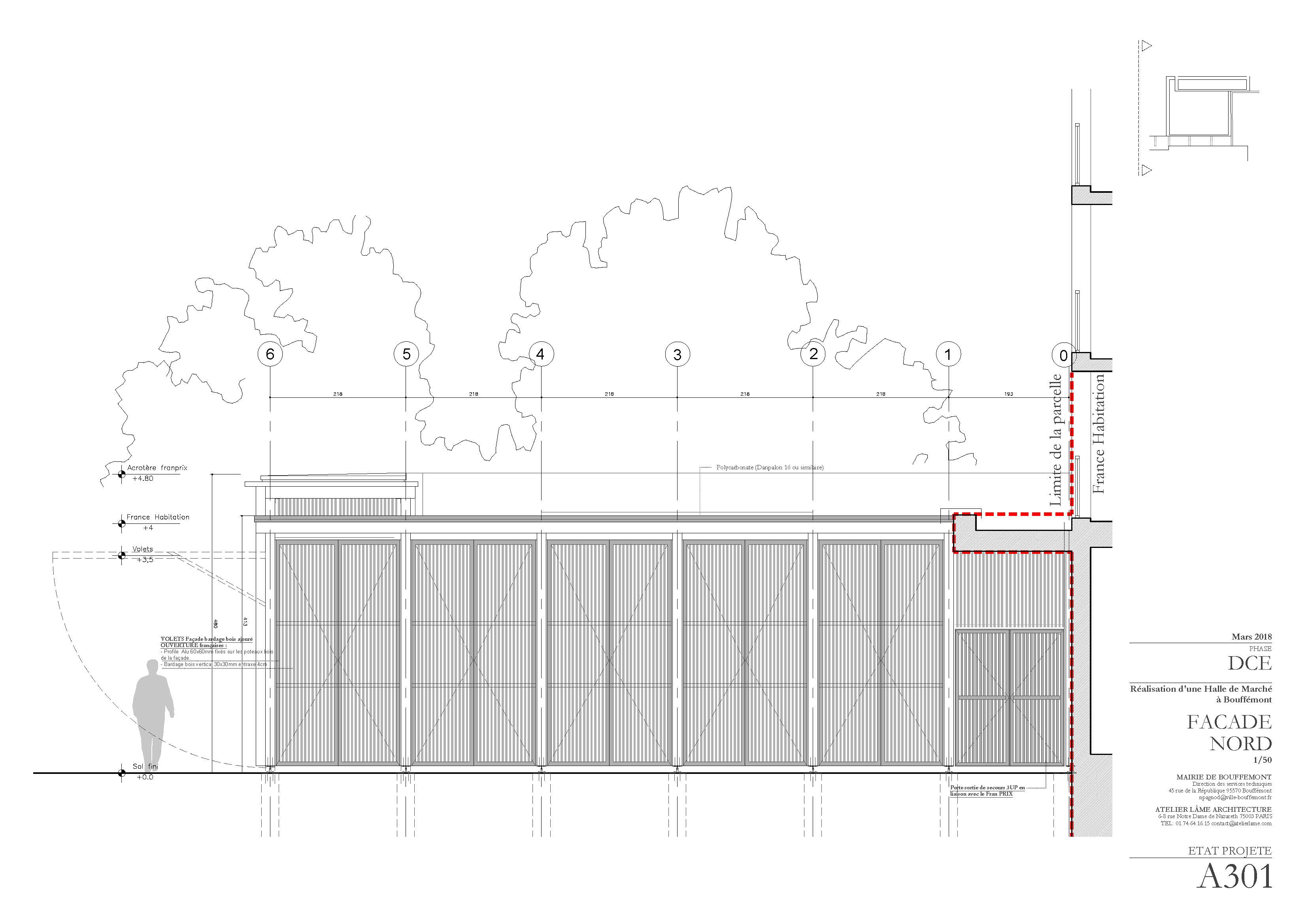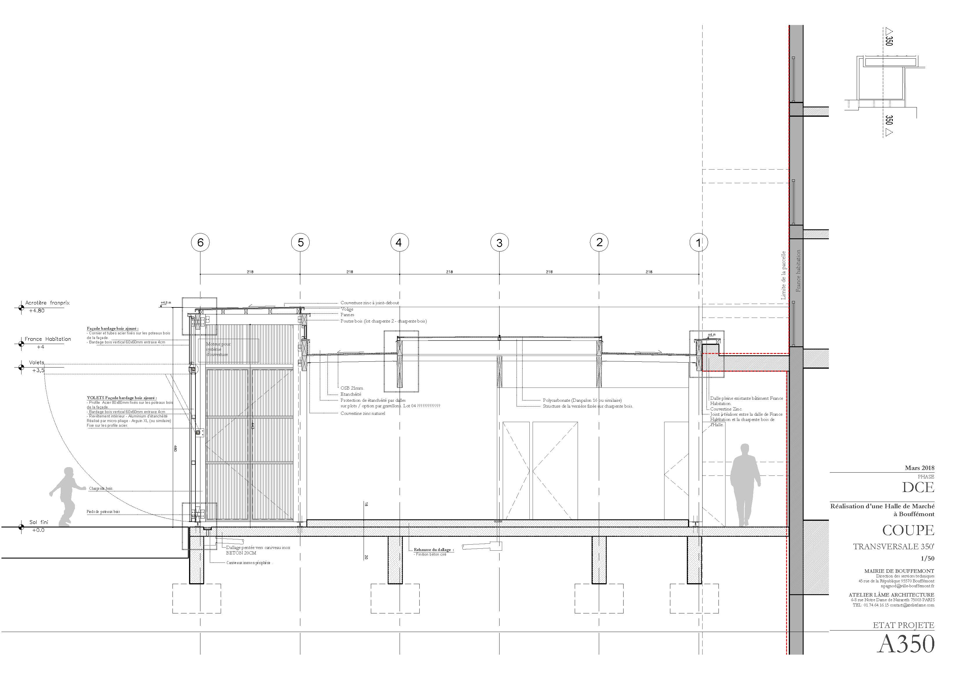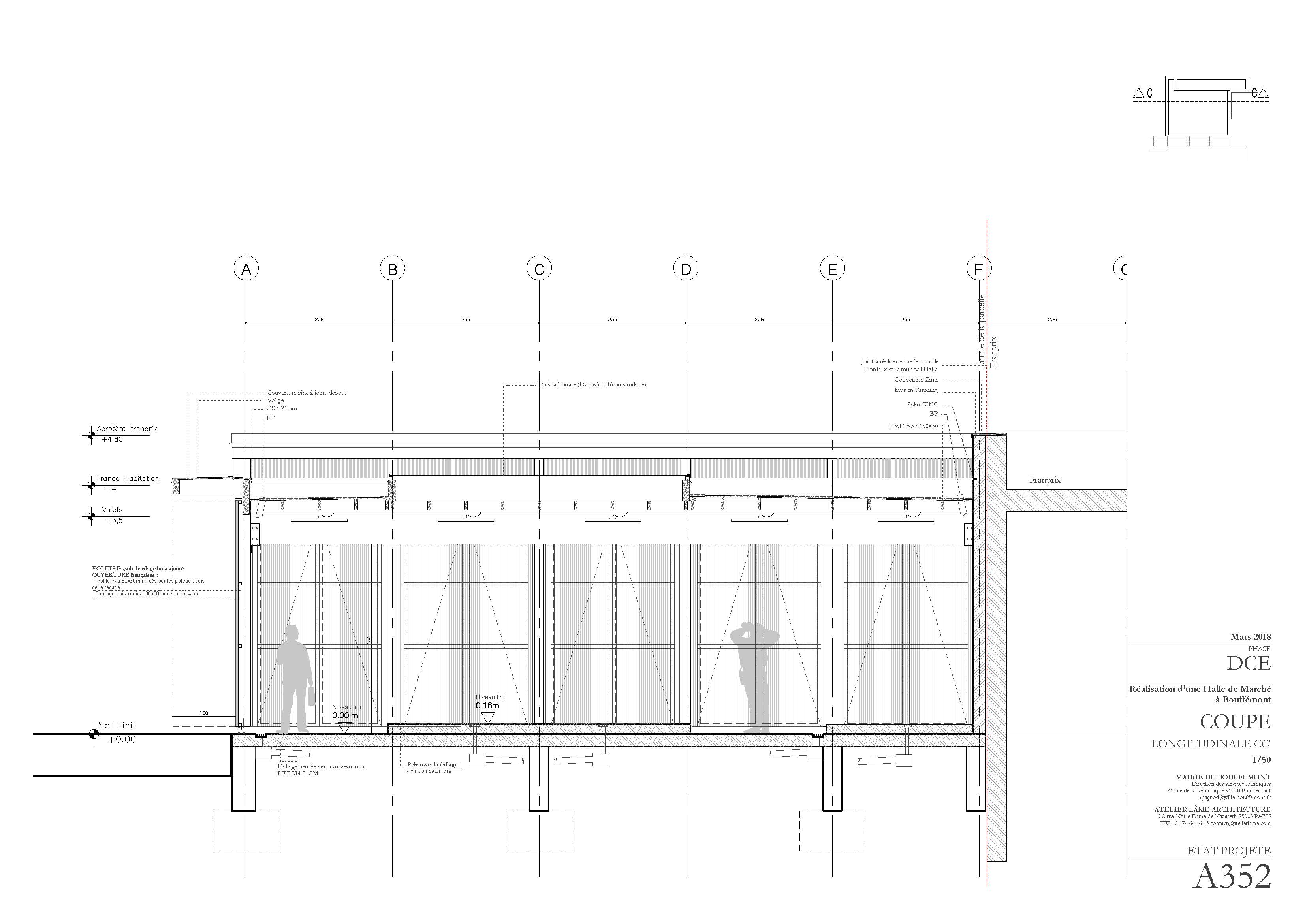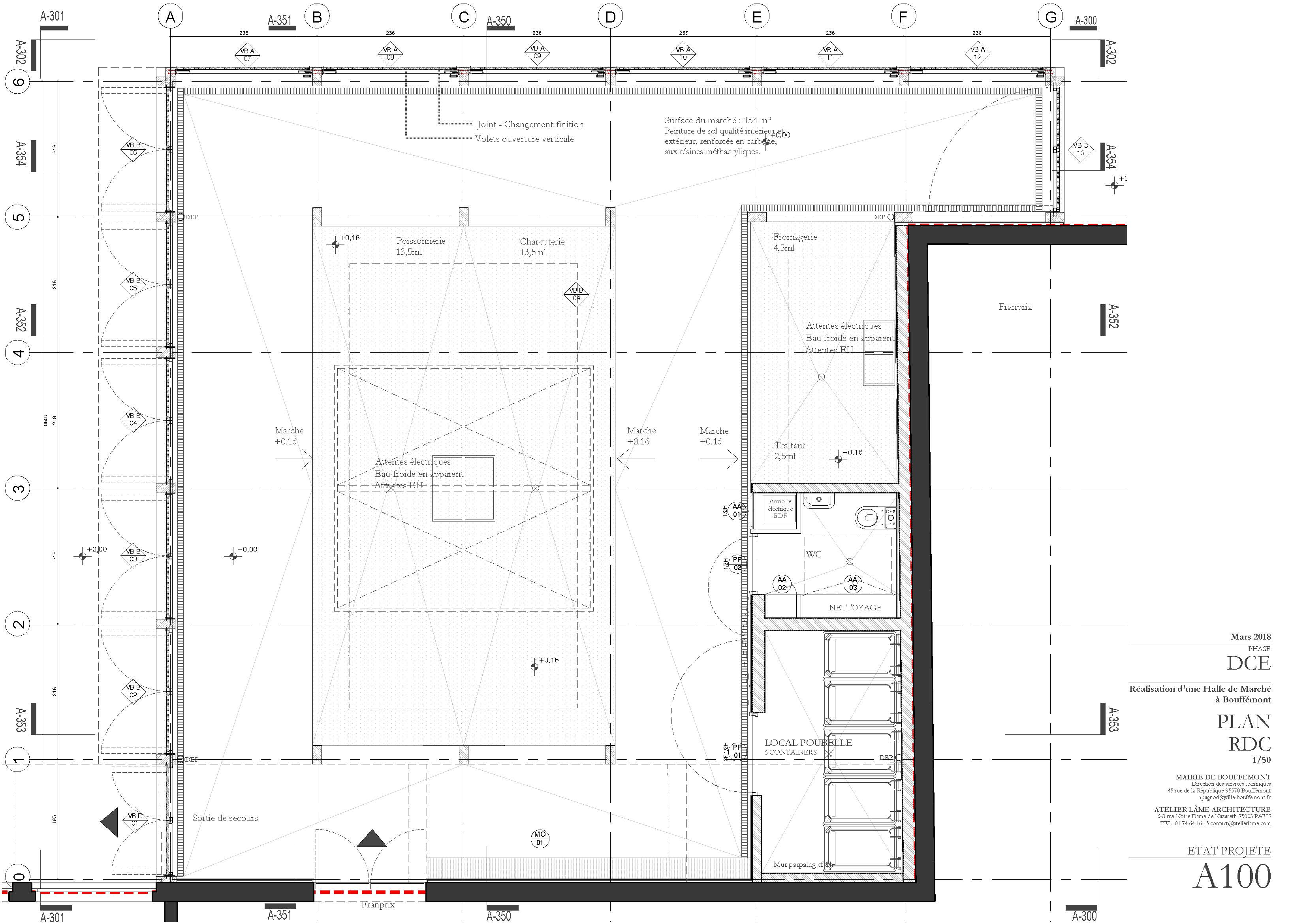 Descriptif technique : La halle de marché répond à un programme précis composé d'échoppes fixes, des échoppes temporaires, ainsi que des locaux annexes. Le plan d’agencement a été pensé afin d’offrir une grande modularité. L’emplacement des marchands a été pensé de manière évolutive. La nouvelle halle de marché se situe très exactement dans un « coin », entre la place, le bâtiment France Habitation et le magasin Franprix. Nous avons avancé l’emprise du projet afin que la nouvelle halle soit visible de toute part.