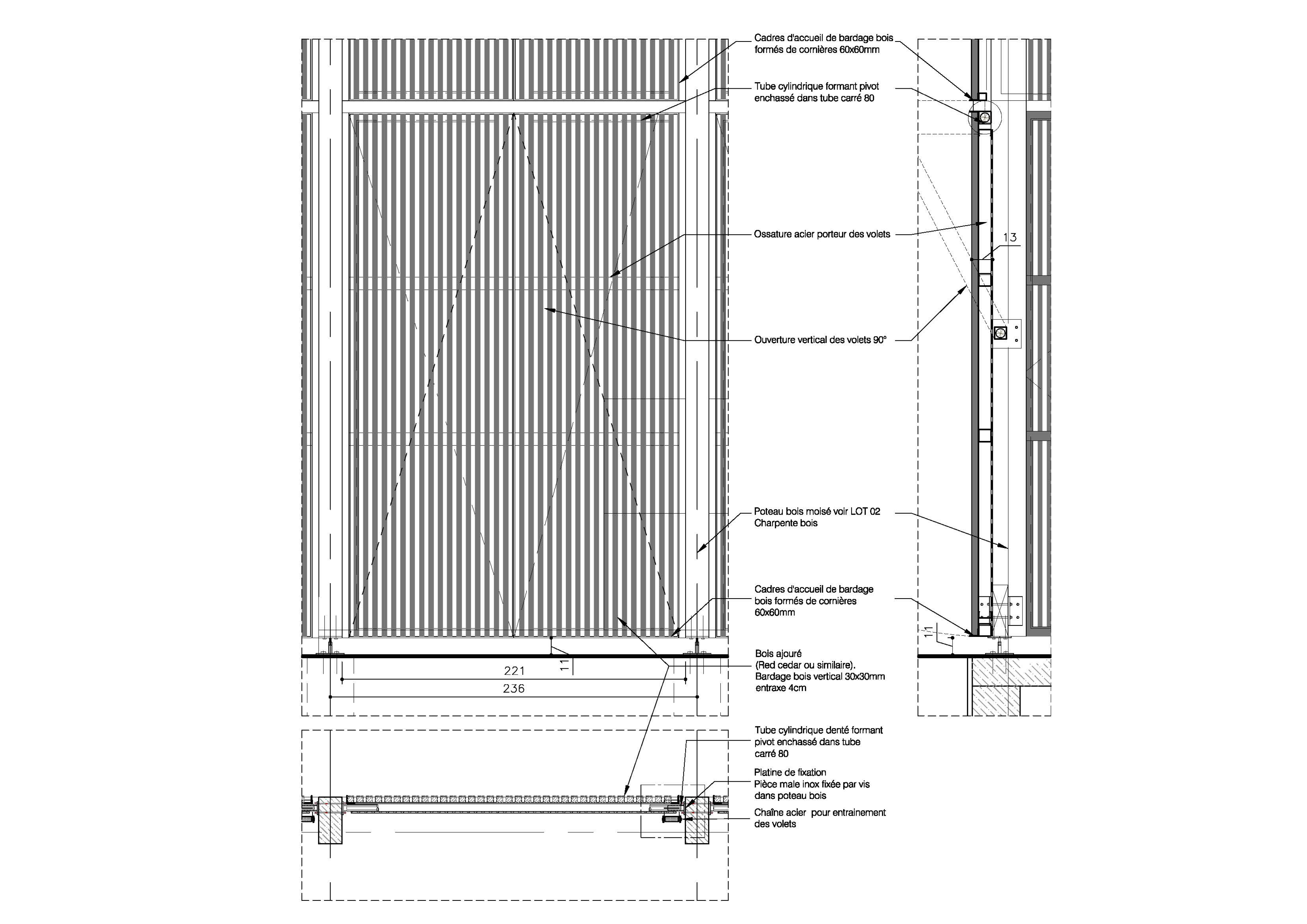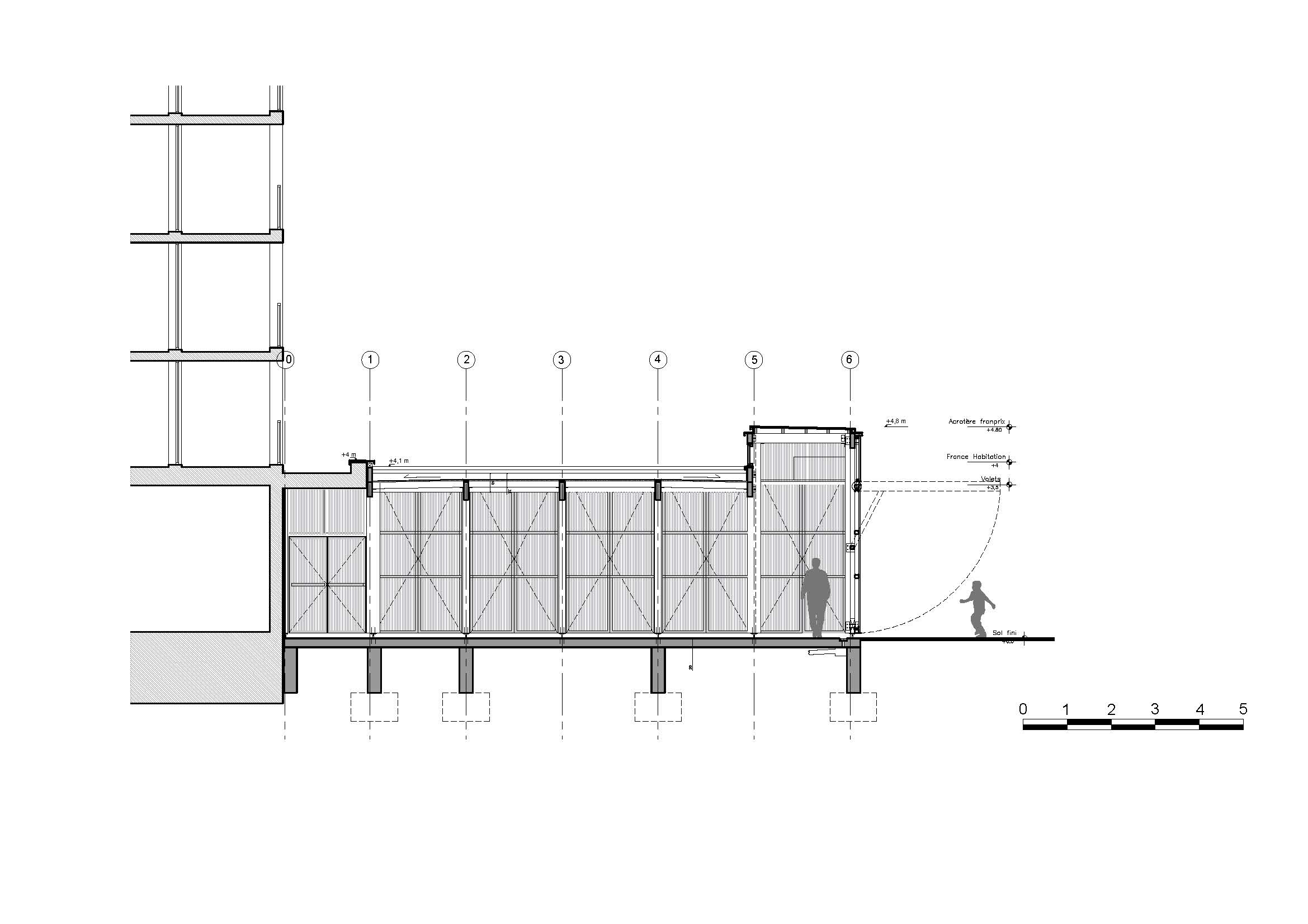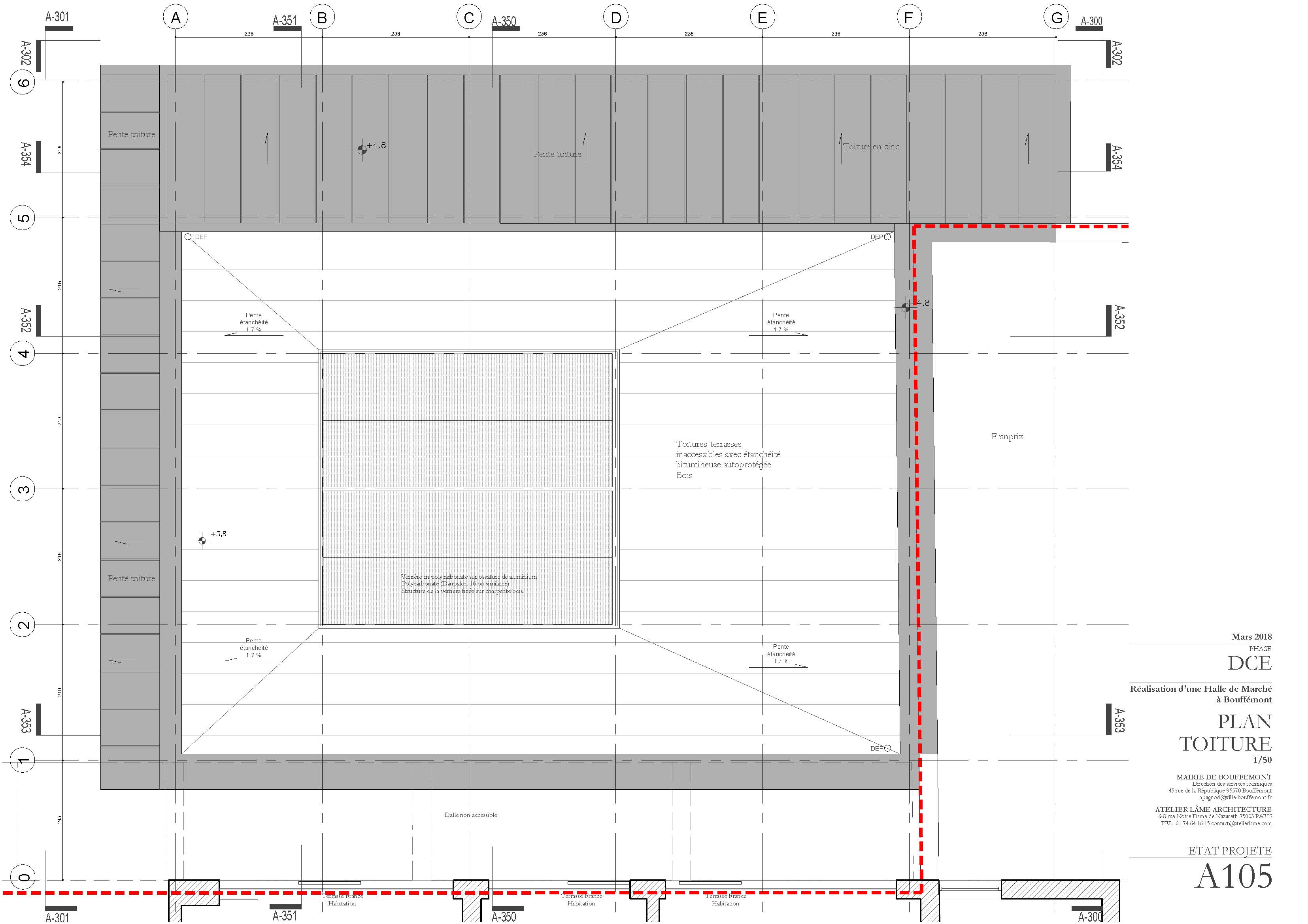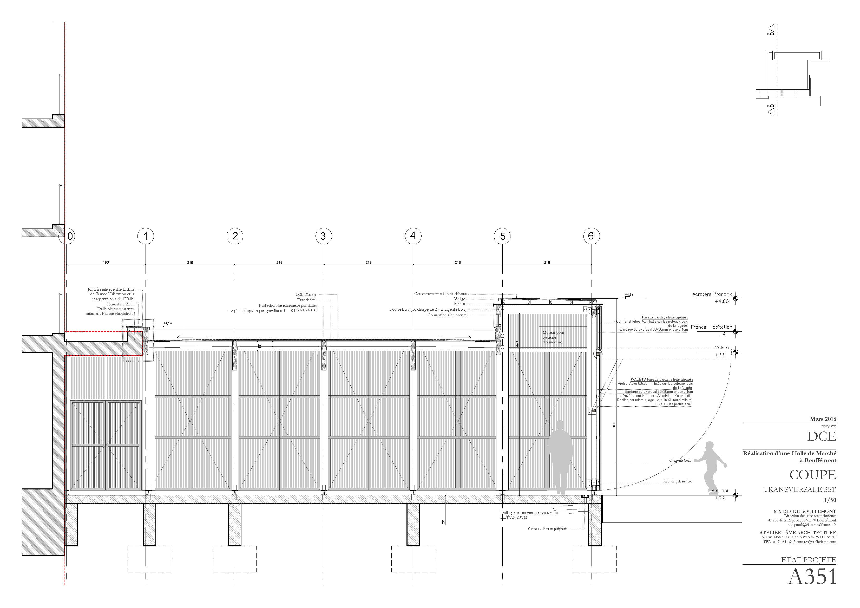 Descriptif technique : La halle de marché répond à un programme précis composé d'échoppes fixes, des échoppes temporaires, ainsi que des locaux annexes. Le plan d’agencement a été pensé afin d’offrir une grande modularité. L’emplacement des marchands a été pensé de manière évolutive. La nouvelle halle de marché se situe très exactement dans un « coin », entre la place, le bâtiment France Habitation et le magasin Franprix. Nous avons avancé l’emprise du projet afin que la nouvelle halle soit visible de toute part.