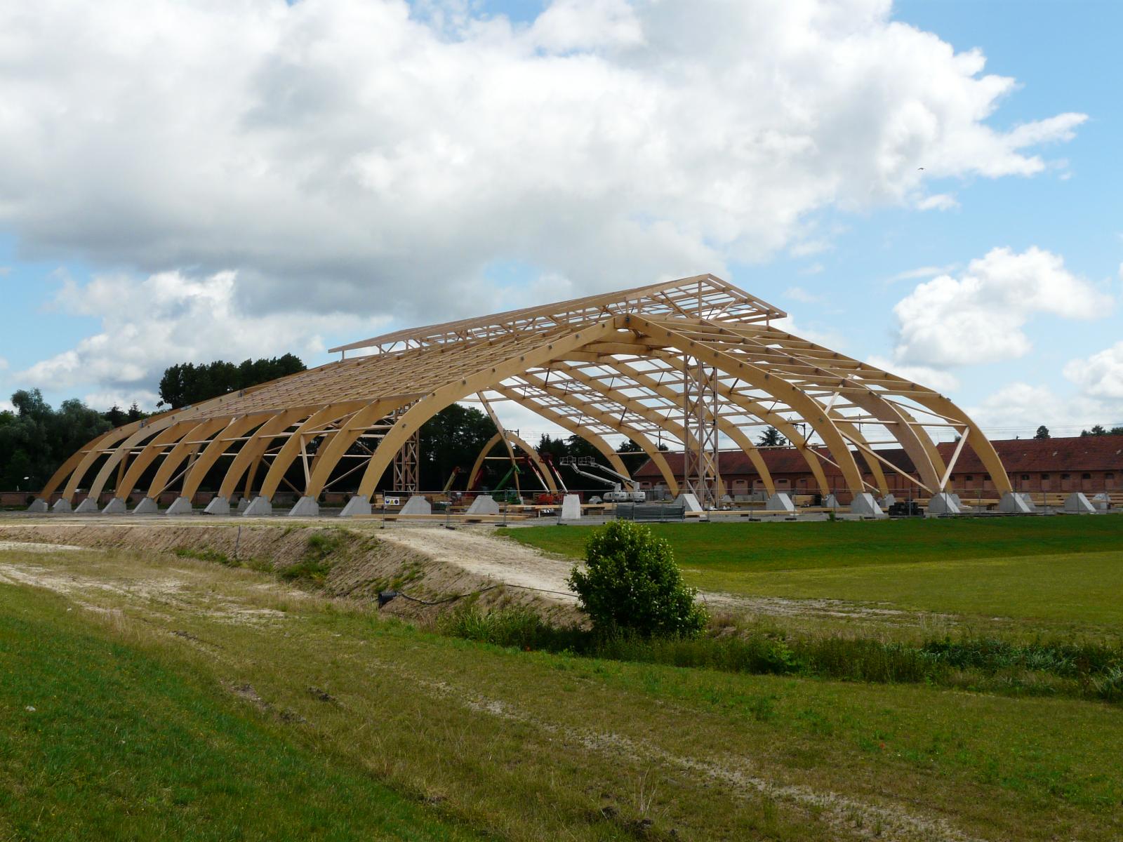 Descriptif technique : La structure primaire se compose de porteurs transversaux et longitudinaux sur une trame régulière de 10mx10m. La portance se fait autant sur les 80m que sur les 120m, grâce à l' alignement des pannes sur la trame de 10m pour équilibrer les poussées des arcs empannons, et à la mise en charge de la structure de manière uniforme, d'où l'étaiement des arcs par 2 tours en bois temporaires. Les portiques sont moisés et assemblés par couronnes de boulons d'1m de diamètre. Les pieds d'arcs reposent sur des plots béton inclinés avec articulations matérialisées à grain.