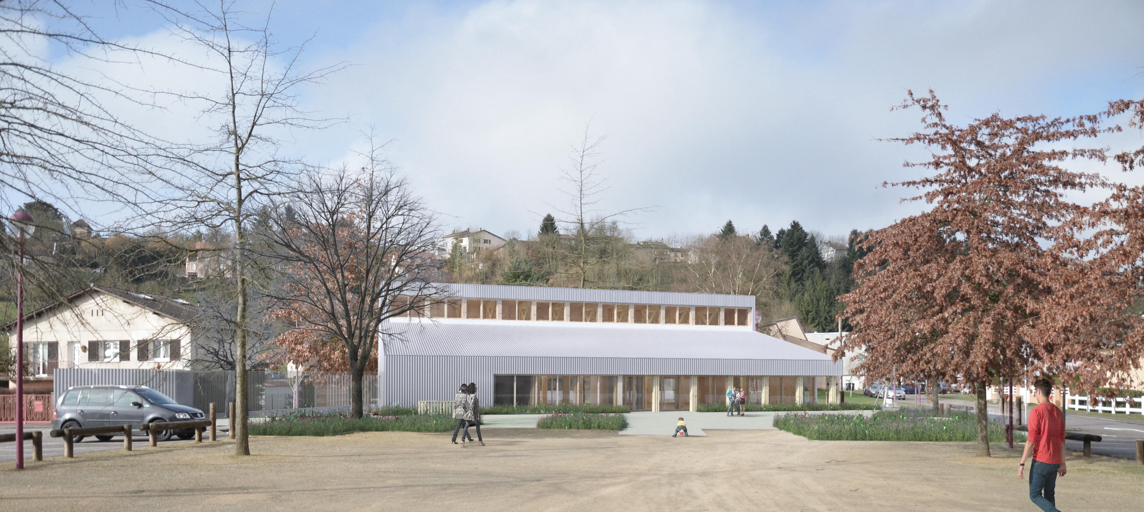 Approche environnementale : Pour cet équipement, la structure et les habillages sont en bois d'essences et de natures différentes. Les isolants sont biosourcés (panneaux de laine de bois et laine de bois insufflée).