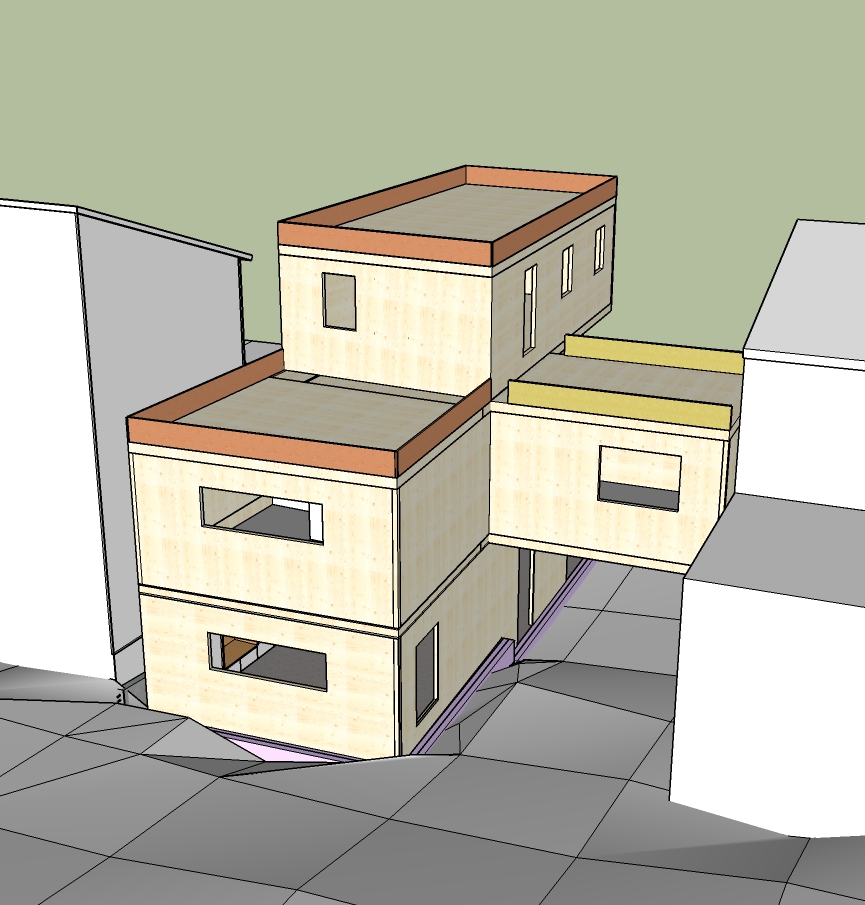 Maison réalisée en panneaux de bois massif, murs et planchers Aménagement intérieur en CP peuplier et CP bouleau mélaminé Façade intérieure du niveau RDC intégrant la cuisine, l'escalier, les rangements, vestiaires,niches décoratives et banquette.