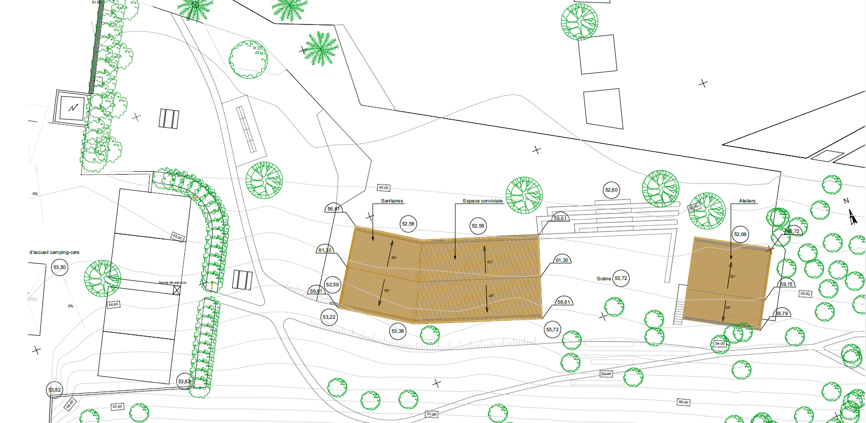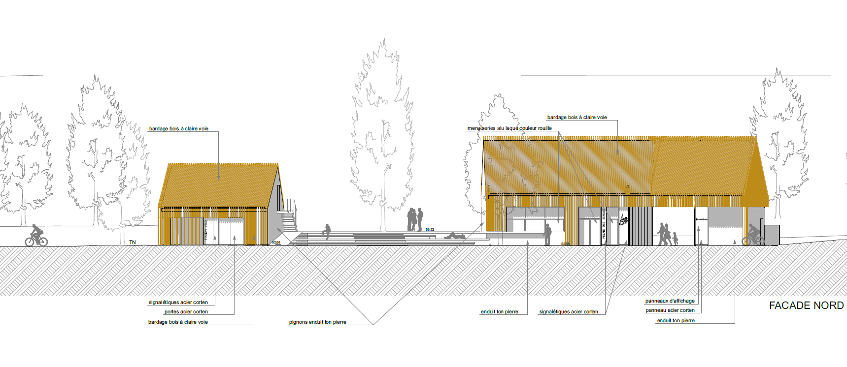 Le site est équipé de 2 bâtiments, adossés au coteau et reliés par un espace scénique de plein air, libre d’accès. Les toitures sont recouvertes d’un bardage à clairevoie qui reprend le sens des troncs d’arbres qui les entourent. Le lien direct avec le Cher se fait avec un ponton de pêche et une cale à bateaux, jumelé d’un ponton. une aitre de jeux en bois accueille les enfants. Le site est entièrement accessible aux personnes à mobilité réduite.