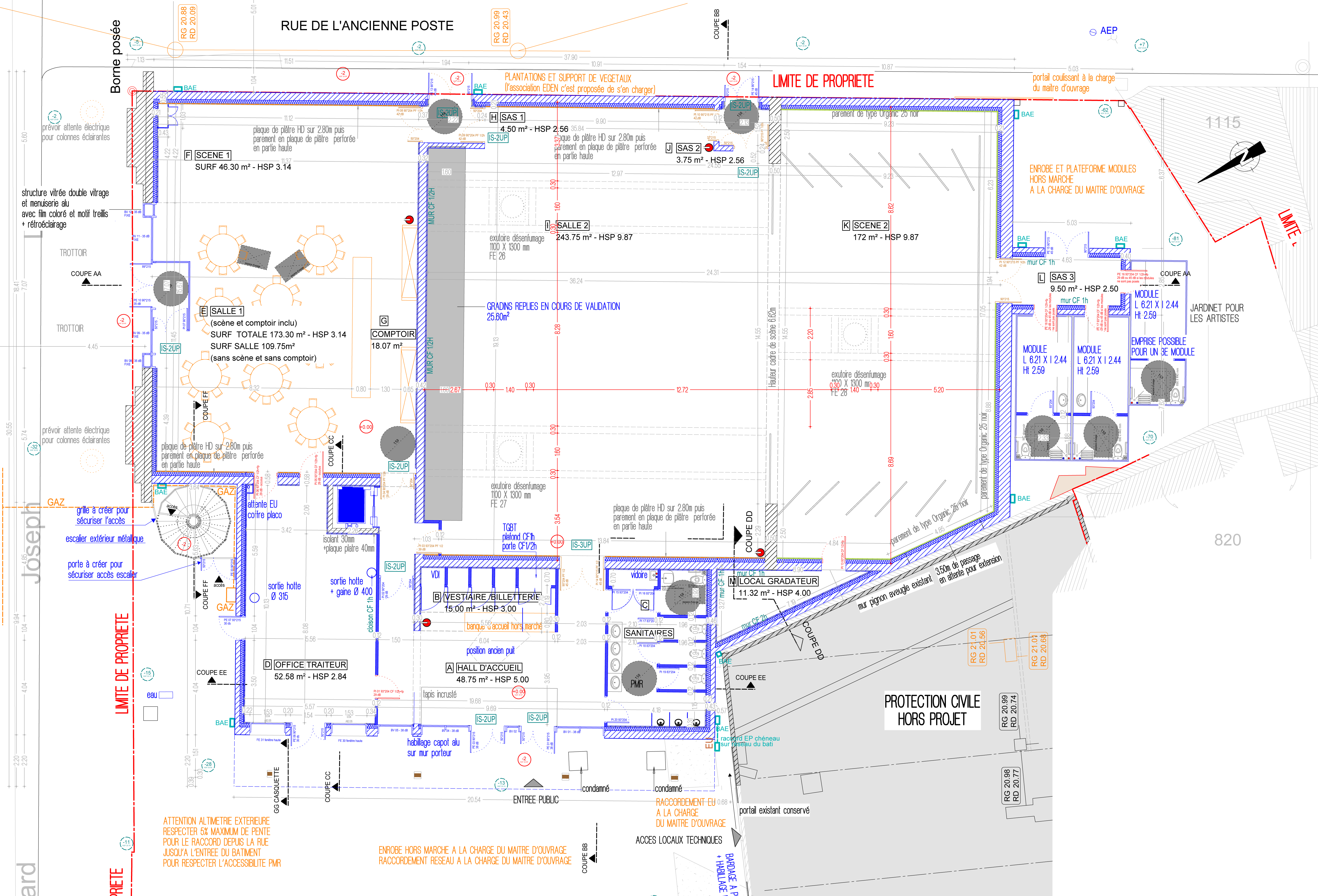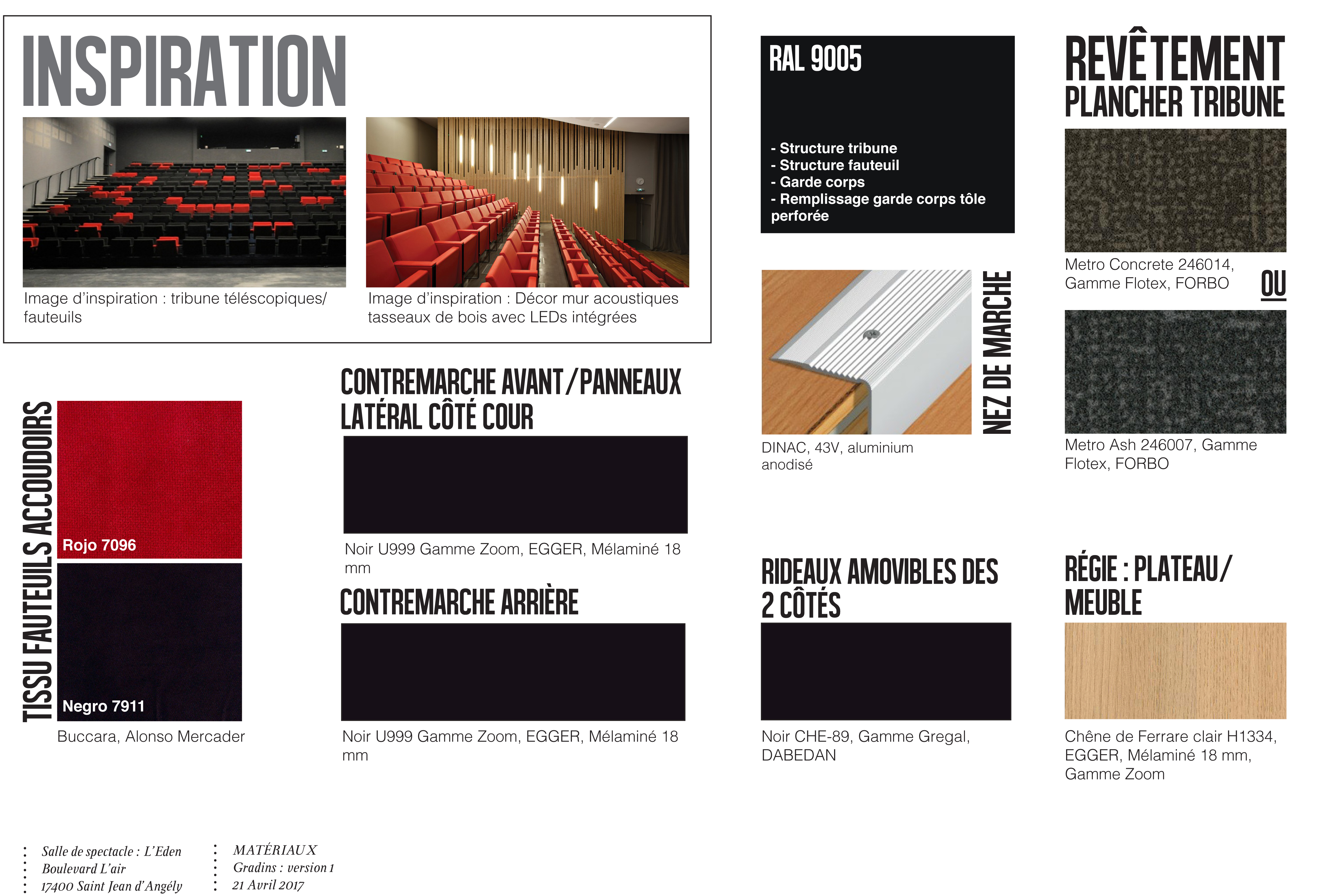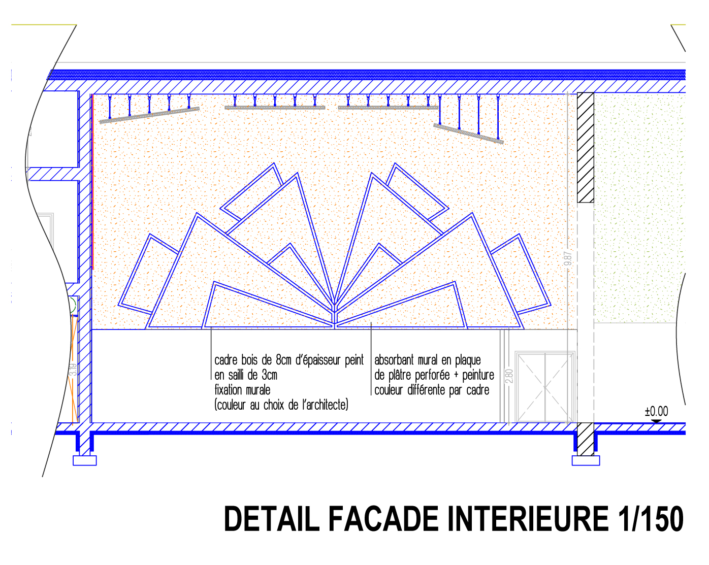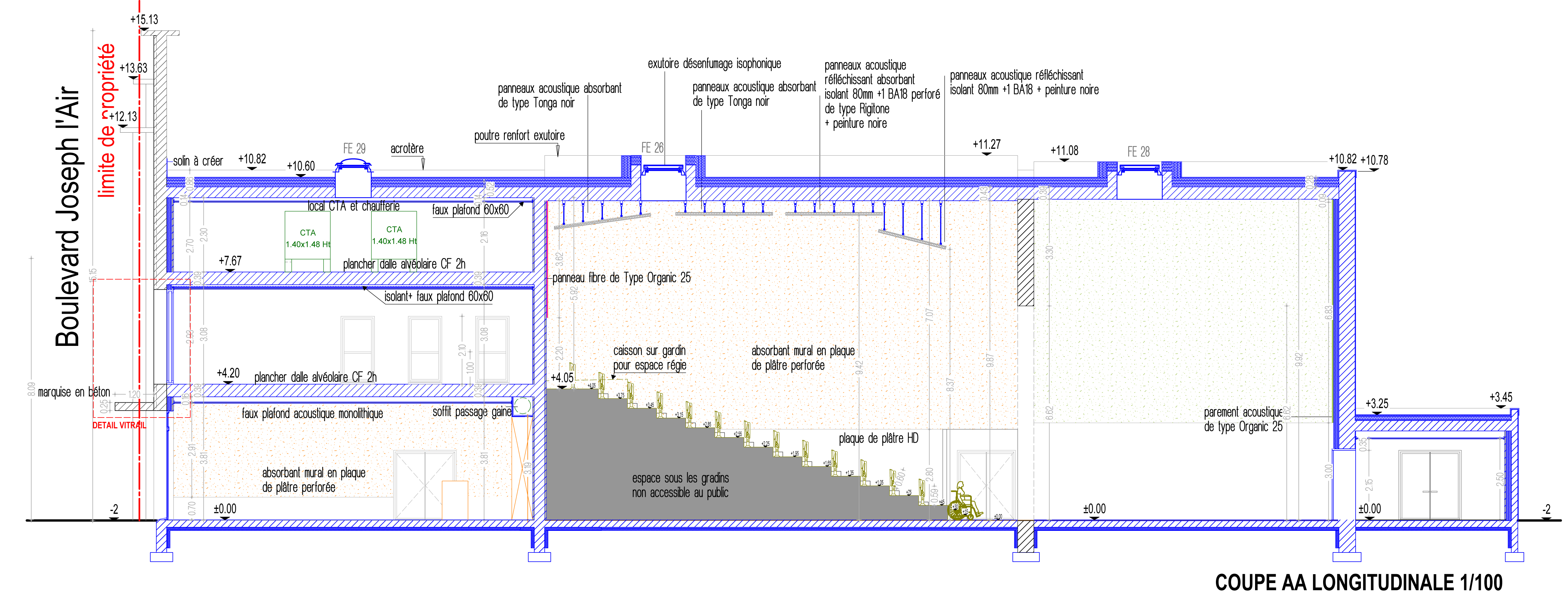 Descriptif technique de l'aménagement : Pour la zone plafond, l'absorption acoustique est assurée par la mise en œuvre d'un panneau isolant recouvert d'un tissu noir (marque Texaa). Pour les murs, des lames en bois massif sont fixées verticalement, sur des panneaux bois perforés. Leur position et la distance entre ces lisses est différente de manière à moduler le son et assurer l'acoustique de la salle. Les fauteuils en mousse ont également leur rôle à jouer dans le processus. Ils permettent d'améliorer le confort acoustique interne de la salle. Le parquet de la salle est en hêtre 22mm (marque Junckers) avec une sous couche acoustique de 10mm.