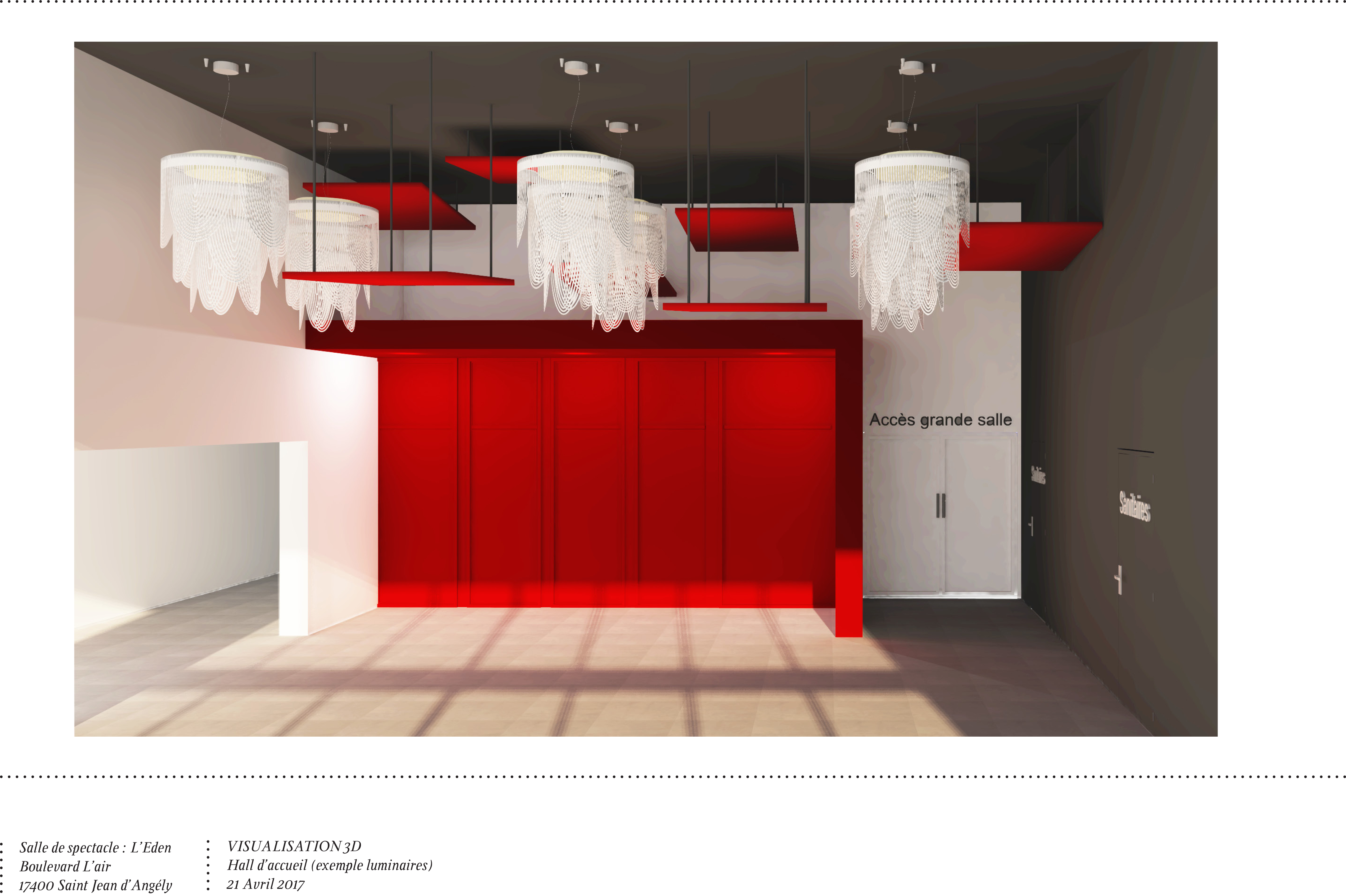 Le projet de construction de la salle de Spectacle située sur la Commune de Saint Jean d'Angély a nécessité une réflexion sur l'acoustique générale de la salle. L'objectif a été de traiter l'acoustique de manière esthétique. Des lames de bois fixées sur un isolant acoustique sur les murs latéraux de la salle assurent l'absorption des sons.