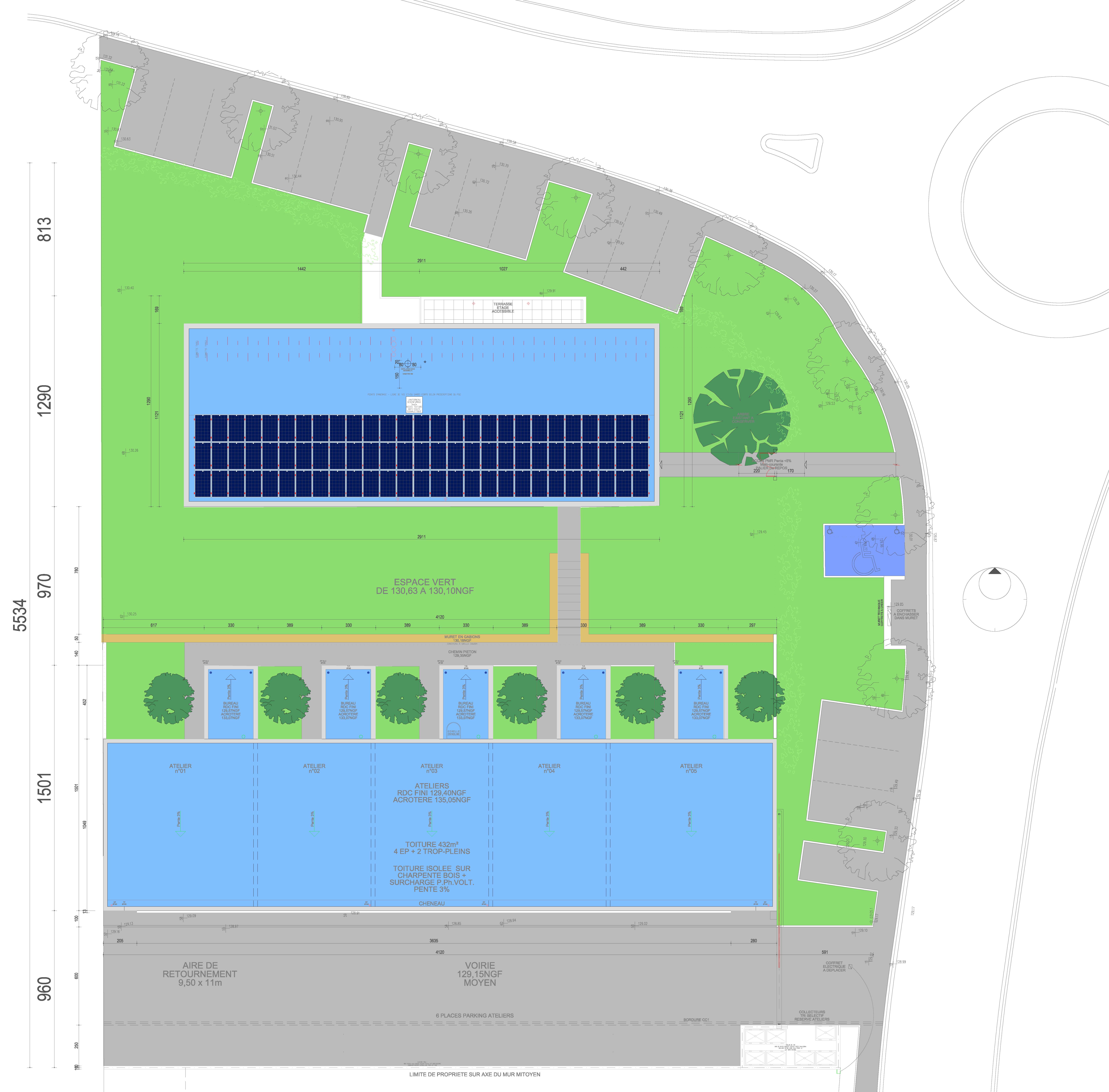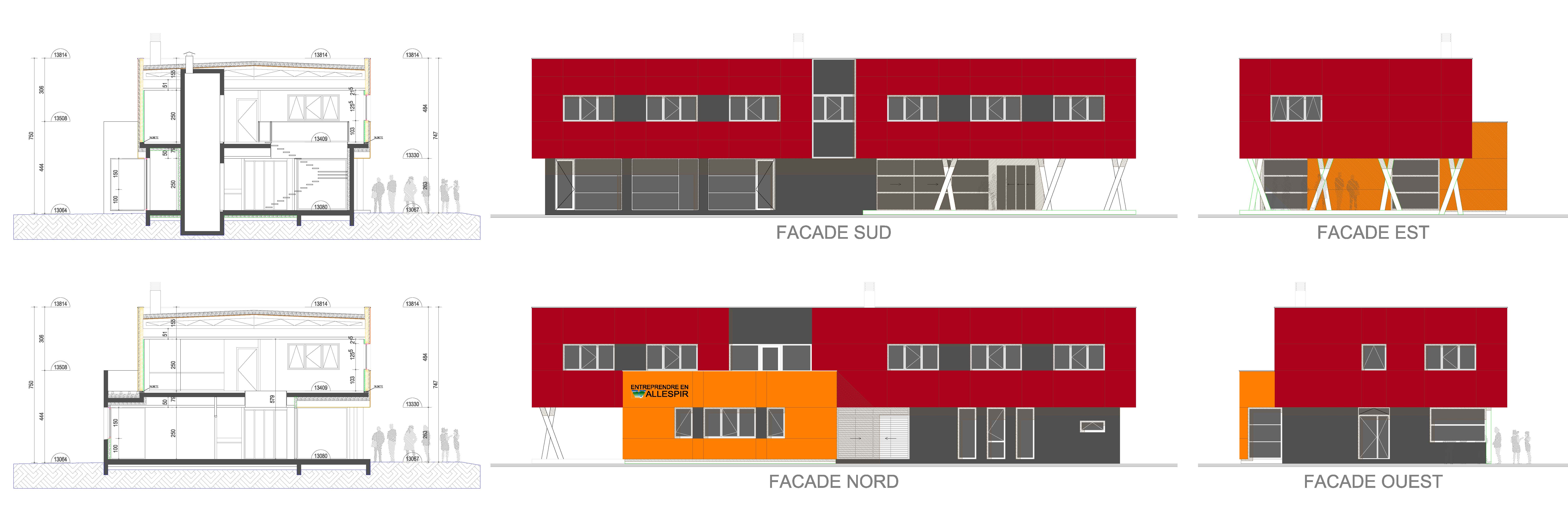 Approche environnementale : Ce projet doit avant tout résister sans entretien particulier à des locataires nombreux, aux compétences multiples pour des durées limitées (2 à 3 ans maximum). D'autre part, il fallait diminuer le plus possible le prix des charges locatives. Nous avons opté pour des RDC en béton banché peint et l'étage en ossature bois avec des charpente bois. Les isolants sont en laine de bois. Cela a permis de réaliser une enveloppe bâtie saine orientée Nord/Sud à forte inertie à laquelle est intégrée une VMC double flux et un CVC air/air. L'ensemble géré par une GTC. Ensemble alimenté par 130 m² de P.V.