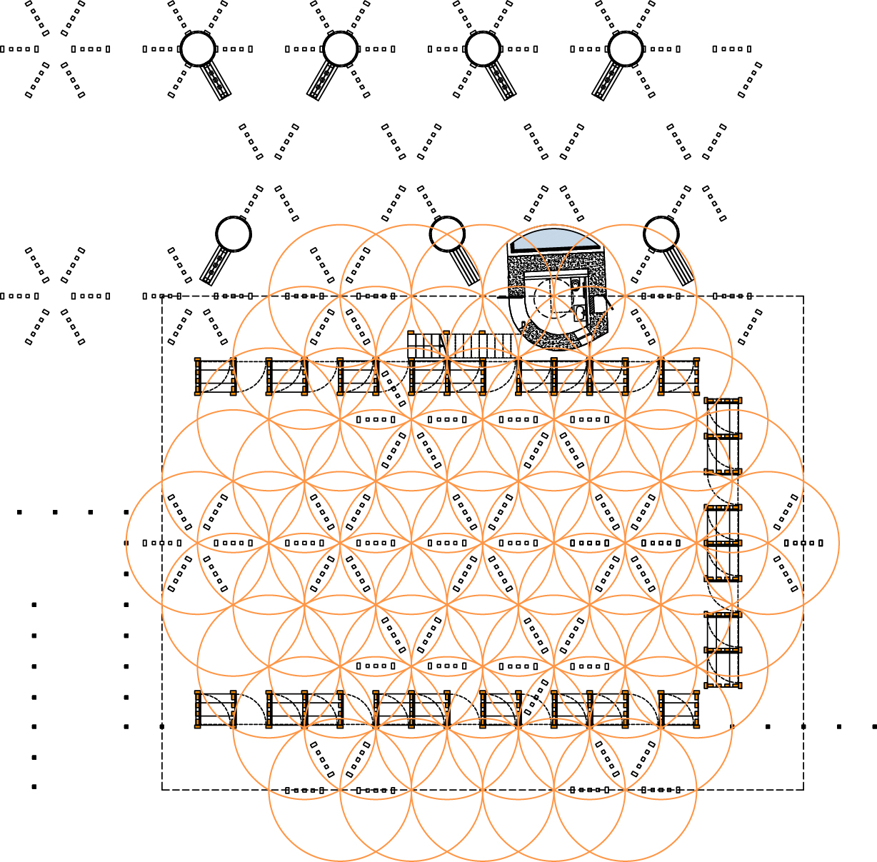 Descriptif technique : L’usage de bois local, donc massif, a fait opter pour des sections multiples (pour poteaux et arbalétriers), qui sont de la même composition. Le bois Douglas est apparu comme le choix les plus approprié pour répondre aux critères : bois local, classe 3, longueur des bois et prix. Les volets qui ferment au-dessus des assises périphériques, sont en bois contrecollé massif épicéa. La forêt des 237 poteaux se termine en une frondaison de près de 200 arbalétriers et arêtiers, entre lesquels filtre la lumière. Les feuilles de cette forêt, ce sont les 24000 tavaillons de bois de châtaigner refendu. PEFC (Gestion forestière durable) FSC (Gestion forestière responsable)