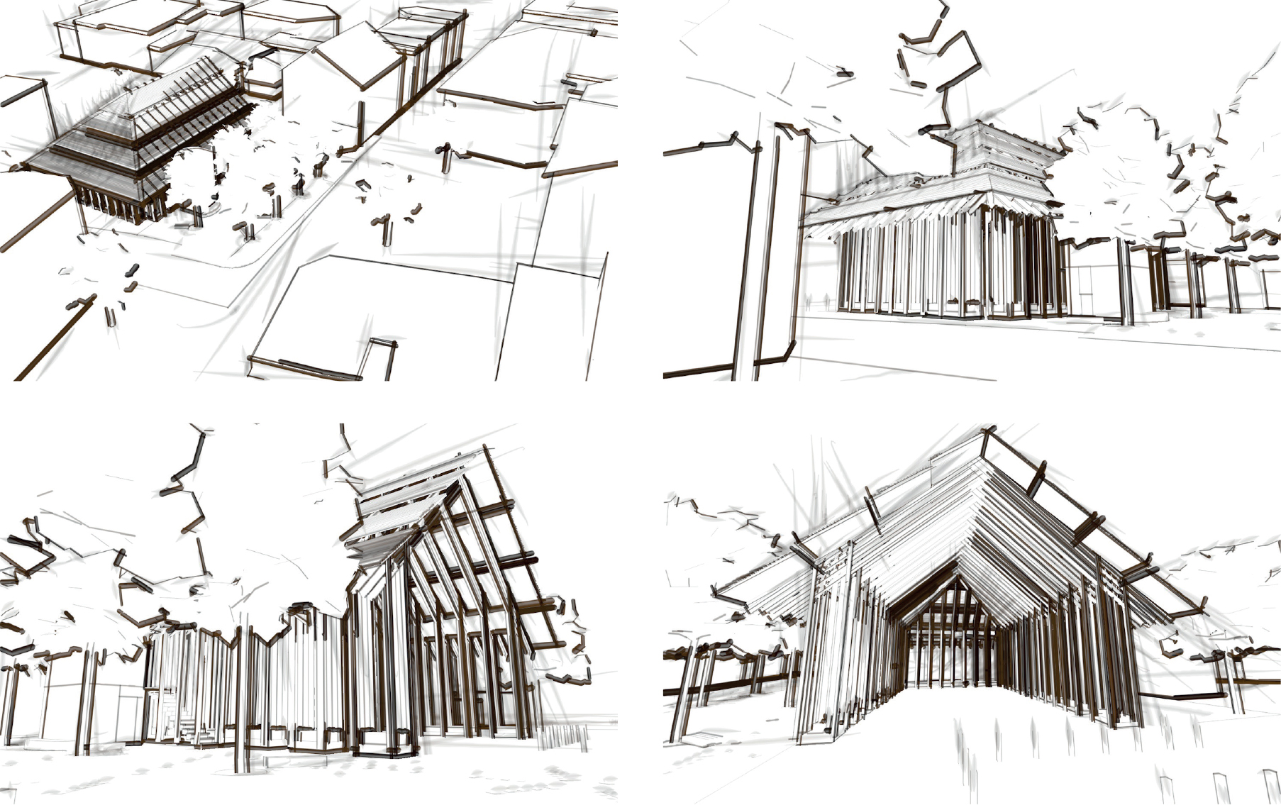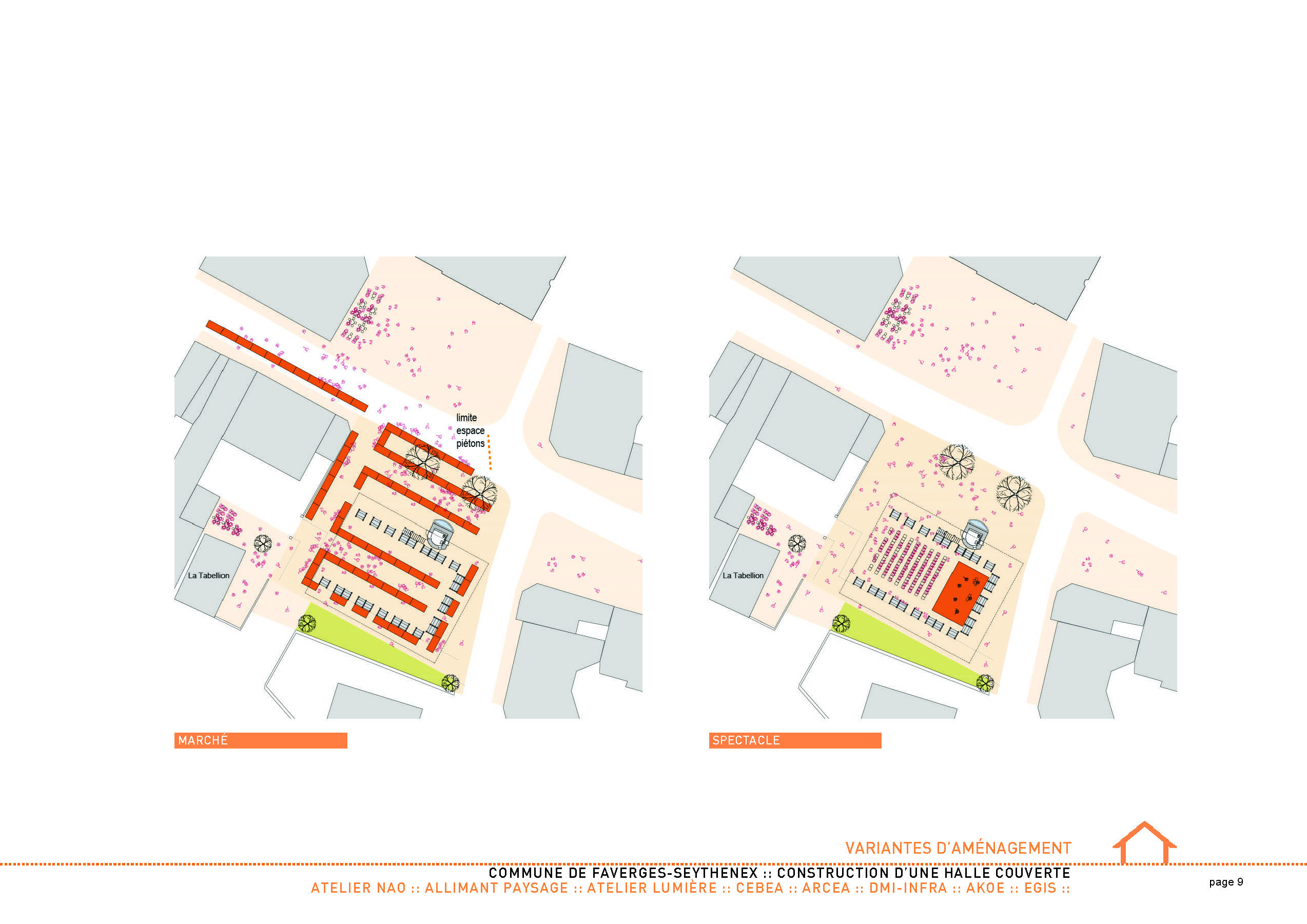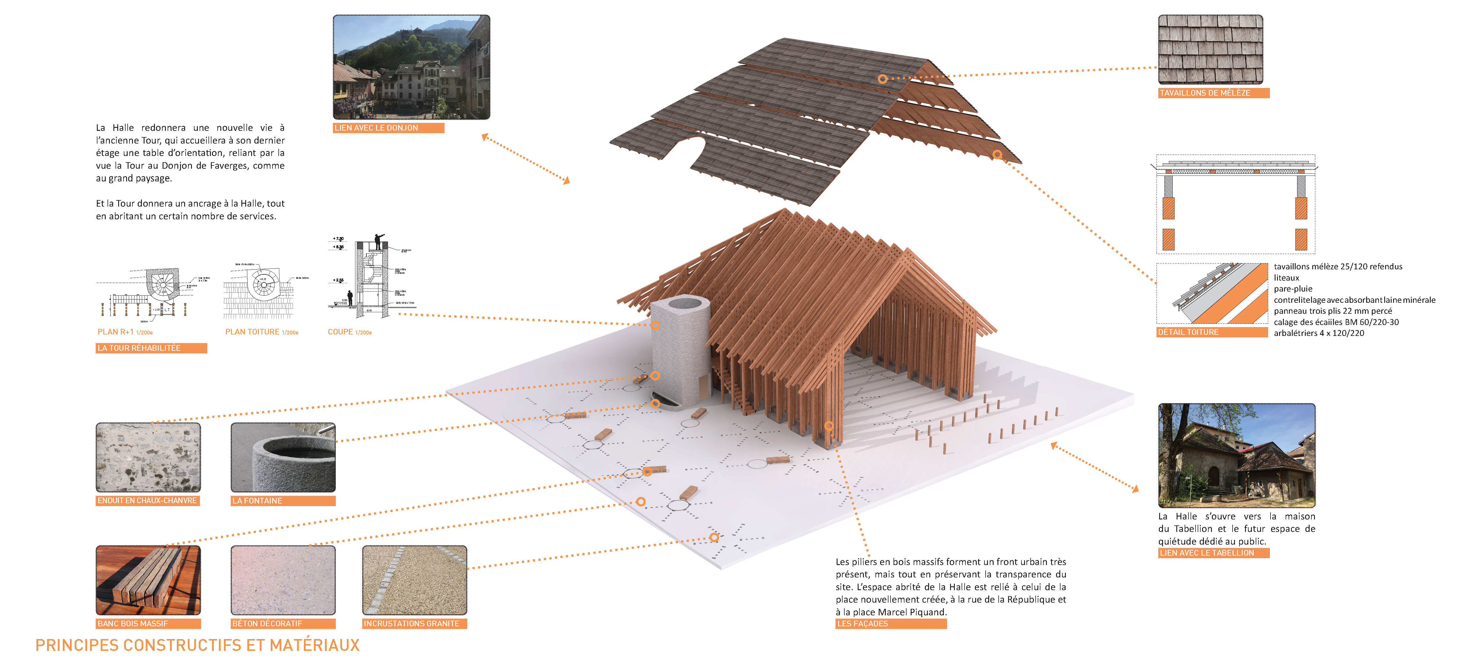 Approche environnementale : La Halle s’inscrit dans la trame urbaine de la ville avec ses rues concentriques et radiales organisées autour d’un centre absent : le donjon là-haut. En même temps, elle subvertit cet ordre millénaire (ici le marché se tient depuis 1293) en créant ce qui sera le centre vital de la ville. En plein centre, donc, de la ville de Faverges-Seythenex, sous son large toit, la halle est un lieu de vie public. Elle se traverse de part et d’autre mais invite également à s’installer sur un de ses nombreux bancs.