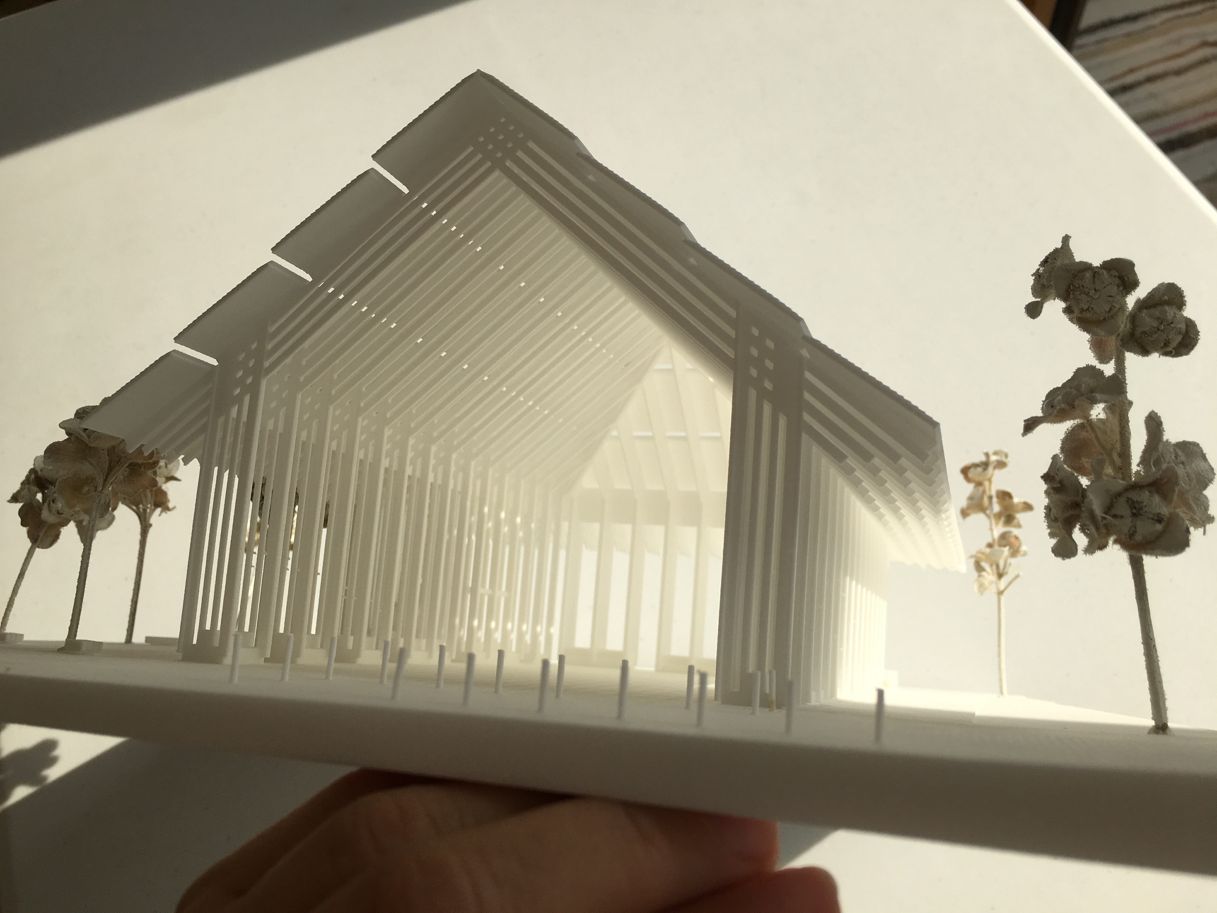 Une halle culturelle et économique: 1. Elle peut se transformer en salle de spectacles avec sa scène rétractable et la possibilité de fermer les grands volets en bois sur trois de ses faces. 2. La Halle accueille les marchés hebdomadaires, des petites représentations et des bals. Son langage architectural est fort et calme, s’imposant sans écraser, présent mais avec simplicité. Il provient d’une double nécessité : créer un front urbain et en même temps ménager une grande transparence : ceci a conduit à la création de poteaux composites, massifs, et interceptant la lumière de multiples arêtes.