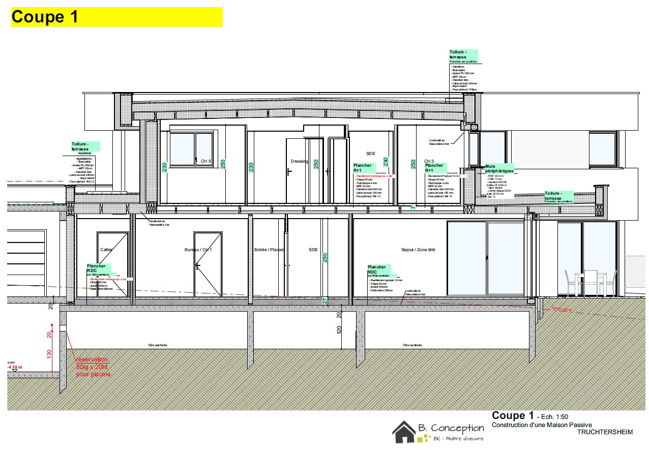 Approche environnementale : Le principal atout environnemental de cette maison est sa très faible consommation en énergie, puisqu’elle répond au critère du Passivhaus Institut (label obtenu en janvier 2020). La maison n’a besoin que de 11 kWh/m² par an pour être chauffée. La maison est principalement isolée en laine de bois (sauf support de crépis extérieur en PSE et support d’étanchéité en PU)