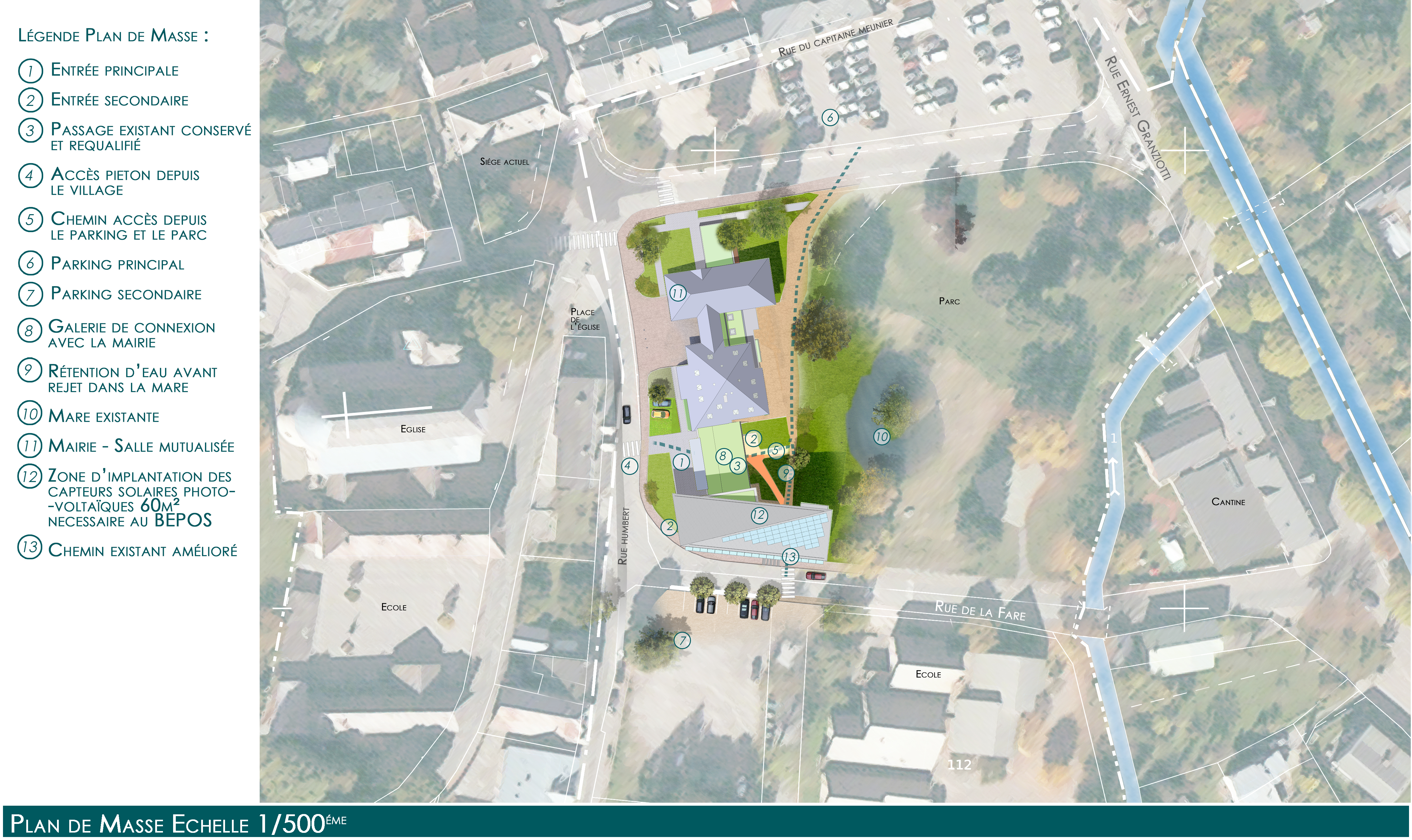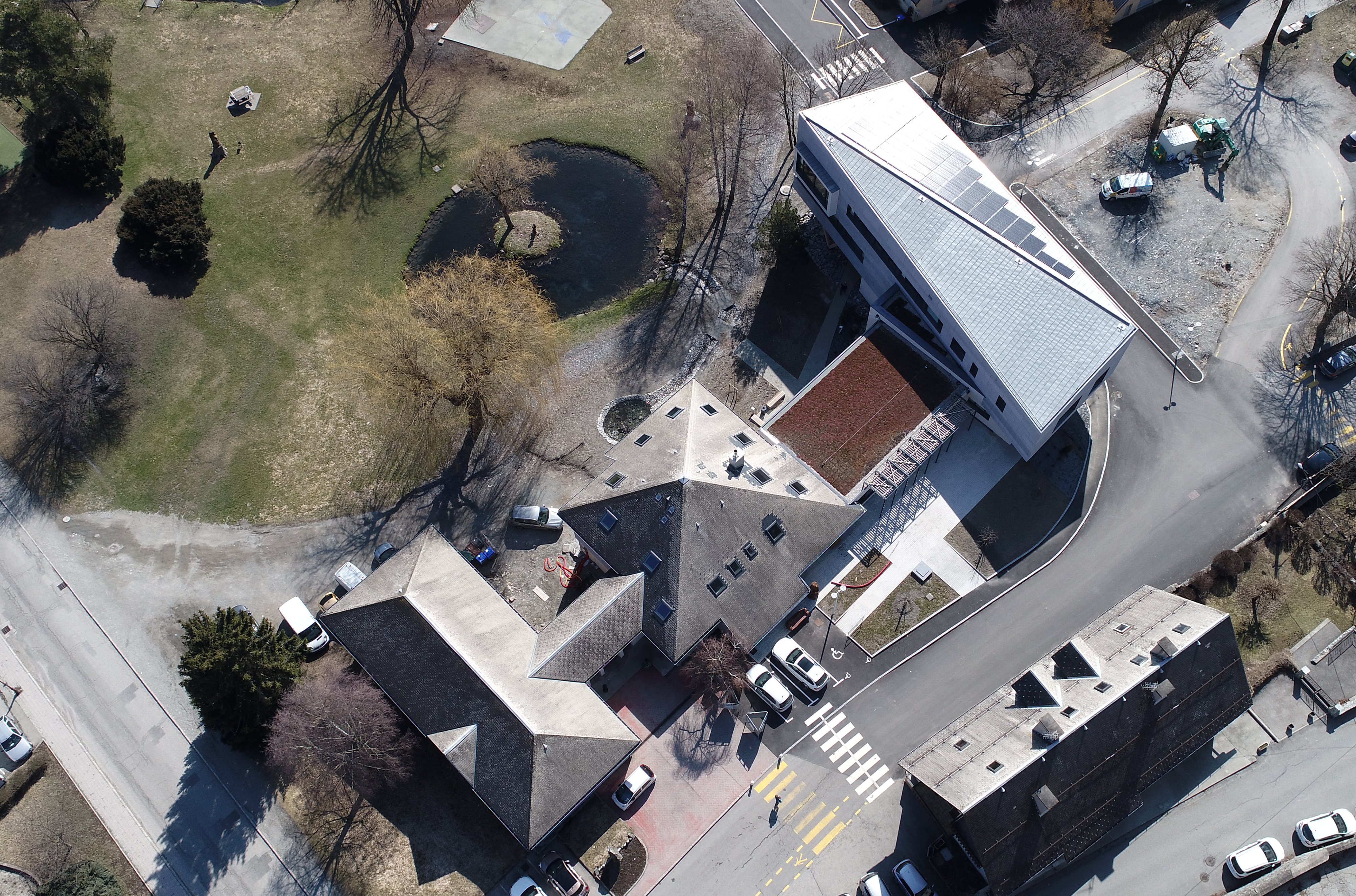 Approche environnementale : 200 m3 de bois sur 2 niveaux, avec sept essences différentes. Eléments lamellé-collé, bois massif et bois de parement certifiés Bois des Alpes (60% du volume total). Bois techniques, panneaux de CLT et poutres en LVL en bois non locaux mais certifiés PEFC. Isolation thermique et acoustique en isolant bio-sourcé (coton recyclé Metisse). Centrale photovoltaïque (9KWc) en toiture et en brise soleil. Chaufferie bois mutualisée avec la mairie voisine. Rafraîchissement d’été passif par inertie du plancher bois-béton, mise en oeuvre de BSO sur façade et ventilation naturelle nocturne et traversante. La mutualisation communauté de communes/mairie est également un élément environnemental fort.