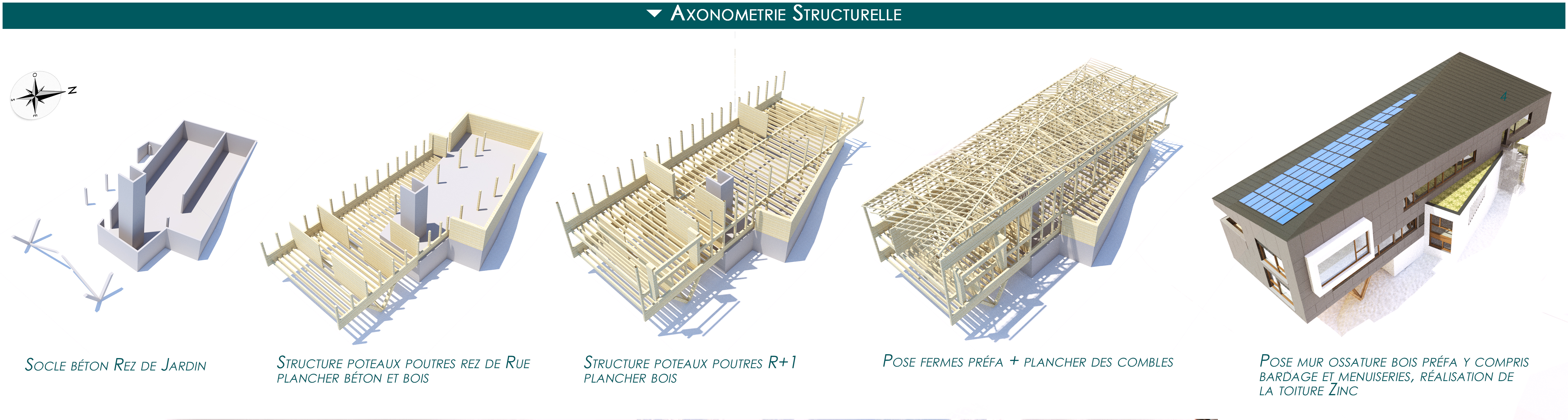Descriptif technique : Trois files porteuses principales supportent les planchers et toitures en travée et sur le porte-à-faux. Ces façades ont une portée en travées et en porte-à-faux réduites par les poteaux du rez-de-parc, disposés en V. En toiture, des fermes triangulées forment un volume de comble et assurent l’homogénéisation des déplacements entre les trois files porteuses. Un système de pannes/chevrons porte entre fermes le complexe de toiture froide doublement ventilé type toiture de montagne. La structure des planchers, bois béton non collaborant, est constituée de CLT de faible épaisseur, nervuré par des poutres en bois lamellé-collé d’entraxe 80. PEFC (Gestion forestière durable) Bois des Alpes CTB P (Produits de traitement) NF Parquets Marquage CE NF Bâtiments Tertiaires Démarche HQEe Bâtiment Energie Environnemen