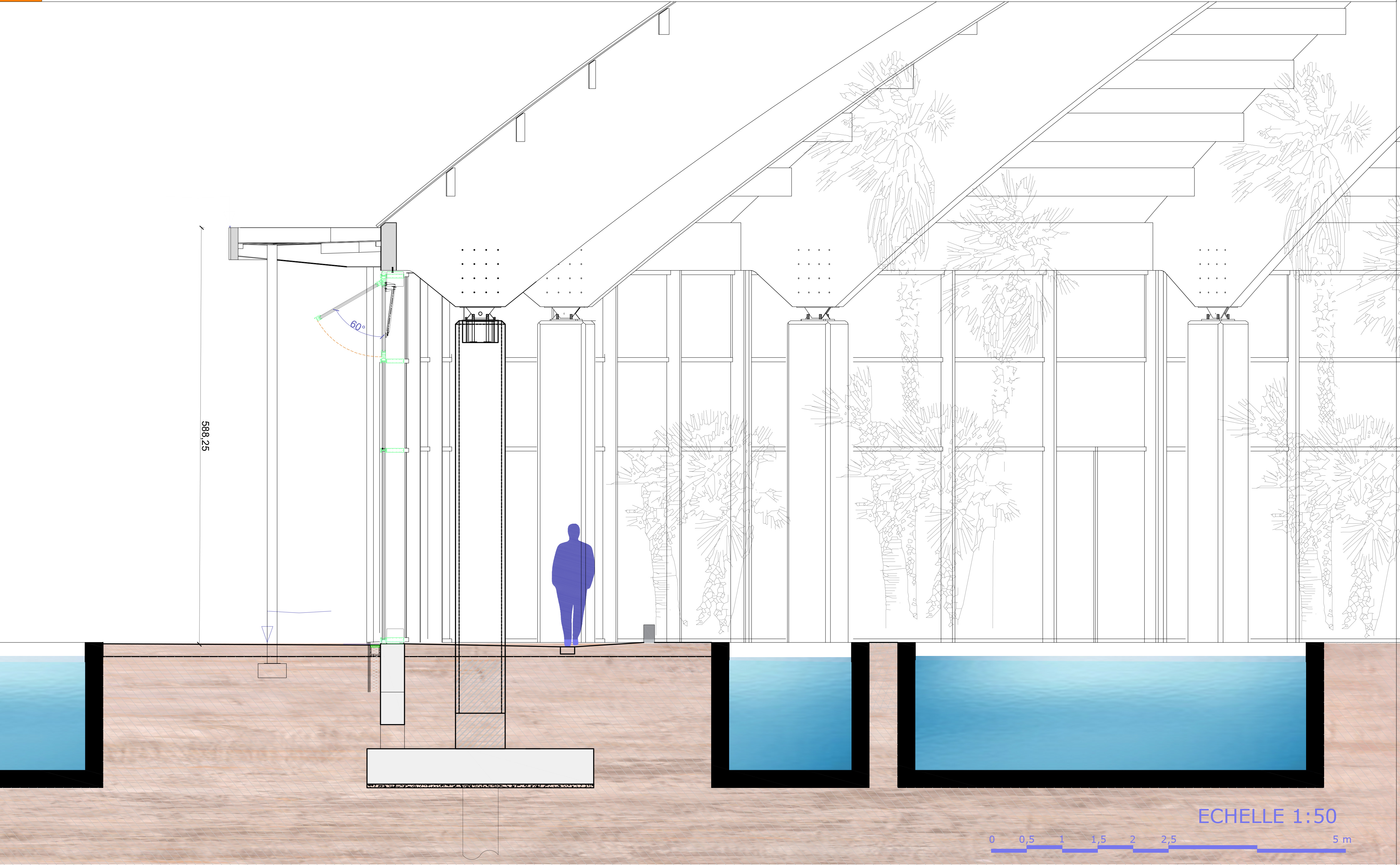 Situé à Epiniac, près de Dol-de-Bretagne, le Domaine des Ormes dispose depuis l'été 2019, d’un complexe aquatique couvert permettant de profiter des piscines tout au long de l’année. Ce dôme translucide est un ouvrage en bois de conception bioclimatique. L’idée, dès le départ, a été de créer un fût central en bois composé de 8 poteaux courbes formant une structure parapluie circulaire. Cet ouvrage, conçu comme une halle légère, couvre les piscines existantes sans que les structures des bassins ne soient modifiées. Le client souhaitait un projet circulaire et lumineux, sans surchauffe.