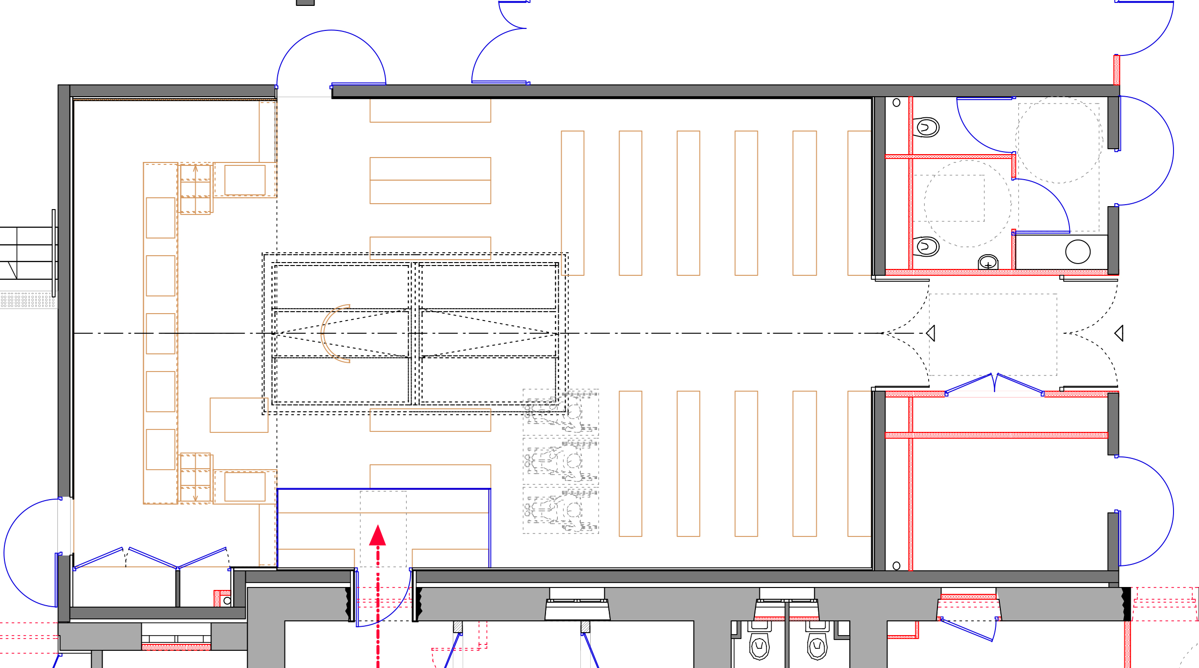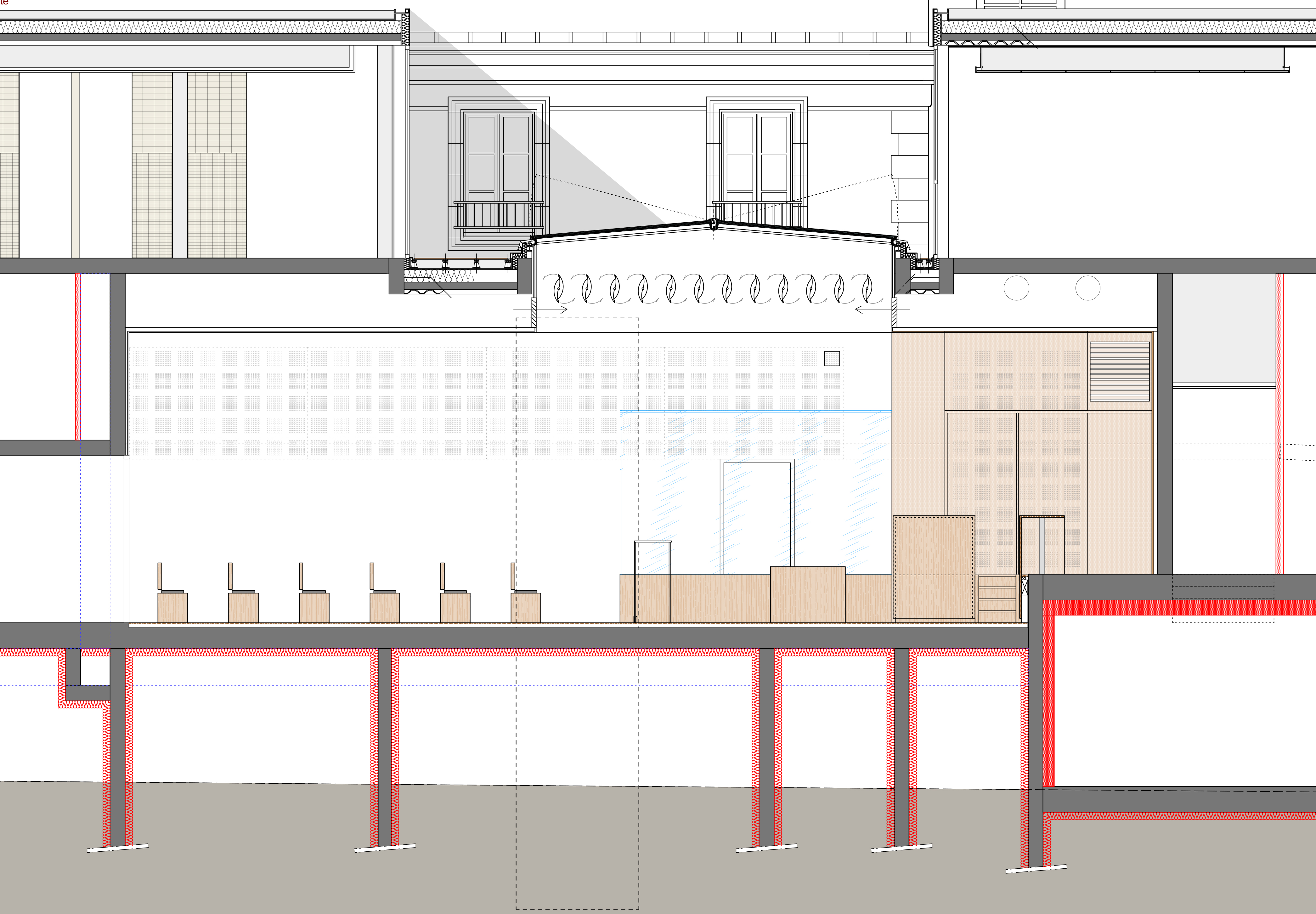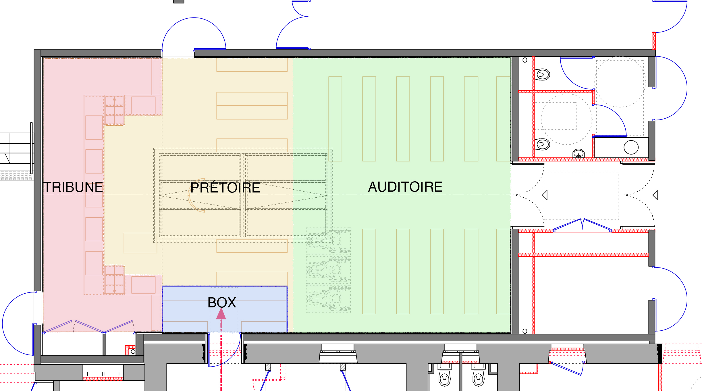 Descriptif technique de l'aménagement : L'aménagement de la salle pénale est organisé selon 4 espaces : l'auditoire accueillant les bancs publics, le prétoire comprenant les bureaux des avocats, la barre des témoins et la table des pièces à conviction, la tribune où prend place la table de justice, le poste de greffe et du ministère public, et enfin le box des accusés.
