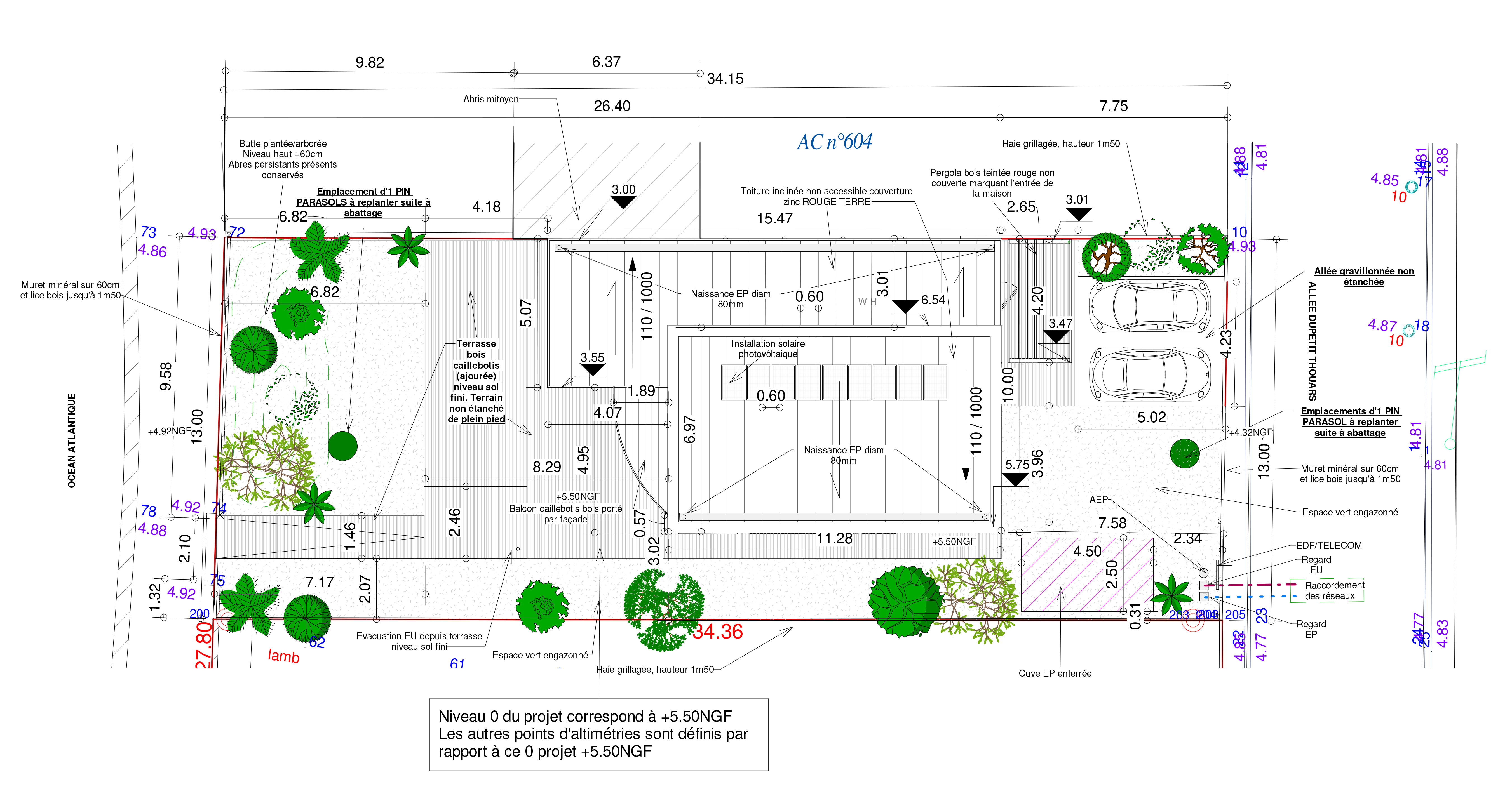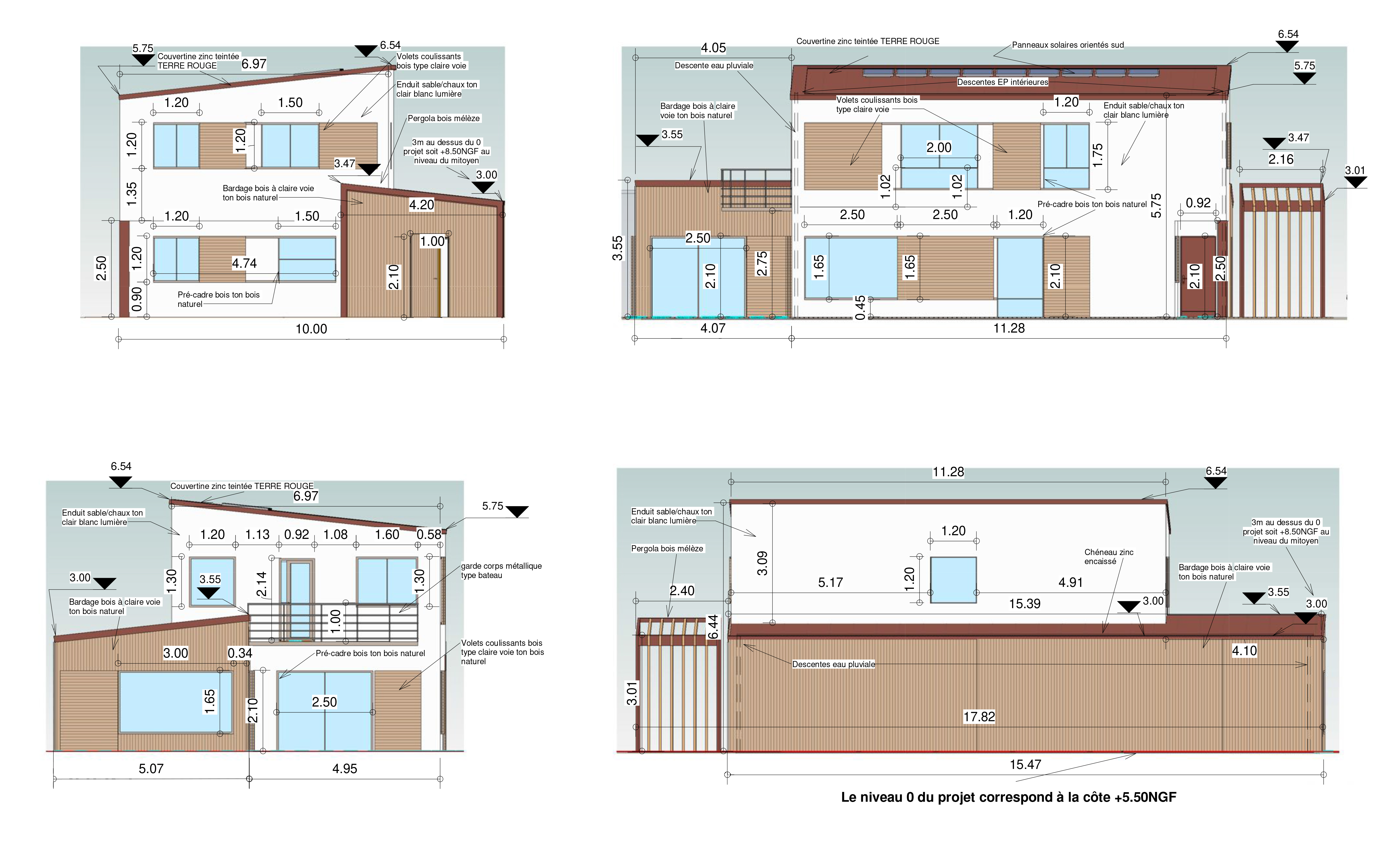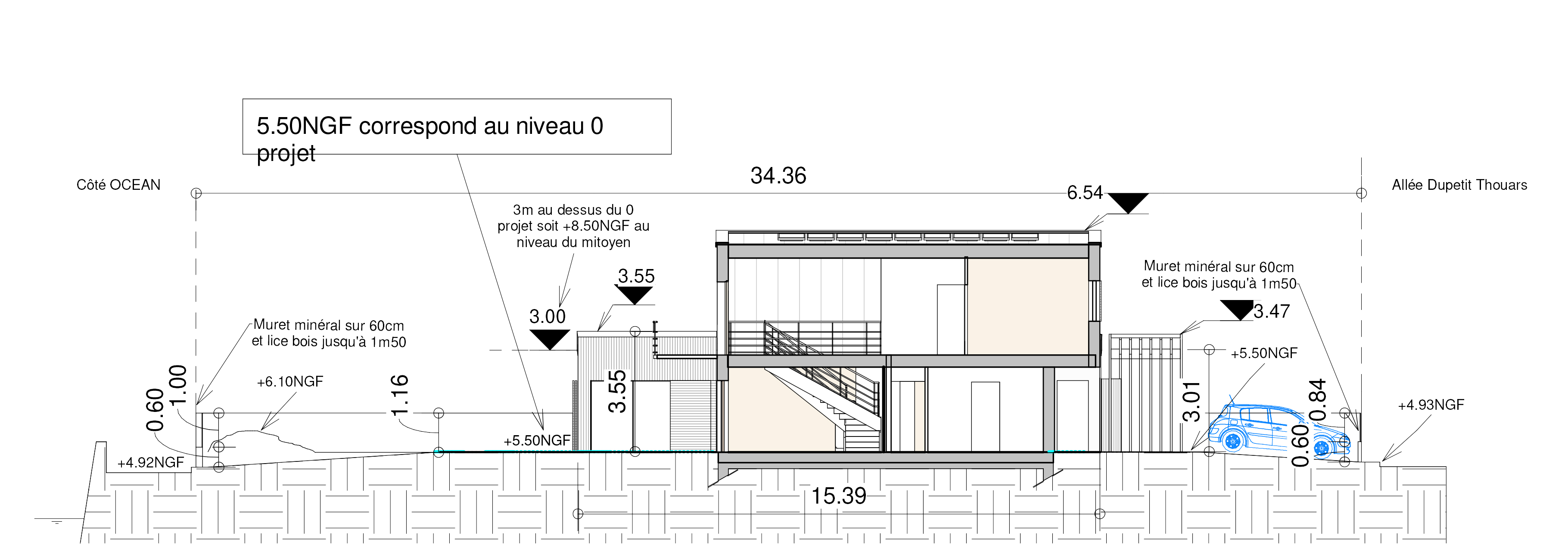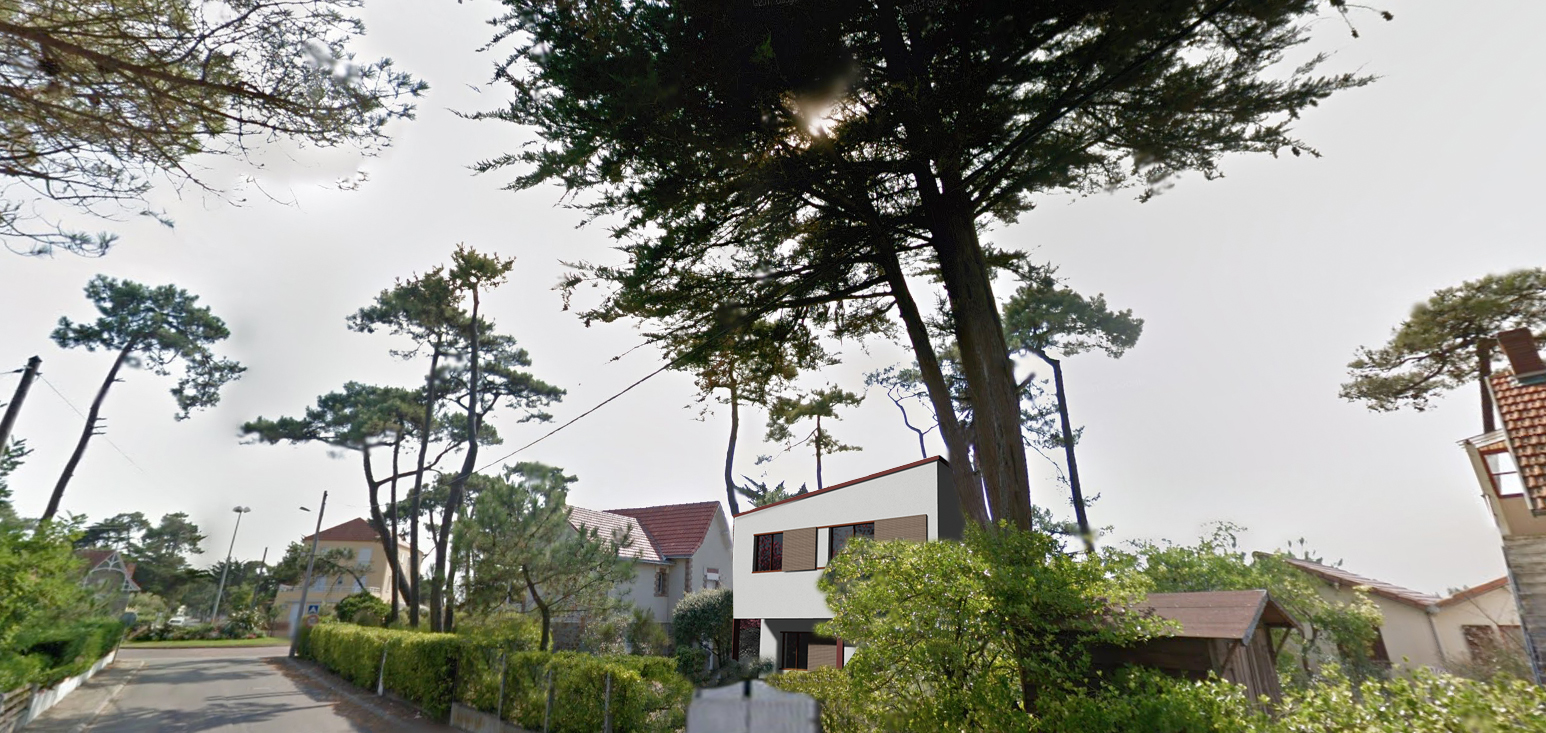 Au bord de l'océan et mitoyen d'une maison de style "villa balnéaire", le projet s'intègre à son contexte par l'emploi de matériaux bruts traditionnels (bois et enduit à la chaux en façade), ainsi que de zinc teinté couleur terre rouge en toiture en rappel des couvertures environnantes en tuiles. Les vues sont principalement cadrées vers le littoral et des prolongements entre intérieur et extérieur sont assurés à la fois par la continuité des sols en bois (planchers et terrasses) et par les baies vitrées, conçues de manière à dissimuler les dormants.