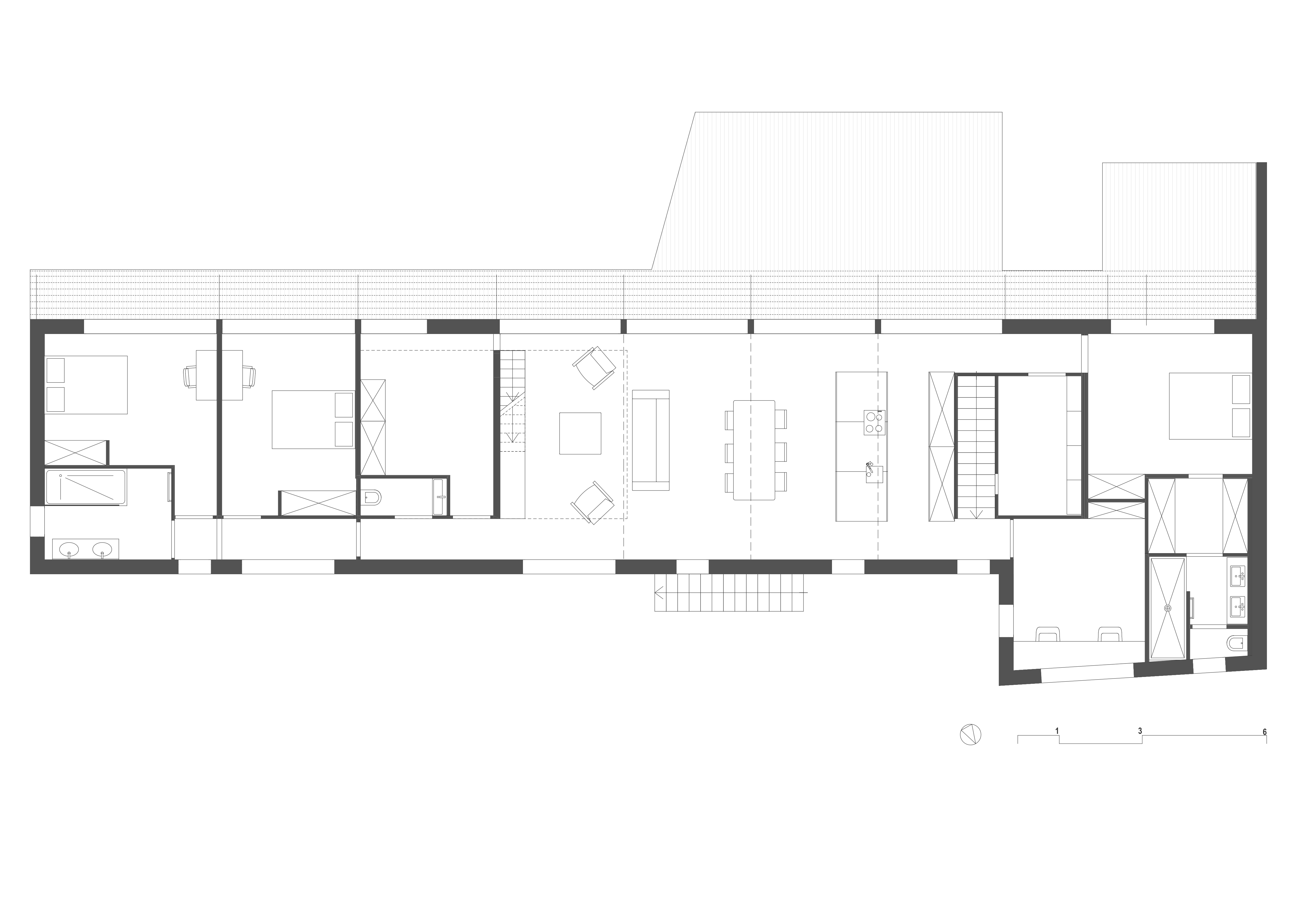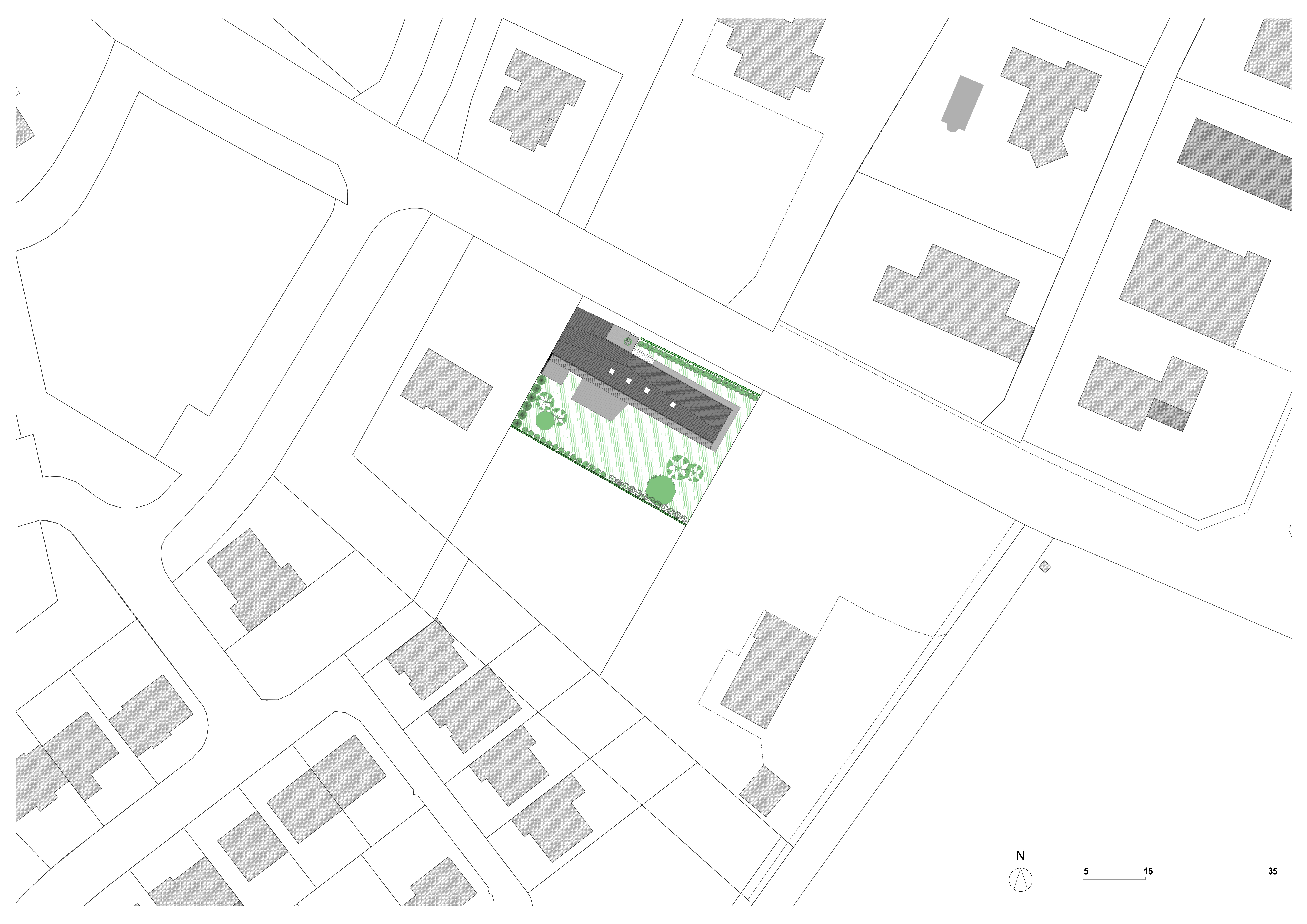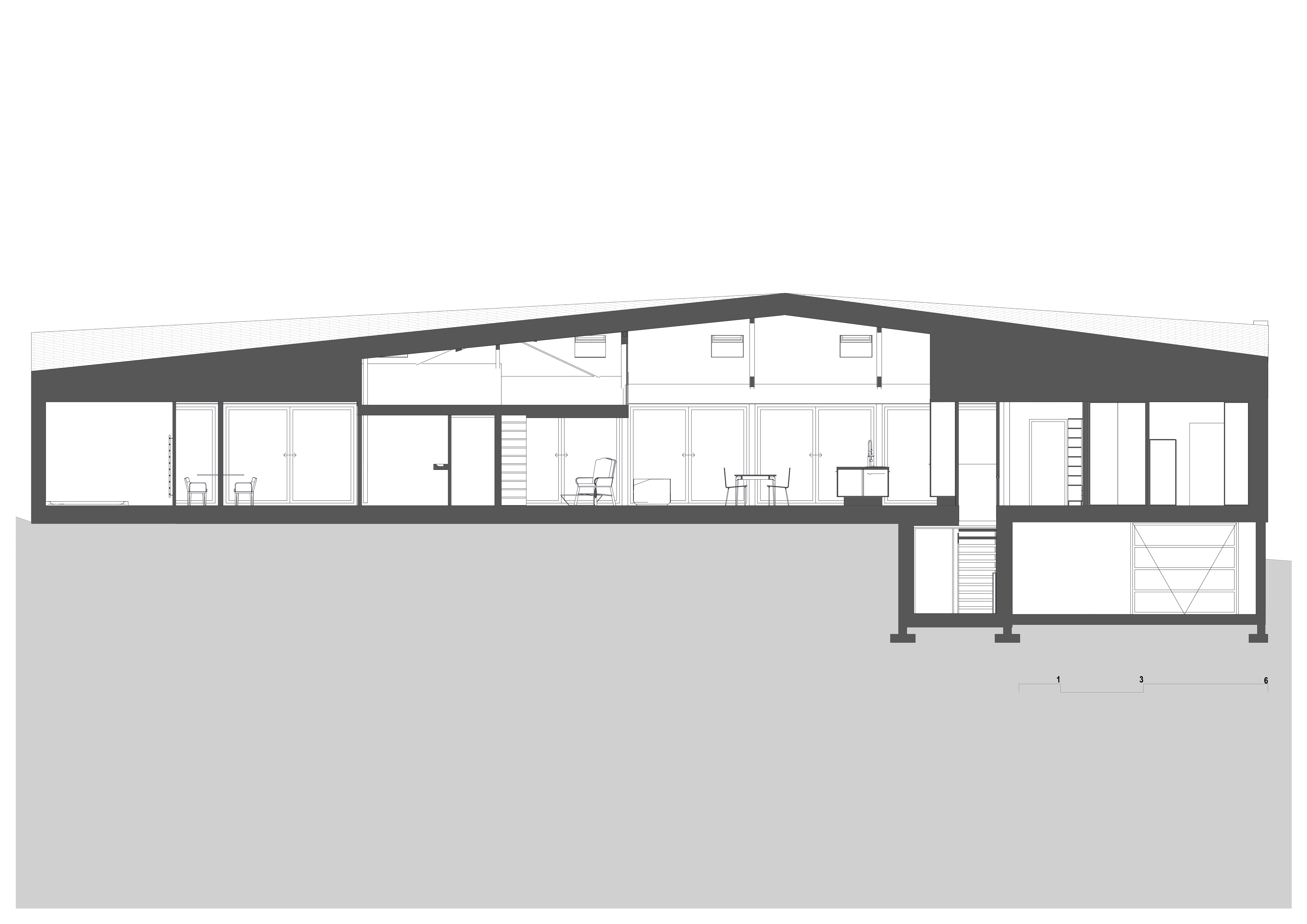 Descriptif technique : Le niveau bas; niveau de la rue est en béton et Stepoc. La dalle haute est construite sur des fondations ponctuelles pour ne pas altérer le terrain naturel. Sur ce niveau, murs et charpente sont en bois et construits selon une trame d’un peu plus de 3 m. Cette trame axe l'ensemble du programme: l'espace enfant à l’Est, l’espace de vie au centre, l’espace parental à l’ouest. La charpente asymétrique réduit l’impact du volume des limites Est/Ouest, joue du dénivelé depuis la rue, tout en assurant une double hauteur sur le séjour. La structure est entièrement revêtue d'ardoises Eternit. Marquage CE NF Maison Individuelle