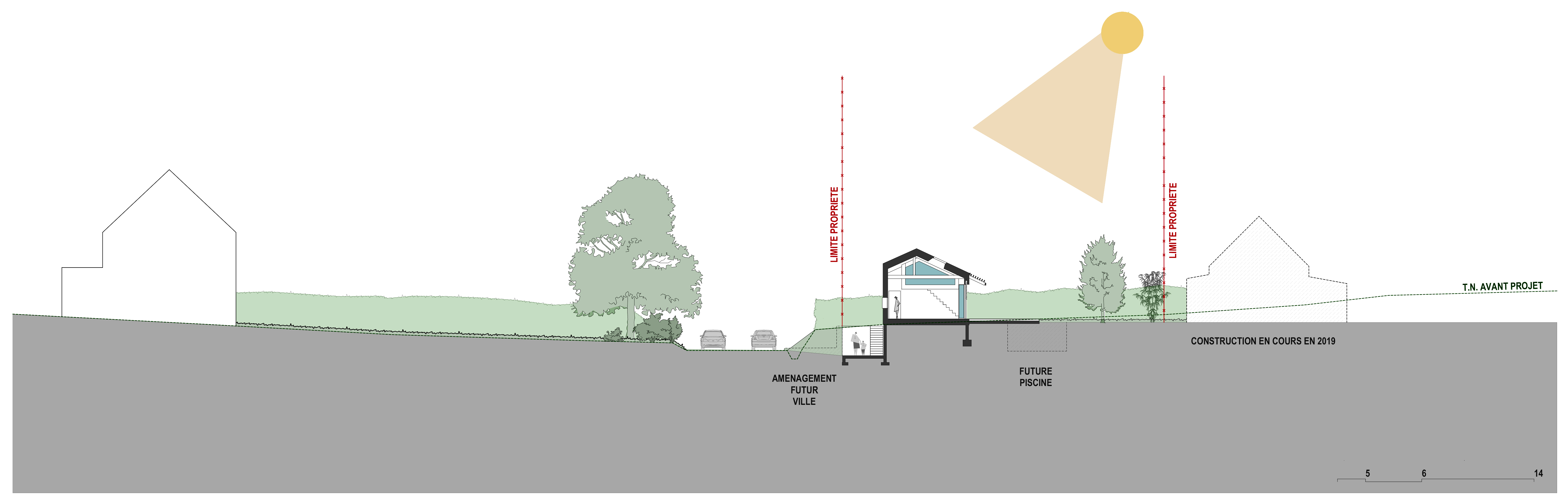 Approche environnementale : Le positionnement sur site est né de volontés multiples: dégager un jardin au sud, orienter les pièces de la maison sur celui-ci et enfin travailler avec les contraintes altimétriques du terrain naturel. La dalle basse permet de répondre au besoin d'accès et de stationnements. La dalle haute au besoin d' "habiter" dans des conditions optimales: ventilation et percements ponctuels au nord tandis que le sud est généreusement ouvert. Les apports solaires sont contrôlés par des brises soleils en bois ainsi que des BSO sur chaque baies. La maison est RT 2012, classé A et B en GES.