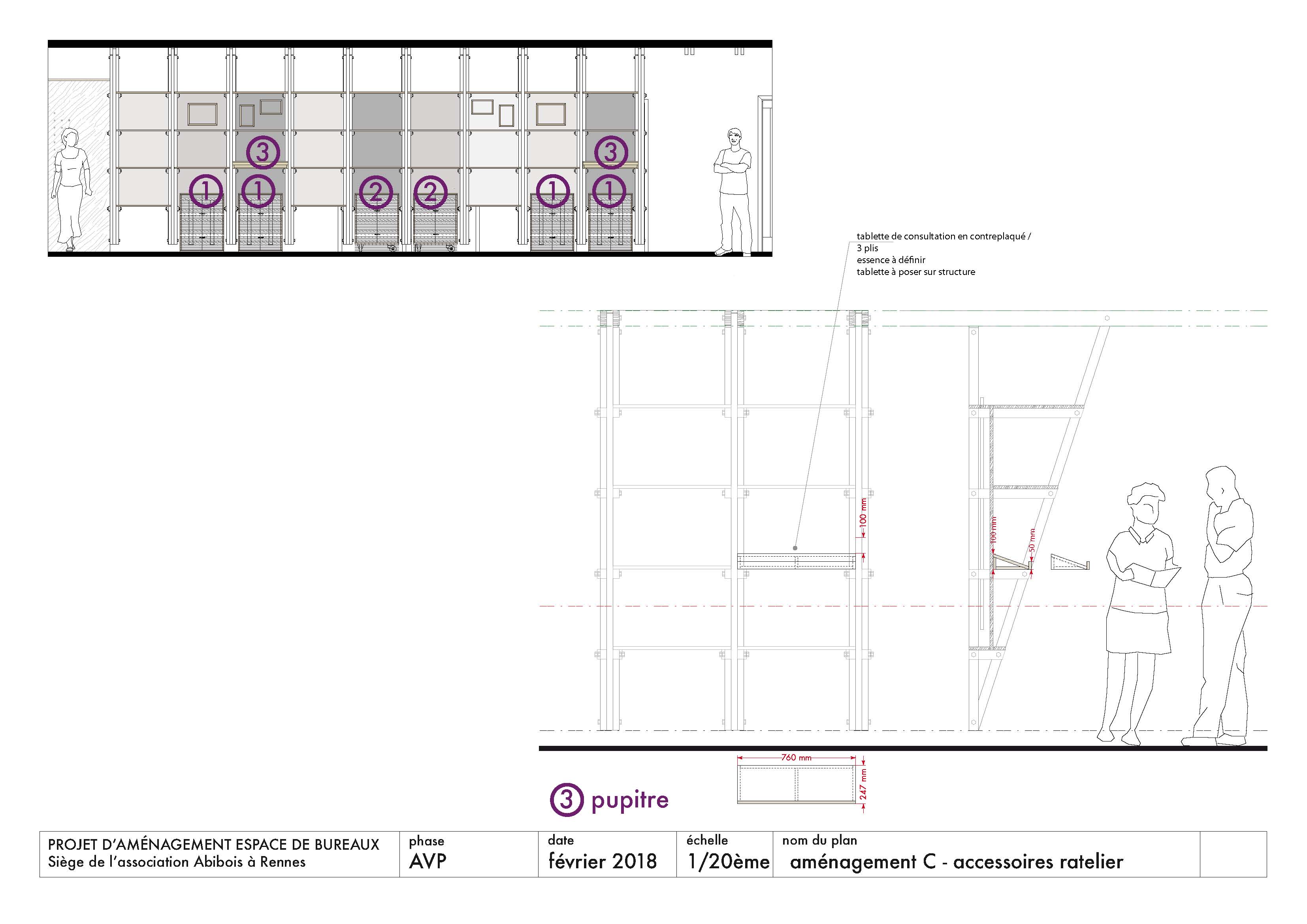 Descriptif technique de l'aménagement : Au Coeur du Bois est un outil de démonstration de la valorisation des essences bretonnes en construction et aménagement intérieur. Vitrine régionale de la filière en terme de produits, d'essences de bois et de savoir-faire, les aménagements réalisés répondent au besoin des collaborateurs en terme d'usage mais traduisent aussi les métiers du bois : charpente avec les structures bois qui servent de cloisonnements, de calepinage au plafond ou de ratelier. Menuiserie avec le mobilier, les techniques de parquets ou les aménagements périphériques. L'emballage avec les luminaires en cagette.