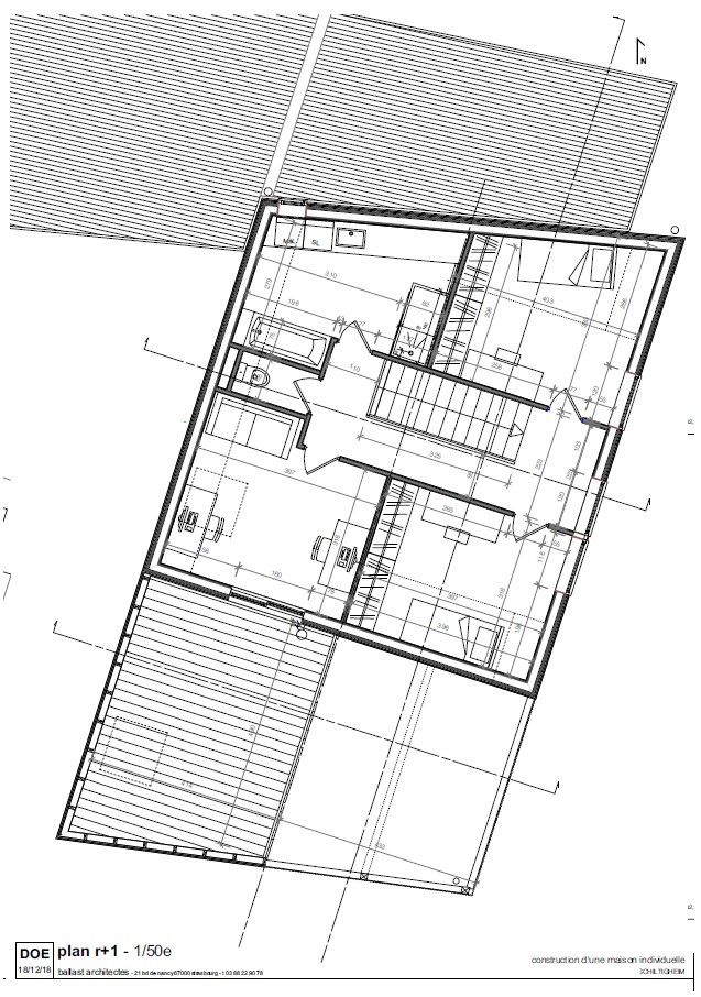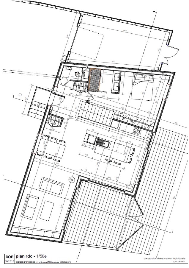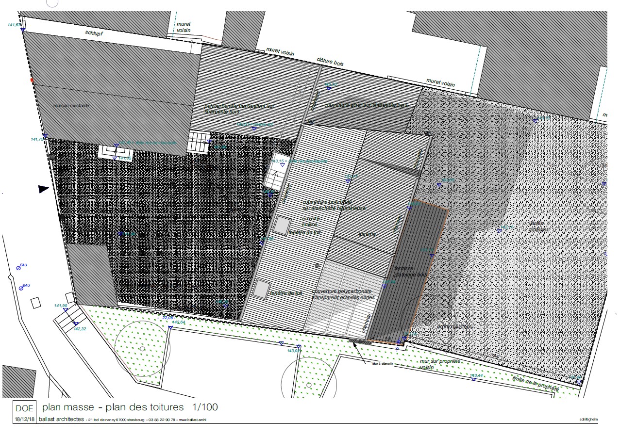 Le projet prend place dans un quartier dense d'anciennes maisons alsaciennes. Il vient remplacer une ancienne grange très dégradée, dont il reprend l'implantation. Constituée d'un unique corps de bâti, la maison présente une façade pleine vers la cour et la rue et protège le jardin en cœur d'îlot, au Sud-Est. Le volume est habillé de lames de bois brûlé, en façade et en toiture, et il comporte un angle pleinement transparent et lumineux. La serre laisse apparaître la structure en bois naturel, et se développe sur 2 niveaux, créant un volume chaleureux, tant intérieur qu'ouvert sur le ciel.