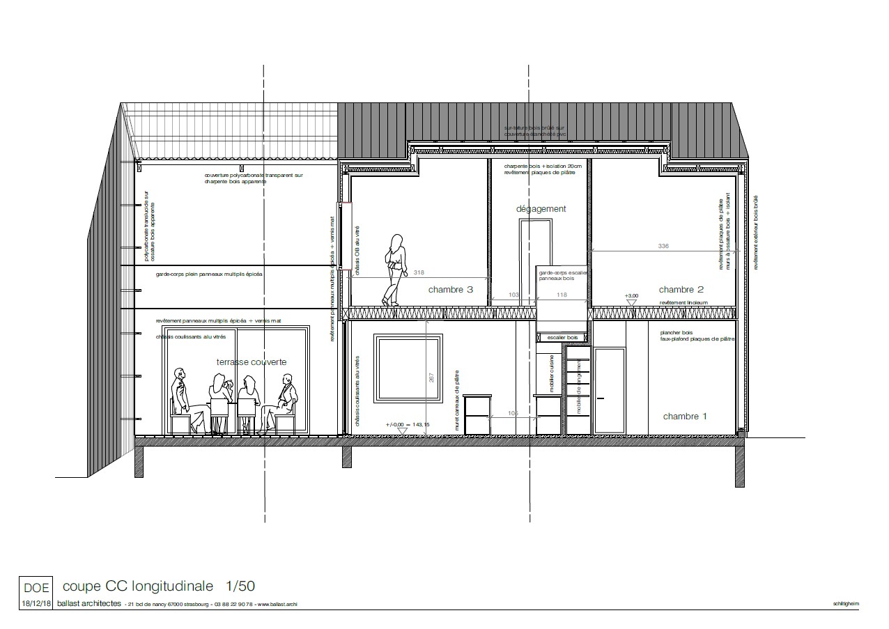 Descriptif technique : Soubassement (fondations, murs et dalle RdC) en béton armé, avec vide sanitaire fortement isolé. Murs à ossature bois, plancher bois, charpente bois. Isolation murs et charpente en ouate de cellulose insufflée. Bardage extérieur en lames de douglas brûlé, brossé et huilé en façades et toiture. Menuiseries aluminium laqué, double vitrage. Serre en polycarbonate simple peau sur charpente bois. Finitions intérieures des rampants de toiture en panneaux trois plis d'épicéa non traités. Ensemble Escalier/Cuisine en trois plis de bouleau huilés, plans de travail en lamellé de hêtre.