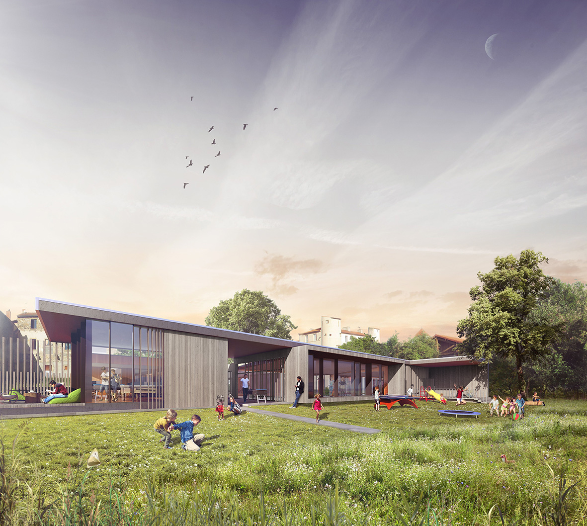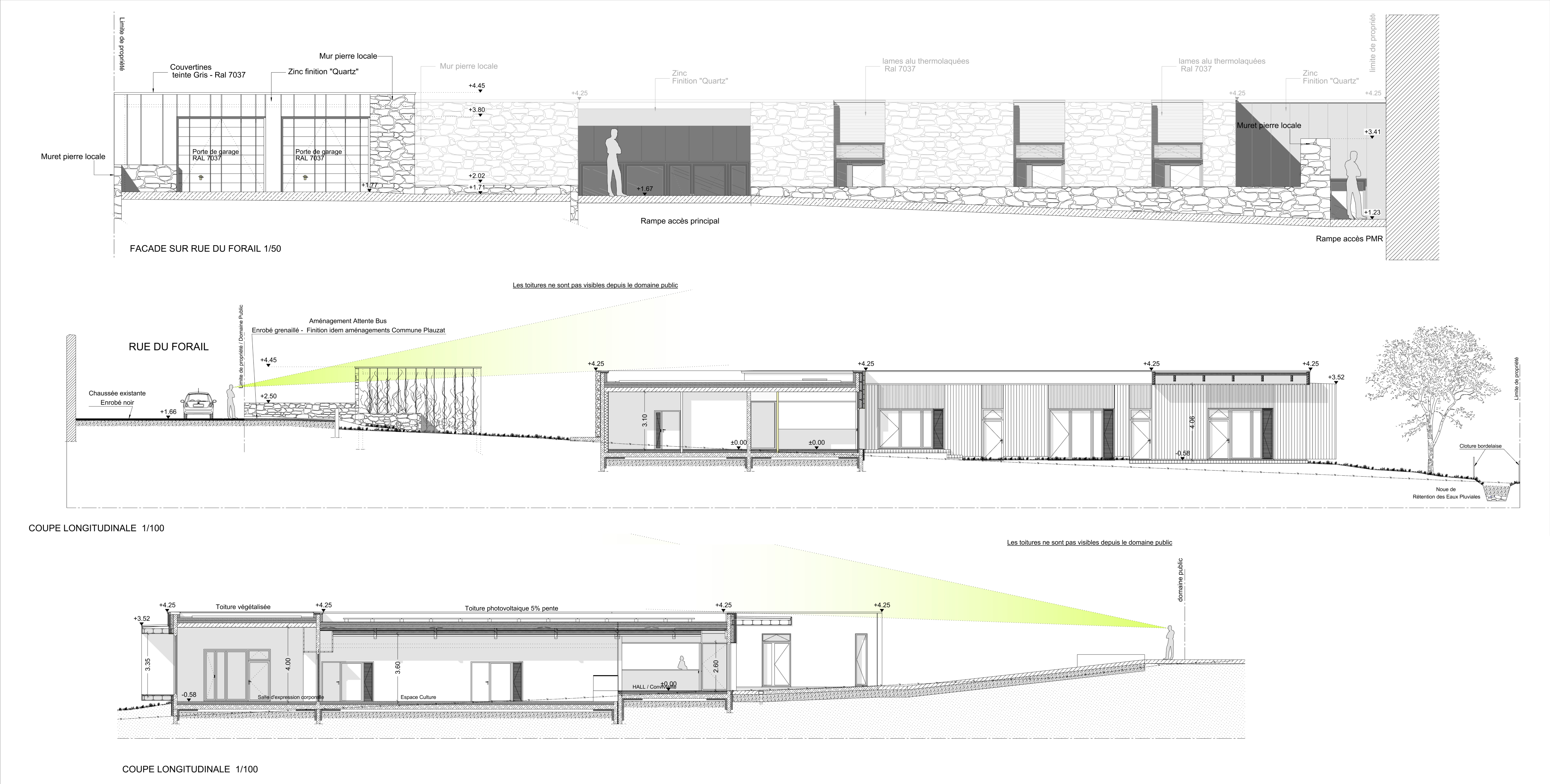 Note démarche s'inscrit dans la volonté d'une architecture exemplaire au titre environnemental et au titre fonctionnel, dans le respect du site. La conception architecturale et environnementale ont fait l'objet d'une réflexion assurément entrelacée. Nous avons fait le choix de l'expression de matériaux locaux et présents dans l'environnement proche, le bois et la pierre, d'une volumétrie générale sobre et intégrée dans son environnement. Depuis la rue jusqu'à la salle d'expressions corporelle une fluidité des parcours nous amène au grand paysage élément majeur du site.