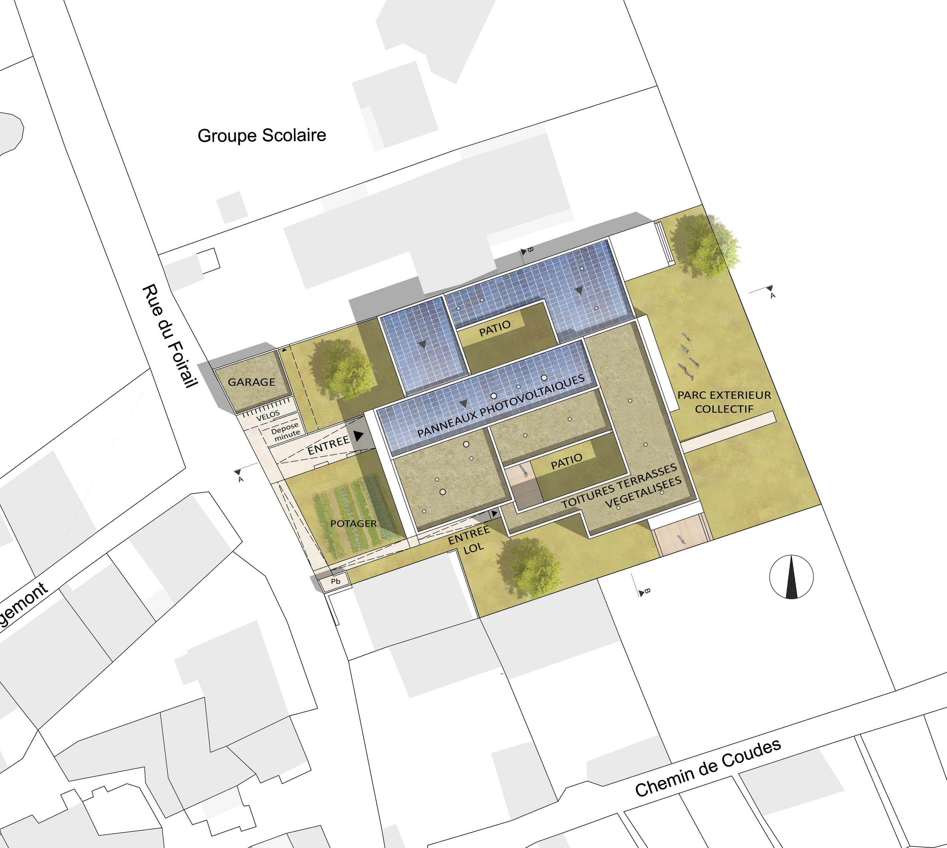 Descriptif technique : Après avoir créé une enveloppe thermique performante, le choix des équipements a été fait pour réduire encore les consommations en énergie du projet. Les choix énergétiques retenus répondent aux triples objectifs suivants : • Minimiser les coûts de maintenance. • Présenter une efficacité optimale et pérenne. • Minimiser les consommations en énergie primaire. Les matériaux sont sélectionnés pour leur durabilité et leur faible besoin de maintenance. Le système de ventilation naturelle est un système simple qui demande peu d’entretien. Niveau BEPOS Effinergie.