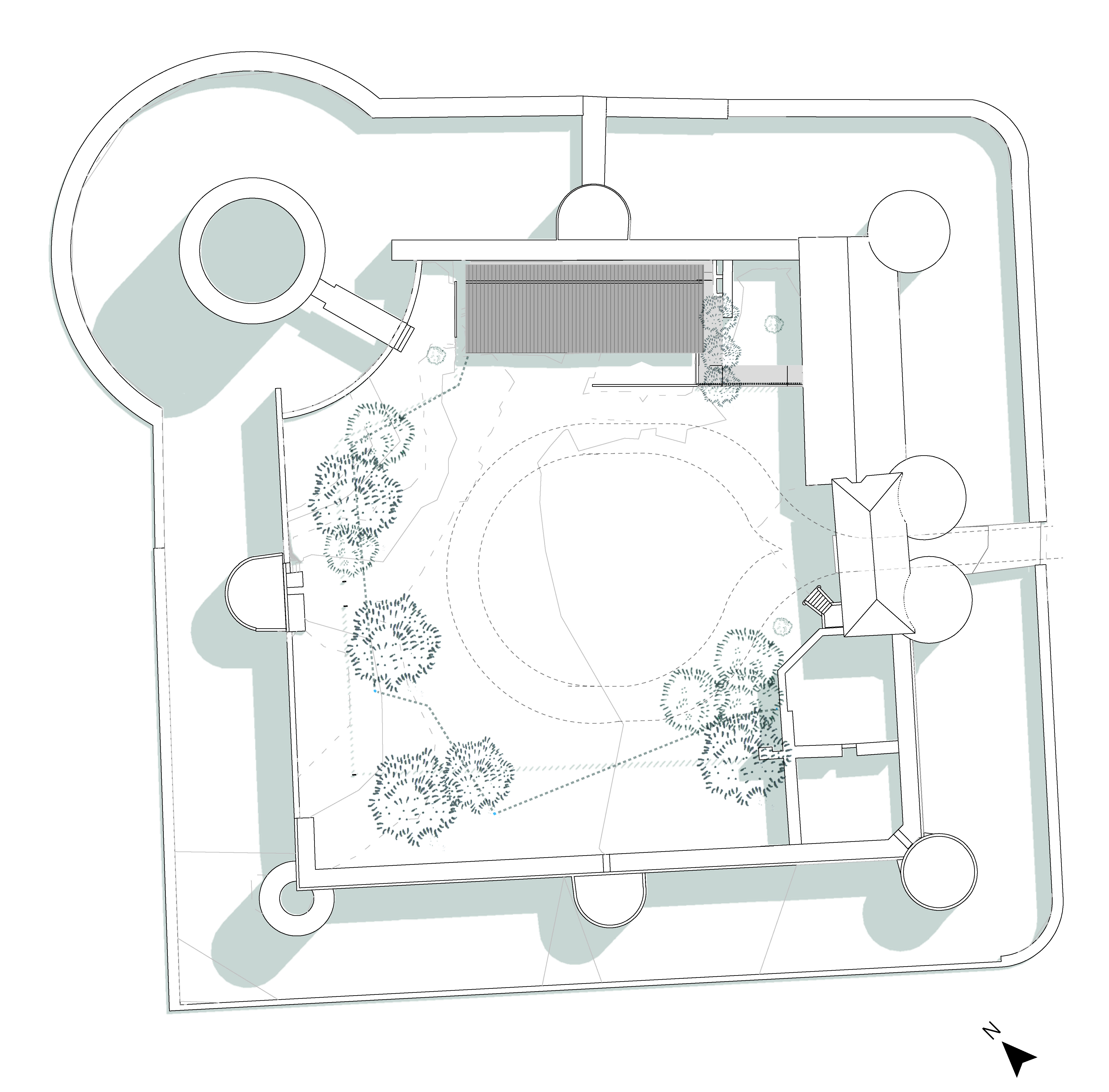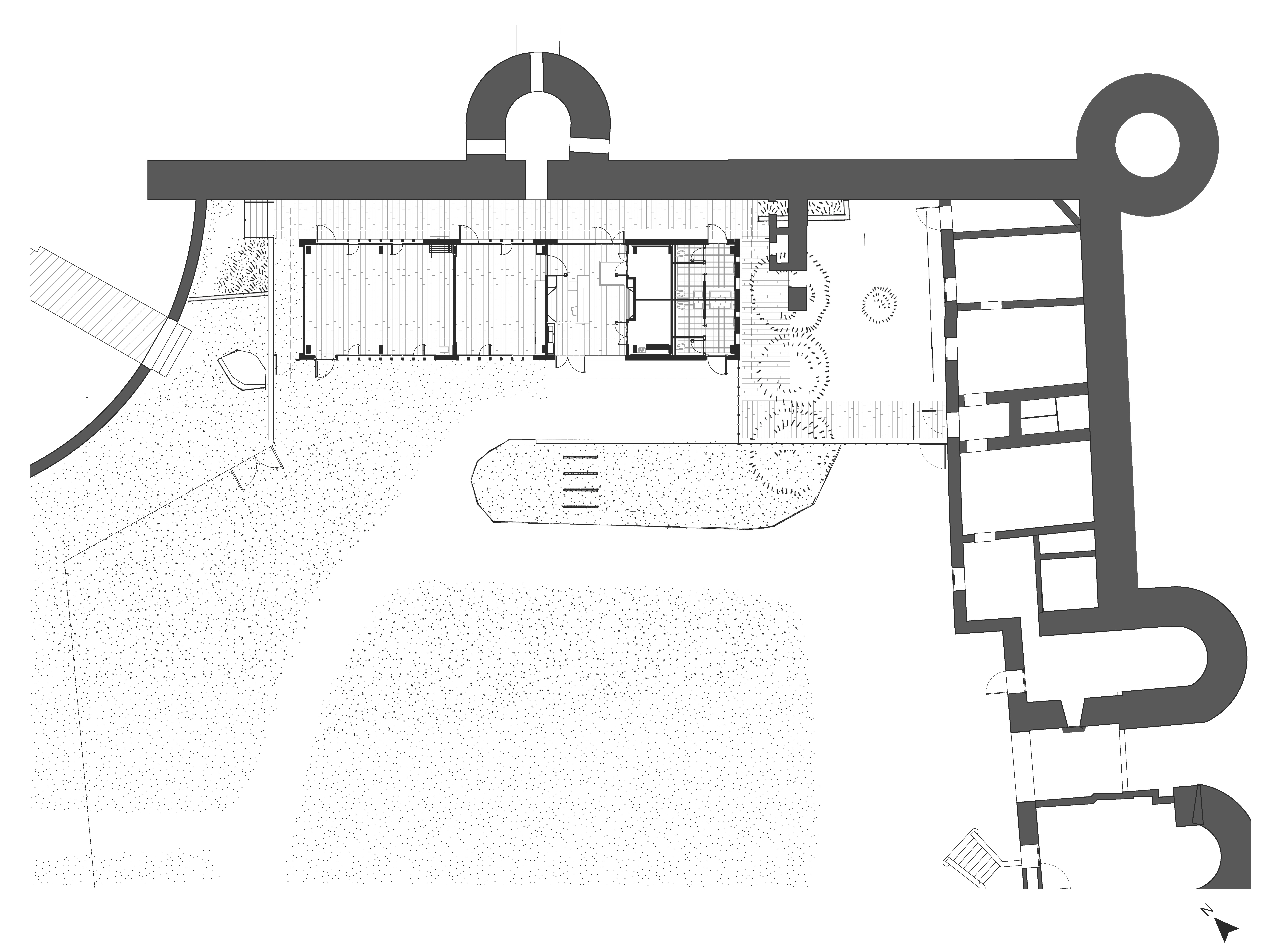 Descriptif technique : La construction dans la cour permet de repenser complètement l’espace public. Il nous a semblé important d’accorder une unité et une qualité matérielle à l’intervention. Nous avons choisi une ossature bois avec bardage en mélèze pré-grisé et couverture en zinc couleur cuivrée. Le bois permet : • une construction légère et réversible sur pieux vissés à 80cm pour la préservation du sous-sol archéologique, • Une matérialité sobre et naturelle pour laisser primer à la maçonnerie médiévale. • Une réinterprétation d’un matériau traditionnel, souvent utilisé au Moyen-Âge en relation avec la pierre