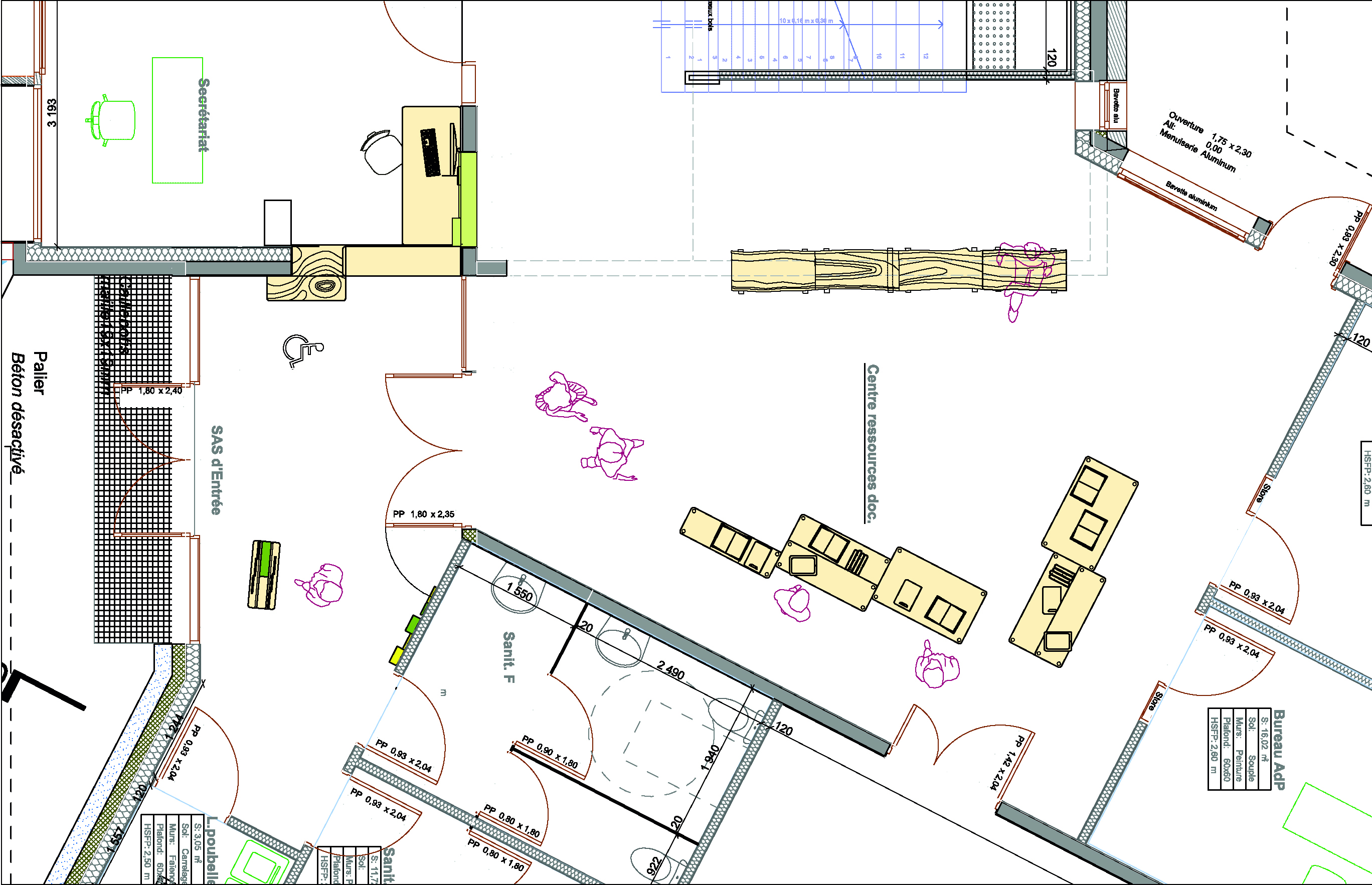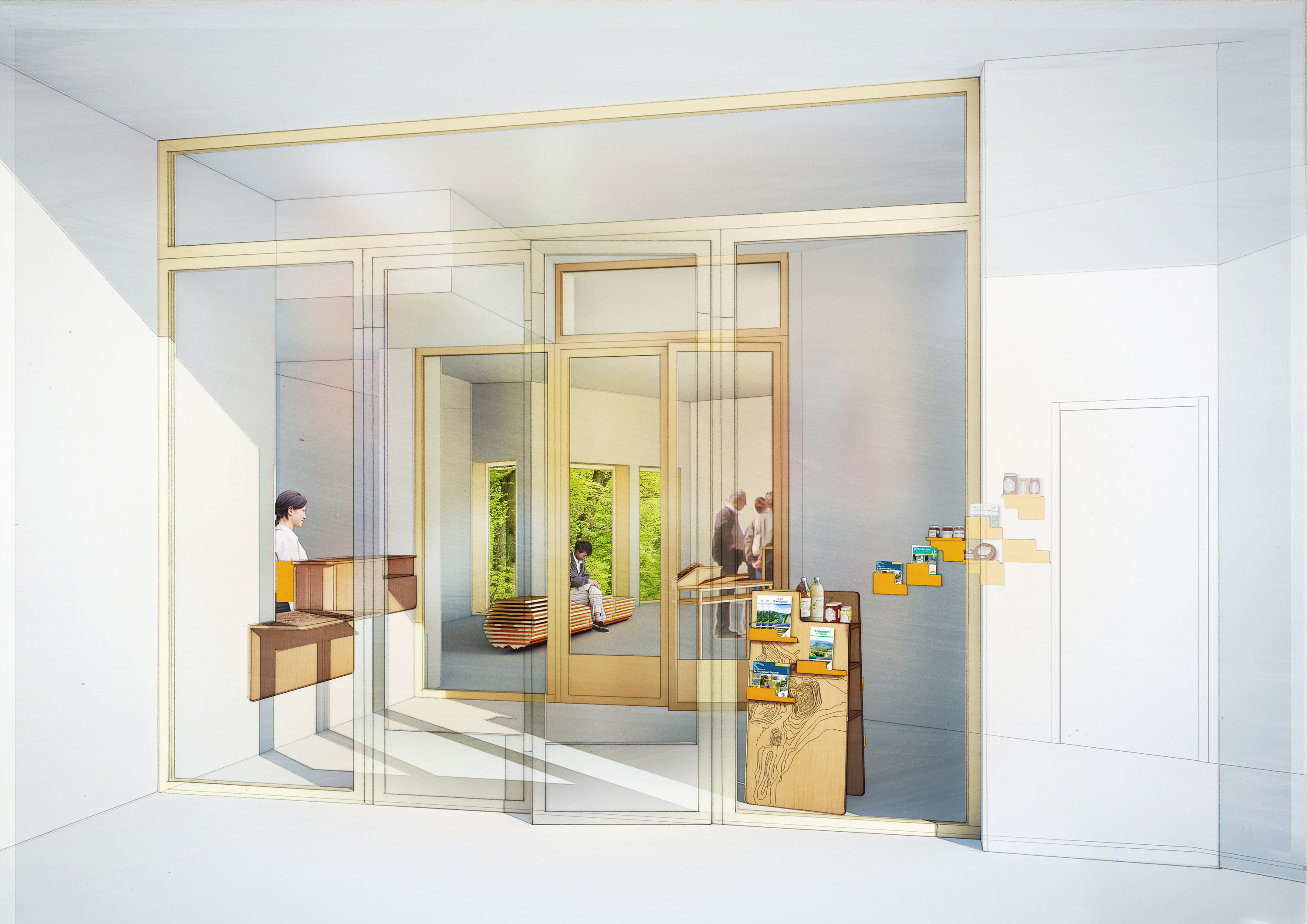 Le programme porte sur l’aménagement de l’espace d’entrée, du bureau de la personne d’accueil et de la salle de documentation de la Maison du Parc Naturel des Ardennes. Il s’agissait d’utiliser la diversité des essences de bois présentes sur le territoire du Parc, notamment le chêne massif, le hêtre et le contreplaqué de bouleau. Le dessin des mobilier s'adapte aux essences présentées.