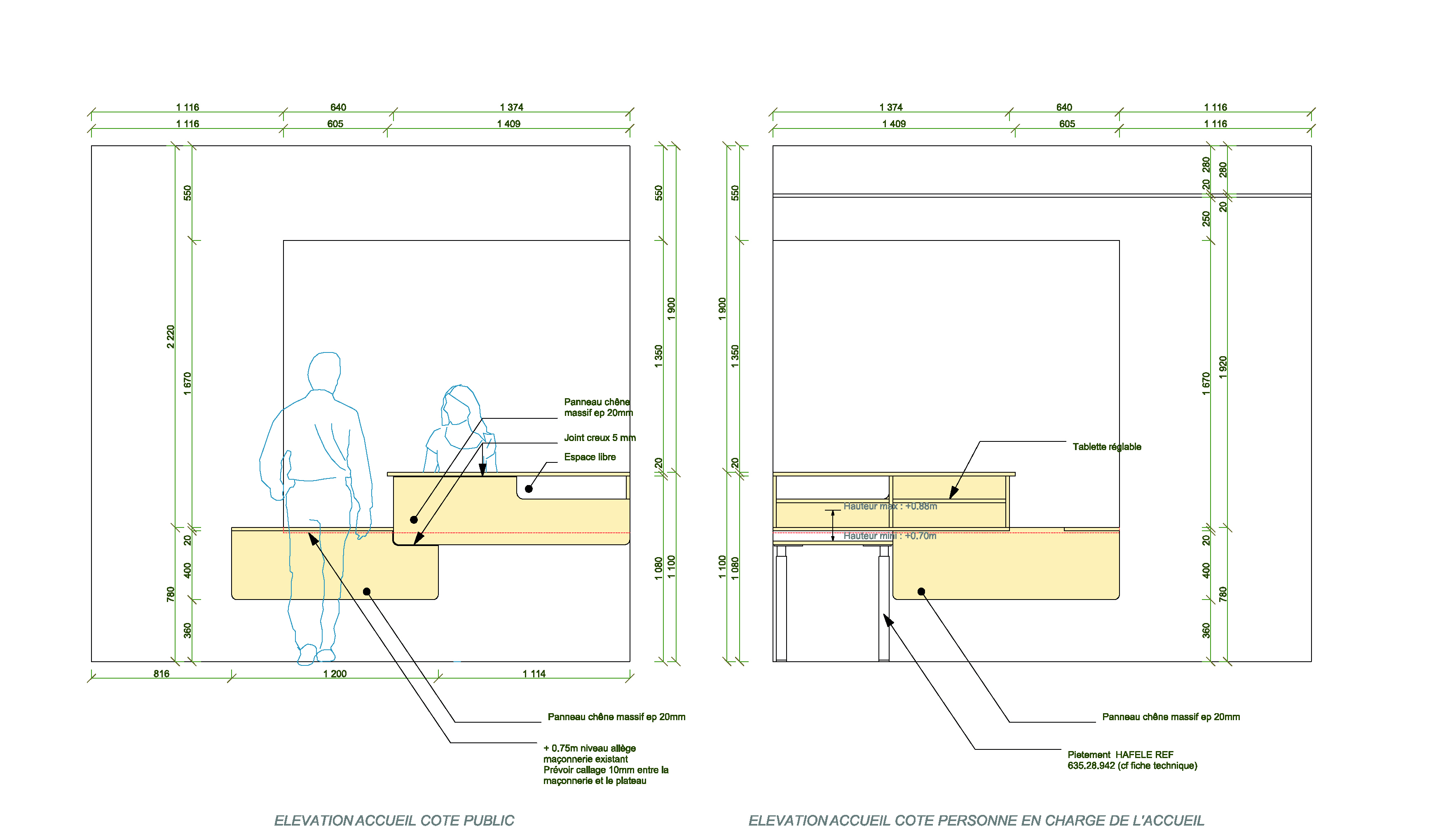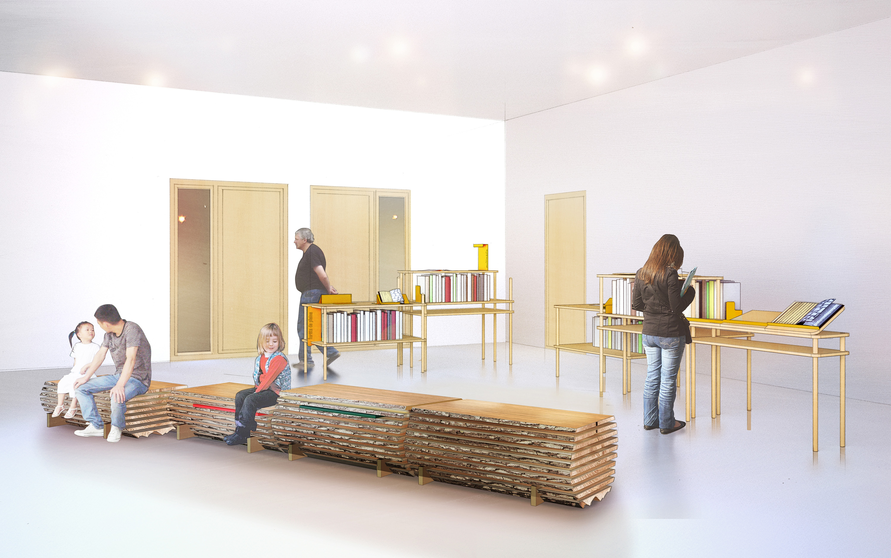 Descriptif technique de l'aménagement : La banque d’accueil est composée de deux plateaux en chêne à des hauteurs différentes pour répondre aux usages. L’un des plateaux est gravé de la carte du Parc. Les présentoirs sont dédiés à la présentation des différents ouvrages consacrés à la forêt, au bois, à la faune, la flore, au paysage. Ils sont réalisés en contreplaqué de hêtre et en hêtre massif. Des lutrins en aciers thermolaqués sont positionnés sur les tables pour mettre en valeur un ouvrage particulier. Les assises reprennent l’esprit d’un plot de bois. Quatre modules d’un mètre de large en chêne massif sur roulettes permettent de moduler l’espace. Des petits tiroirs et tablettes sont insérés dans les vides entre les plateaux.