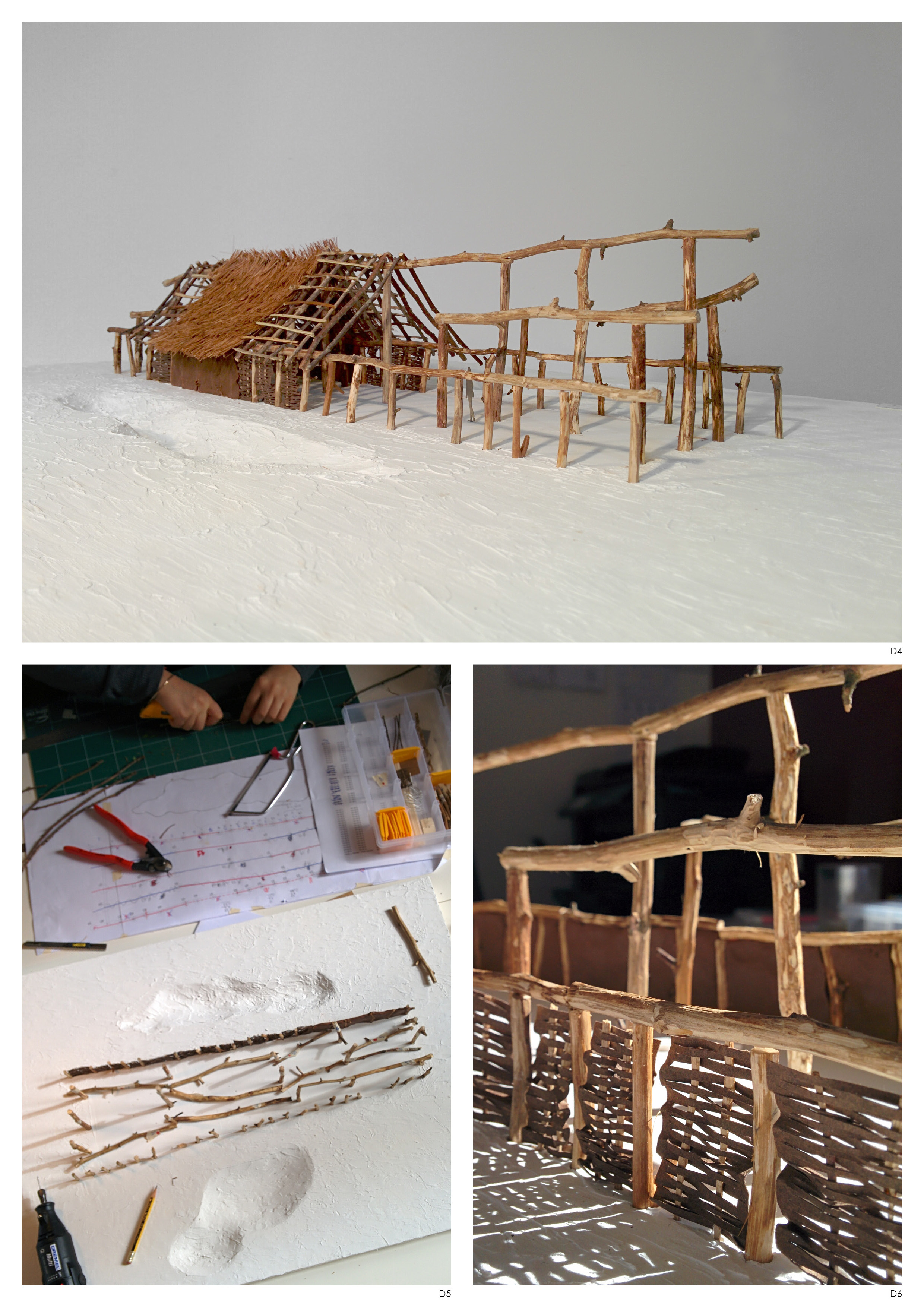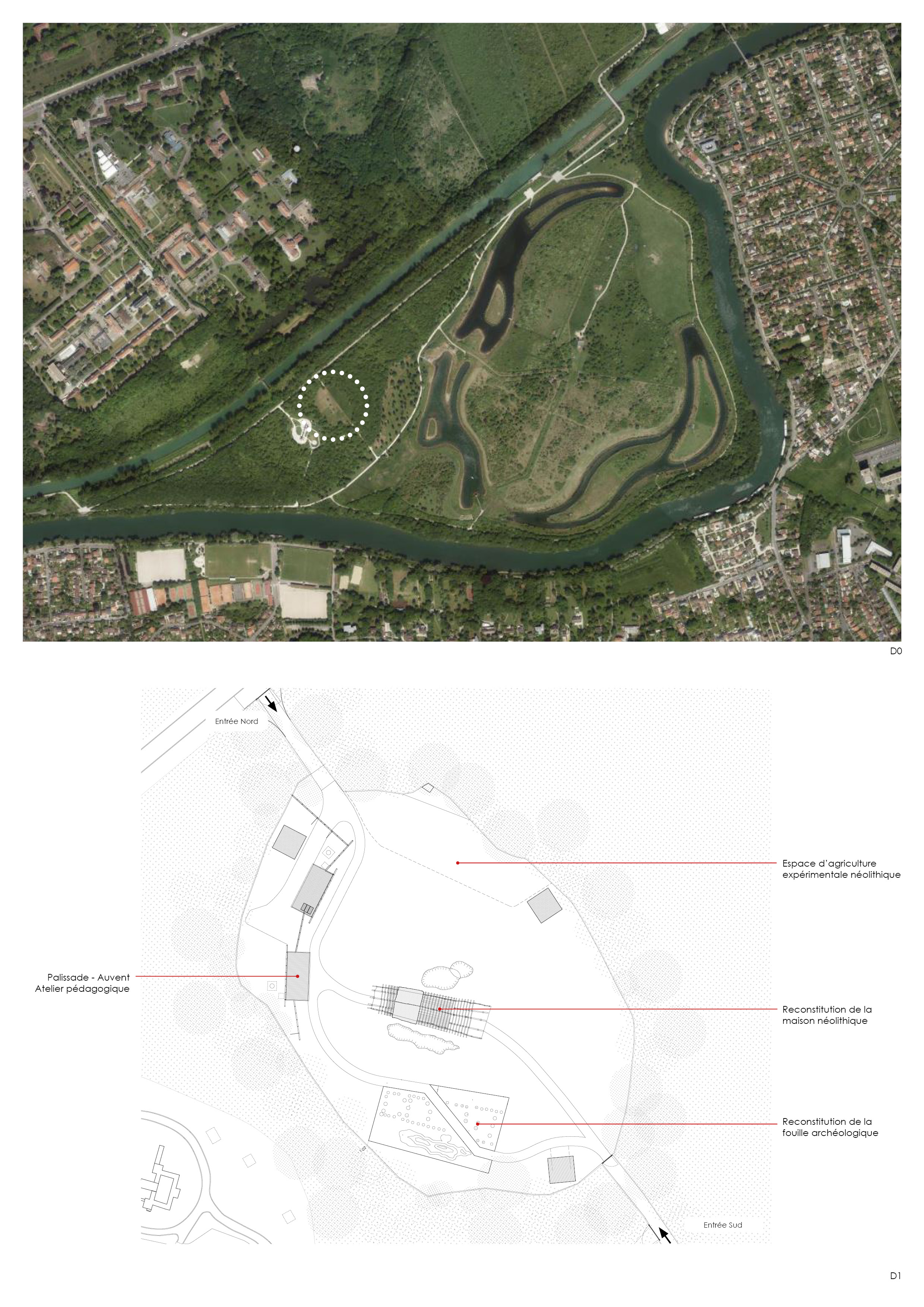 La reconstitution de la maison néolithique présente le volume général de la construction dans un état inachevé, un écorché décrivant les dispositifs constructifs de l'architecture néolithique (bois non traités: acacia, châtaigner, noisetier), chaume, ligatures végétales, argile, paille...). La grande palissade contemporaine borde la lisière de la clairière et intègre deux auvents qui accueillent des activités pédagogiques. Elle est constituée d'une structure en douglas et d'un bardage de ganivelles de châtaigner qui filtrent le regard et qui s'inscrivent dans le traitement paysager du parc.